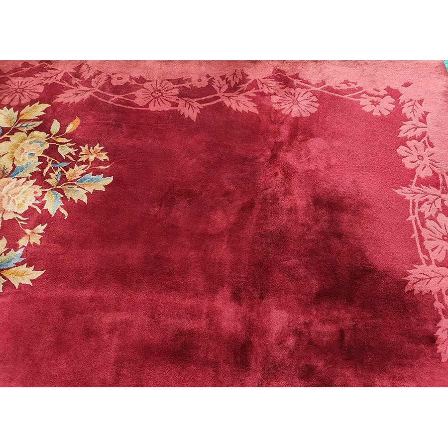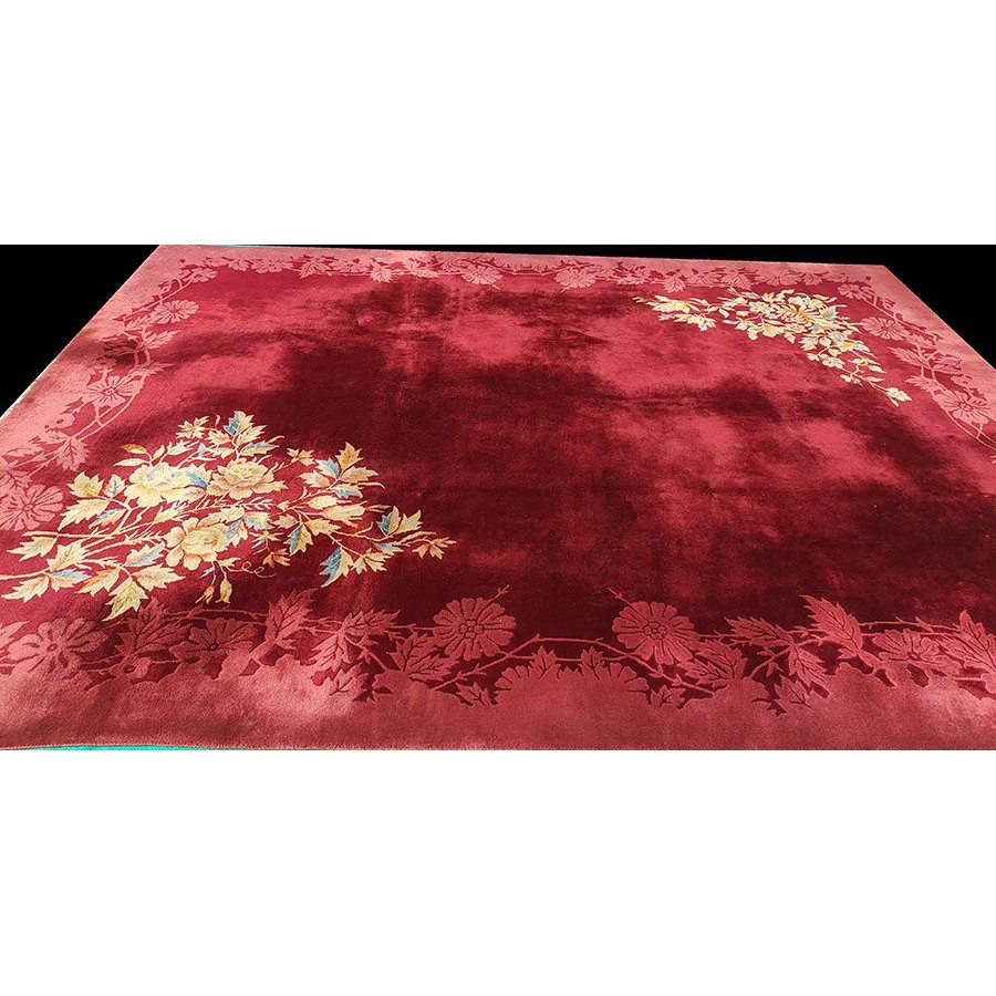 DescriptionChineseCarpets made in China proper. See entries Ningshia, Peking, Art Deco. Chinese - Art DecoAs the name implies, pieces woven between the wars for the Western market by mostly American owned firms especially Nichols and Fette, in thick heavy weaves using strong colors, asymmetric patterns and downplaying the Chinese-ness of the carpet. Nichols rugs are more strong toned than the pastel Fette. Most were woven in the coastal port city of Tientsin. Other lesser known workshops were also active. Some pieces are ultra-geometric and haute-Deco moderne in character: these are very rare. More frequent are pieces with bits of Chinese ornament: vases or other precious objects, paeonies, vines, fences, etc. Most common is the 9 x 12 size, in colors never found in mainstream Chinese rugs: backgrounds in black, mauve, purple, hot pink, orange, olive, employing the best synthetic chrome dyes of the period. Prices are still reasonable and carpets in top condition are available. | |