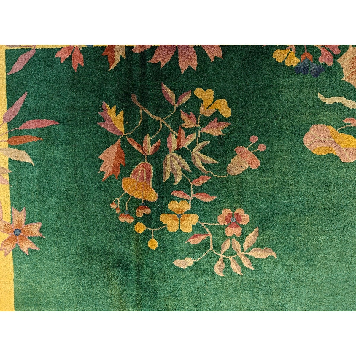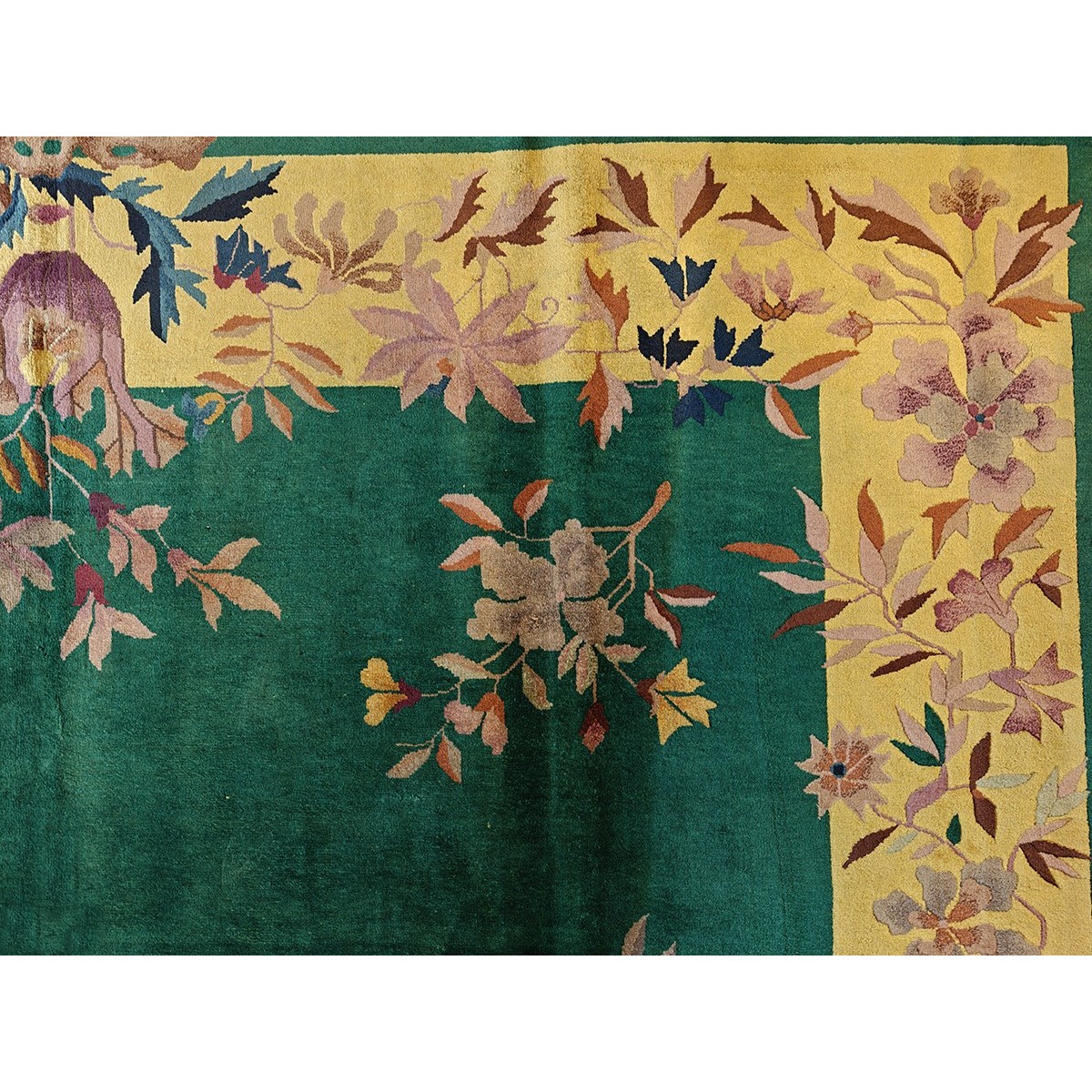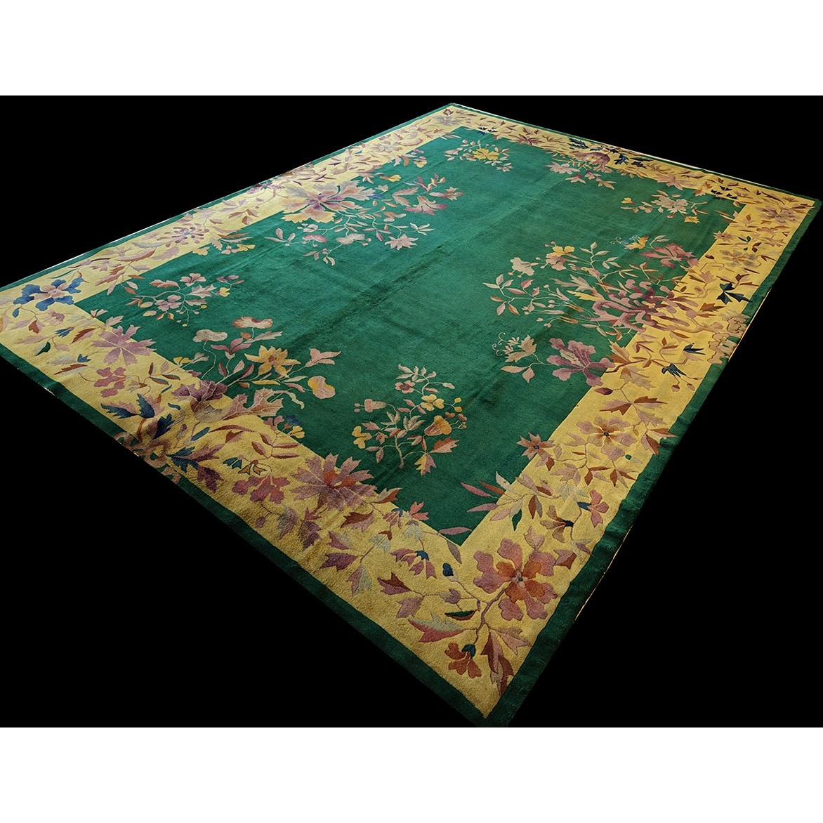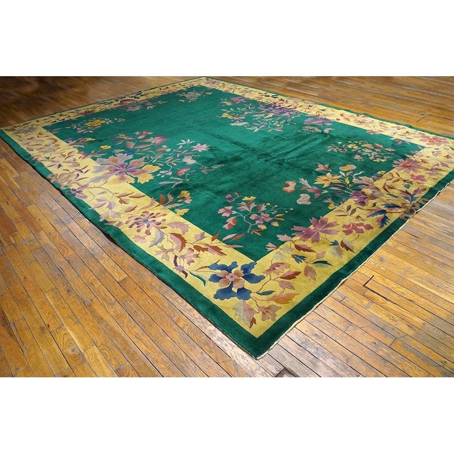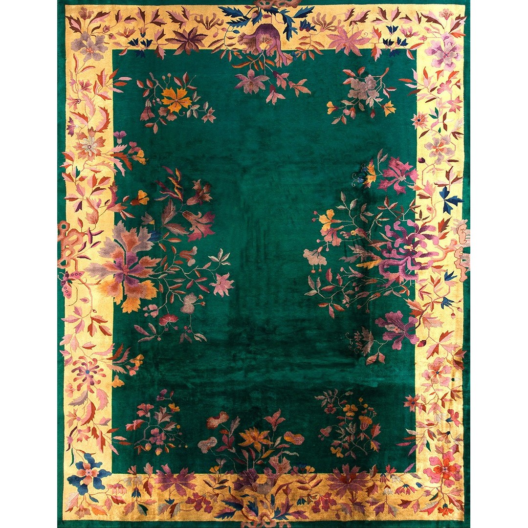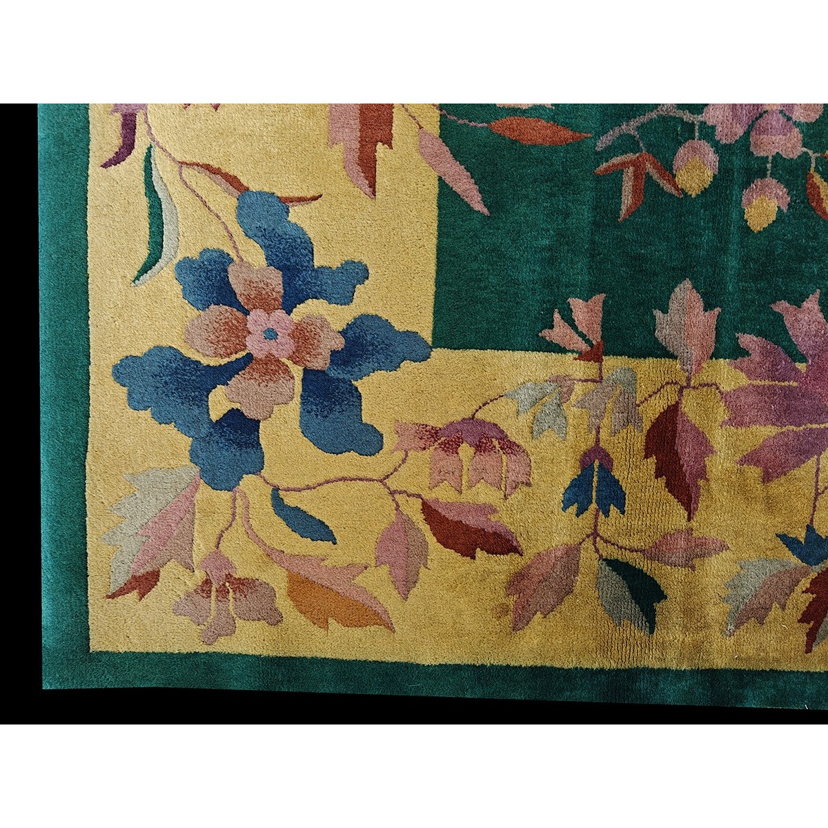 DescriptionChineseCarpets made in China proper. See entries Ningshia, Peking, Art Deco. Chinese - Art DecoAs the name implies, pieces woven between the wars for the Western market by mostly American owned firms especially Nichols and Fette, in thick heavy weaves using strong colors, asymmetric patterns and downplaying the Chinese-ness of the carpet. Nichols rugs are more strong toned than the pastel Fette. Most were woven in the coastal port city of Tientsin. Other lesser known workshops were also active. Some pieces are ultra-geometric and haute-Deco moderne in character: these are very rare. More frequent are pieces with bits of Chinese ornament: vases or other precious objects, paeonies, vines, fences, etc. Most common is the 9 x 12 size, in colors never found in mainstream Chinese rugs: backgrounds in black, mauve, purple, hot pink, orange, olive, employing the best synthetic chrome dyes of the period. Prices are still reasonable and carpets in top condition are available. | |