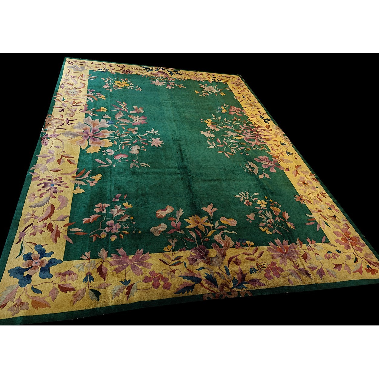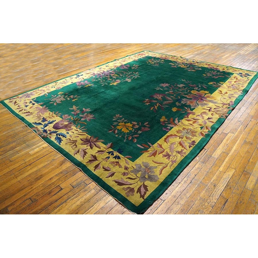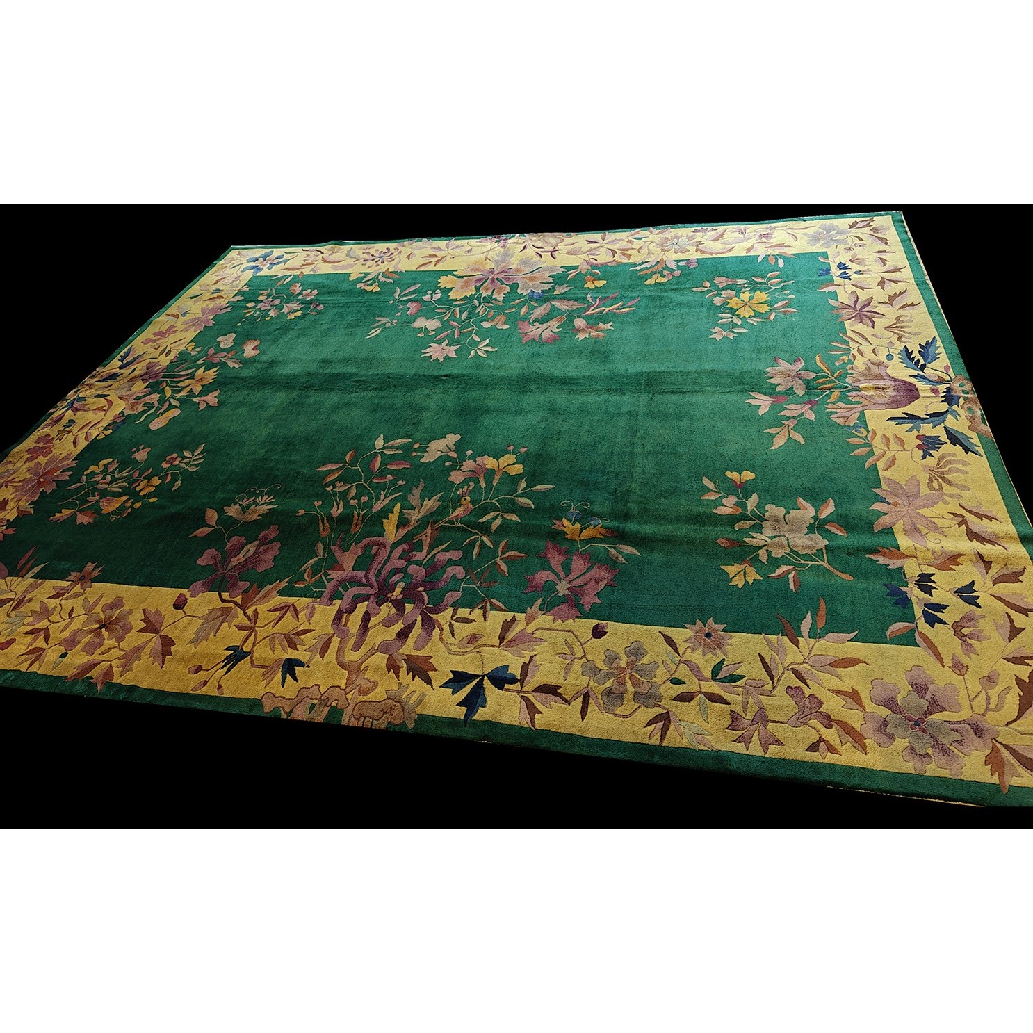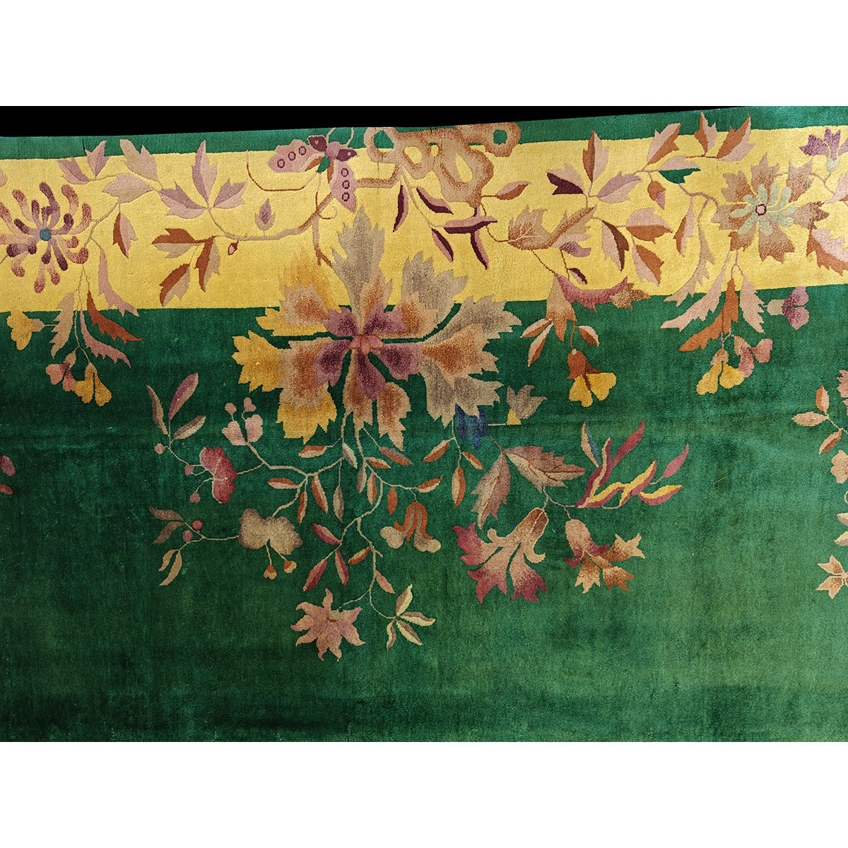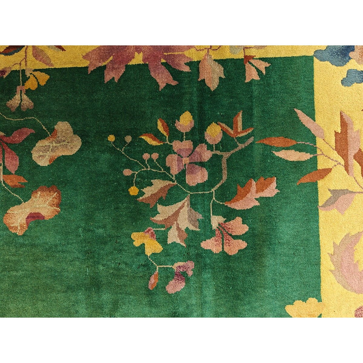 DescriptionChineseCarpets made in China proper. See entries Ningshia, Peking, Art Deco. Chinese - Art DecoAs the name implies, pieces woven between the wars for the Western market by mostly American owned firms especially Nichols and Fette, in thick heavy weaves using strong colors, asymmetric patterns and downplaying the Chinese-ness of the carpet. Nichols rugs are more strong toned than the pastel Fette. Most were woven in the coastal port city of Tientsin. Other lesser known workshops were also active. Some pieces are ultra-geometric and haute-Deco moderne in character: these are very rare. More frequent are pieces with bits of Chinese ornament: vases or other precious objects, paeonies, vines, fences, etc. Most common is the 9 x 12 size, in colors never found in mainstream Chinese rugs: backgrounds in black, mauve, purple, hot pink, orange, olive, employing the best synthetic chrome dyes of the period. Prices are still reasonable and carpets in top condition are available. | |