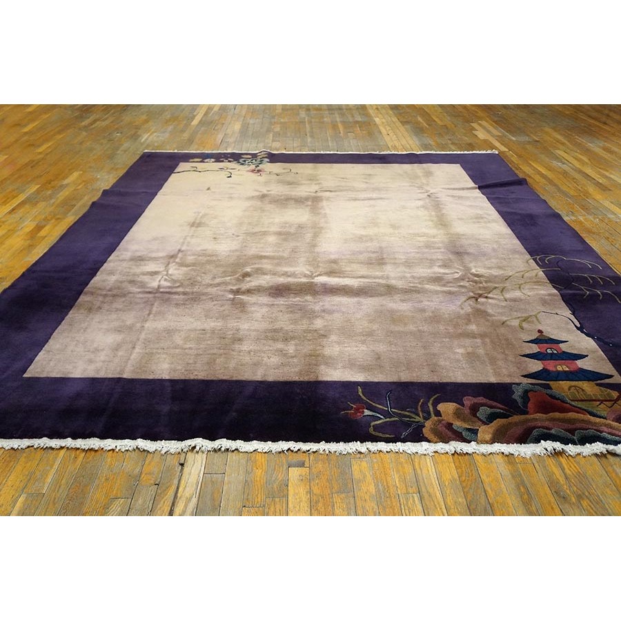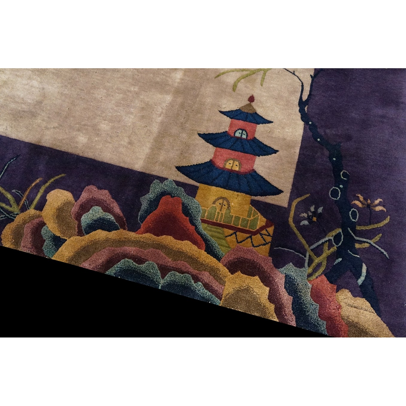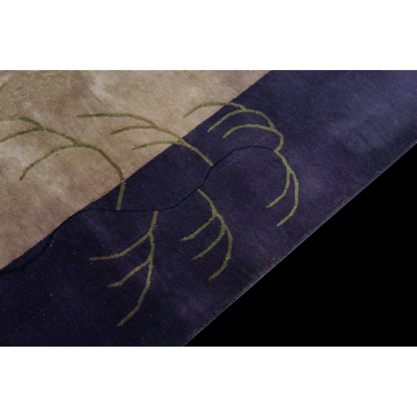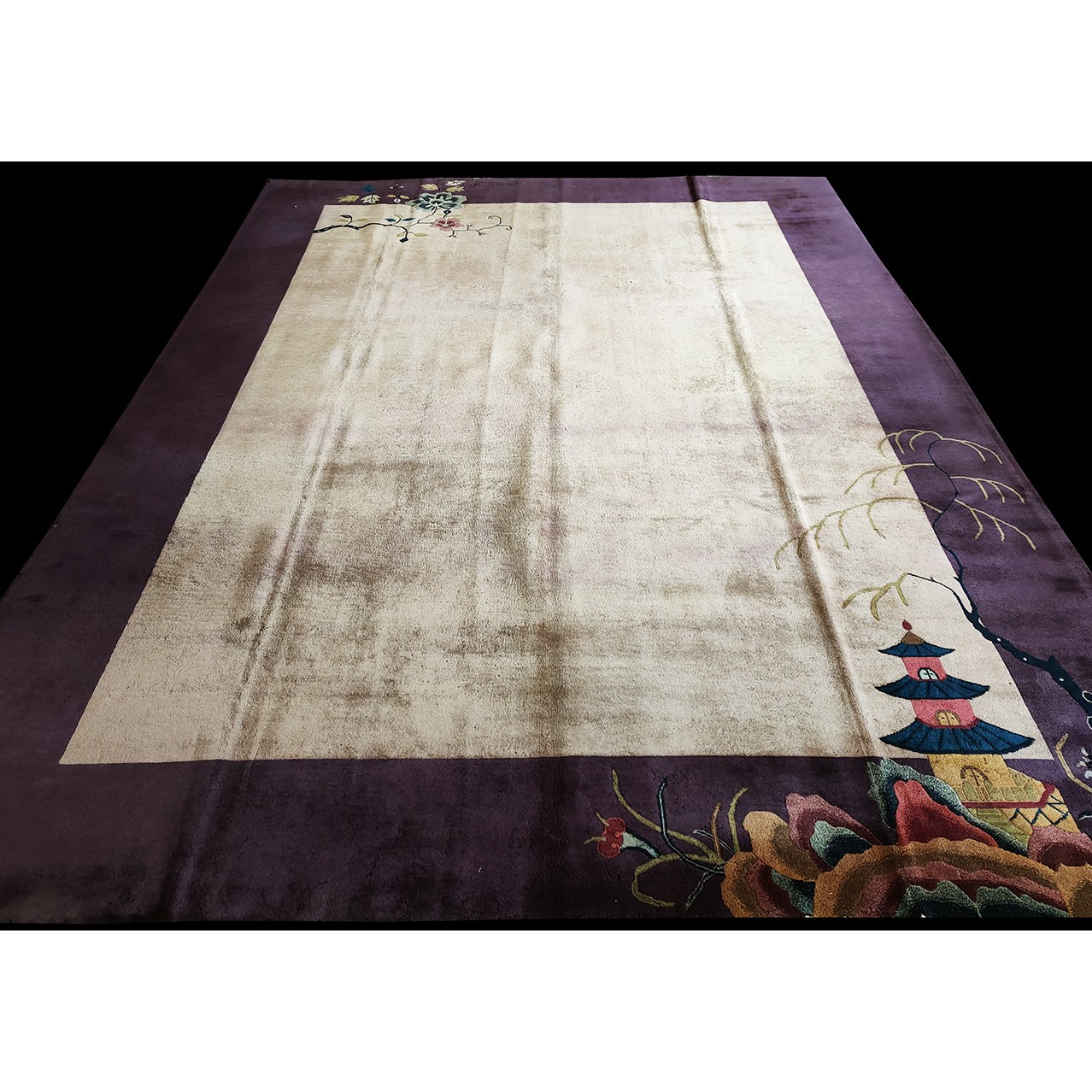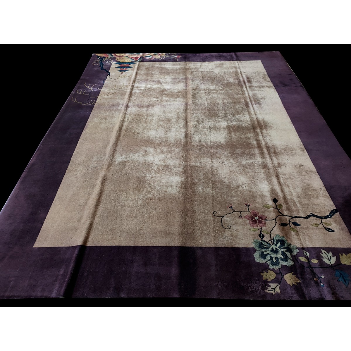 DescriptionChineseCarpets made in China proper. See entries Ningshia, Peking, Art Deco. Chinese - Art DecoAs the name implies, pieces woven between the wars for the Western market by mostly American owned firms especially Nichols and Fette, in thick heavy weaves using strong colors, asymmetric patterns and downplaying the Chinese-ness of the carpet. Nichols rugs are more strong toned than the pastel Fette. Most were woven in the coastal port city of Tientsin. Other lesser known workshops were also active. Some pieces are ultra-geometric and haute-Deco moderne in character: these are very rare. More frequent are pieces with bits of Chinese ornament: vases or other precious objects, paeonies, vines, fences, etc. Most common is the 9 x 12 size, in colors never found in mainstream Chinese rugs: backgrounds in black, mauve, purple, hot pink, orange, olive, employing the best synthetic chrome dyes of the period. Prices are still reasonable and carpets in top condition are available. | |