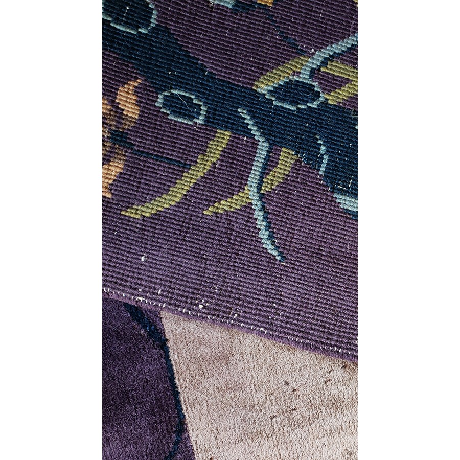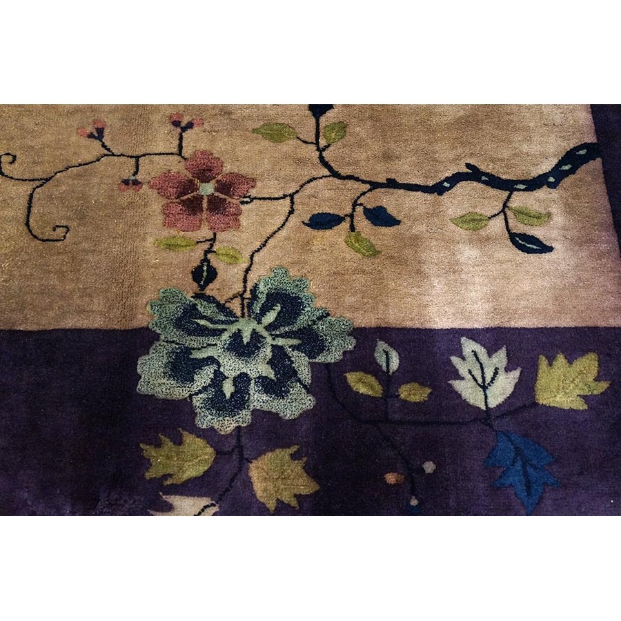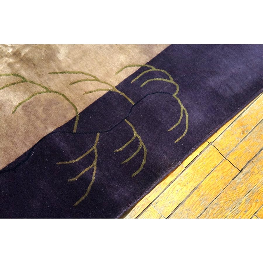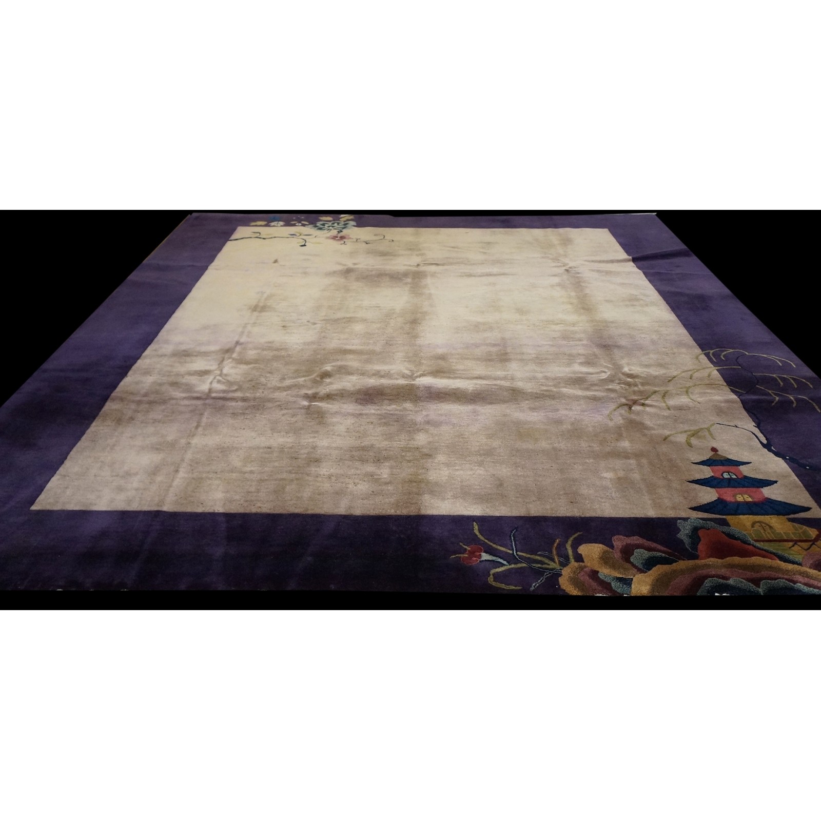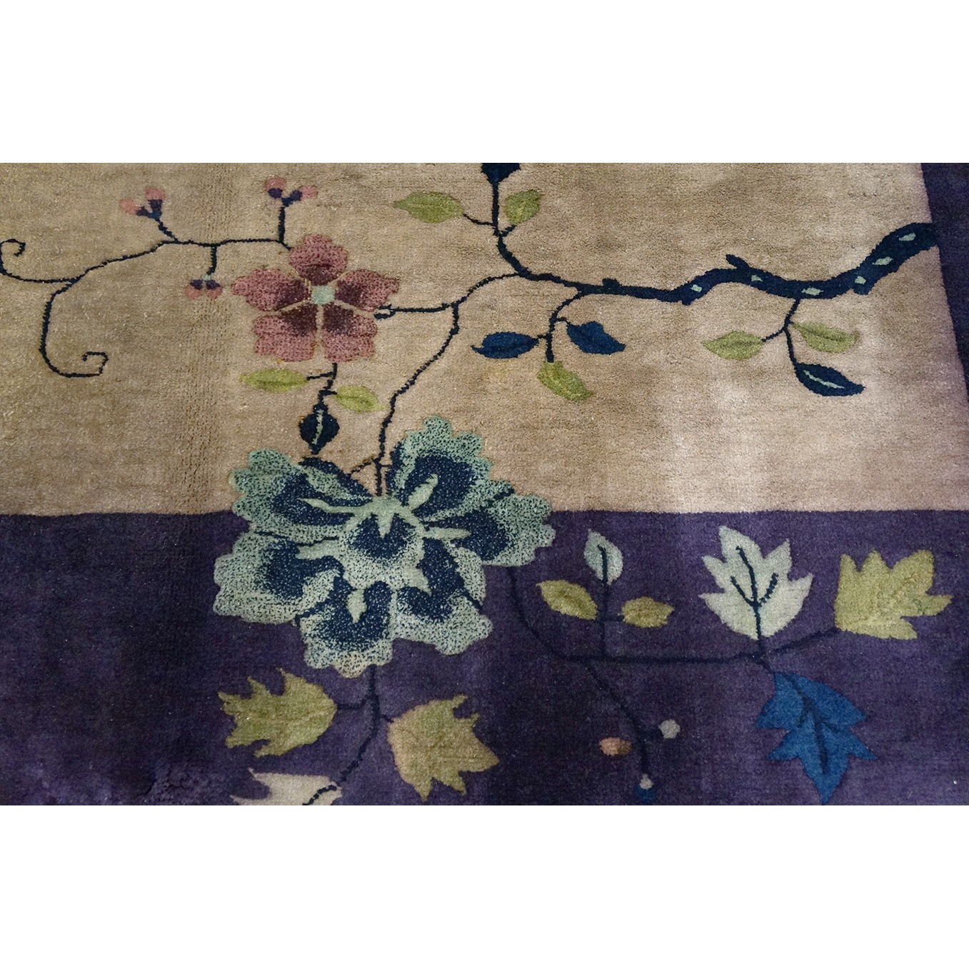 DescriptionChineseCarpets made in China proper. See entries Ningshia, Peking, Art Deco. Chinese - Art DecoAs the name implies, pieces woven between the wars for the Western market by mostly American owned firms especially Nichols and Fette, in thick heavy weaves using strong colors, asymmetric patterns and downplaying the Chinese-ness of the carpet. Nichols rugs are more strong toned than the pastel Fette. Most were woven in the coastal port city of Tientsin. Other lesser known workshops were also active. Some pieces are ultra-geometric and haute-Deco moderne in character: these are very rare. More frequent are pieces with bits of Chinese ornament: vases or other precious objects, paeonies, vines, fences, etc. Most common is the 9 x 12 size, in colors never found in mainstream Chinese rugs: backgrounds in black, mauve, purple, hot pink, orange, olive, employing the best synthetic chrome dyes of the period. Prices are still reasonable and carpets in top condition are available. | |