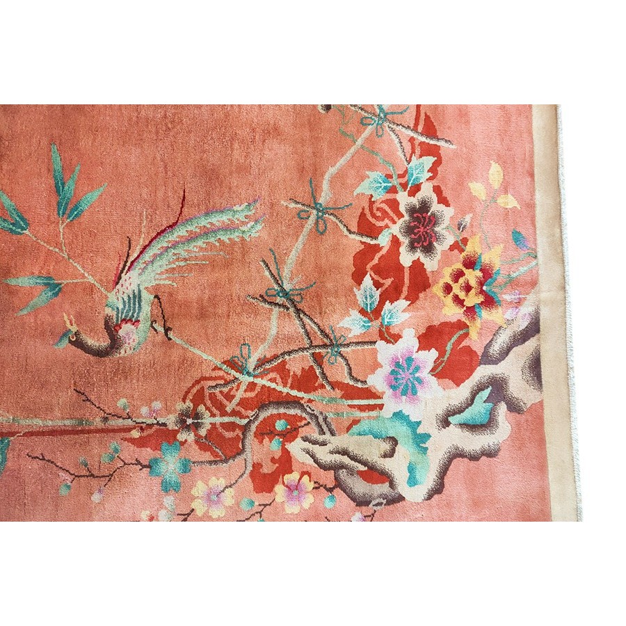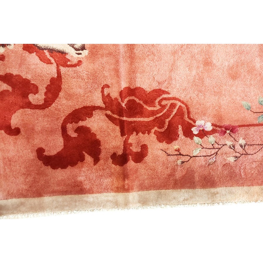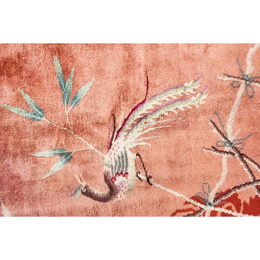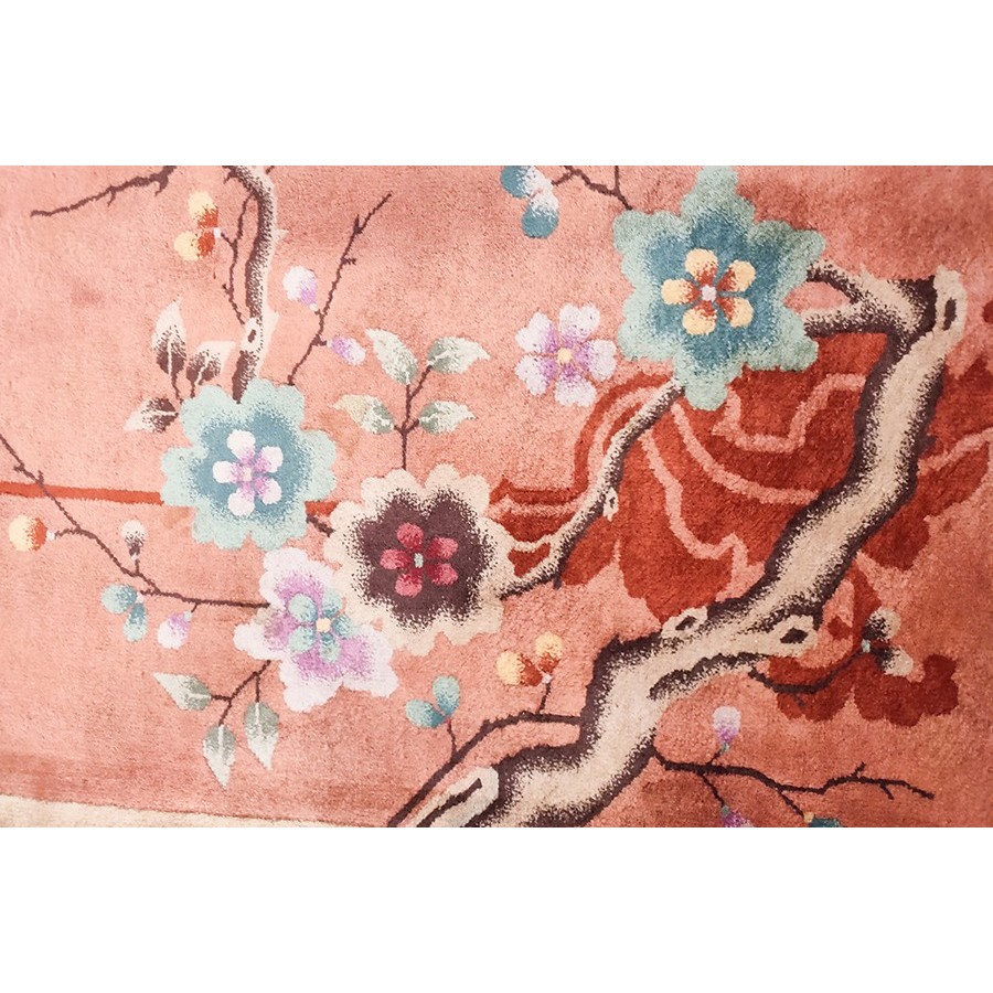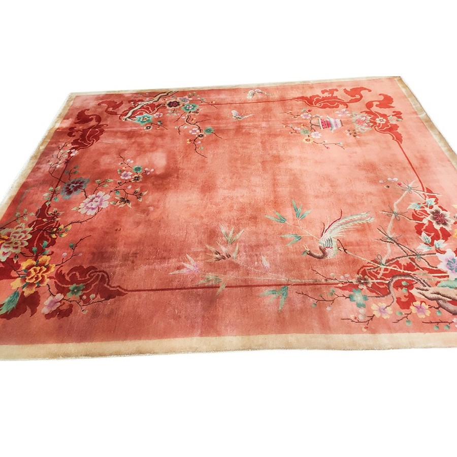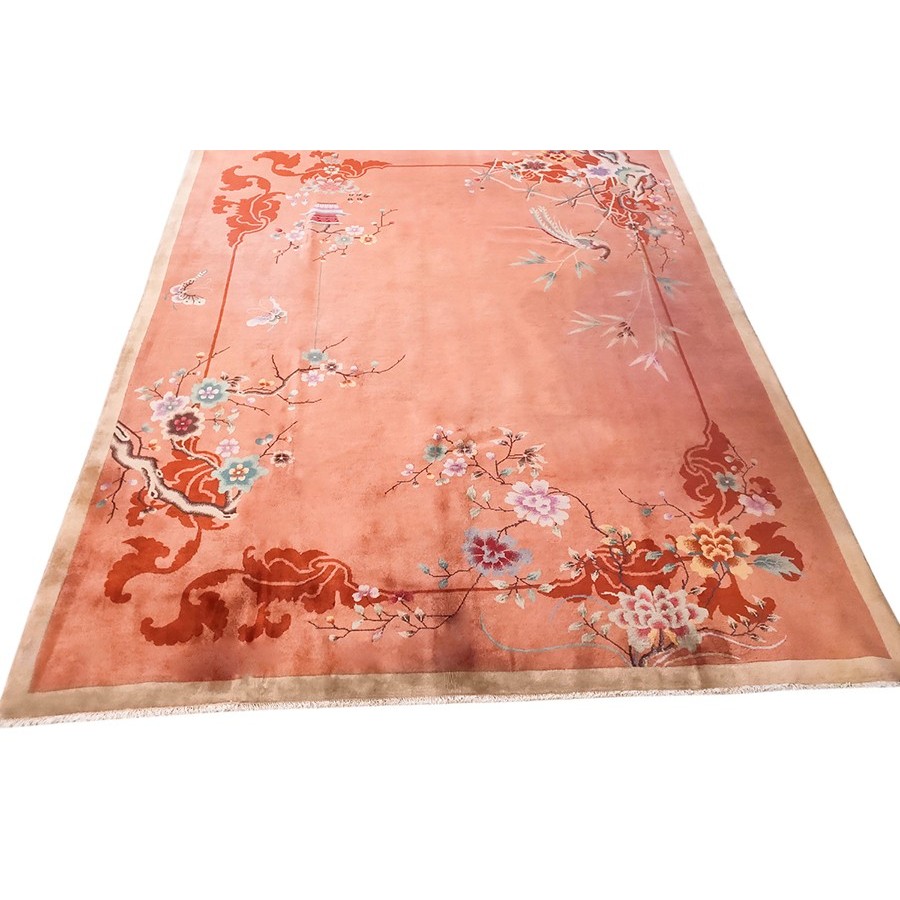 DescriptionChineseCarpets made in China proper. See entries Ningshia, Peking, Art Deco. Chinese - Art DecoAs the name implies, pieces woven between the wars for the Western market by mostly American owned firms especially Nichols and Fette, in thick heavy weaves using strong colors, asymmetric patterns and downplaying the Chinese-ness of the carpet. Nichols rugs are more strong toned than the pastel Fette. Most were woven in the coastal port city of Tientsin. Other lesser known workshops were also active. Some pieces are ultra-geometric and haute-Deco moderne in character: these are very rare. More frequent are pieces with bits of Chinese ornament: vases or other precious objects, paeonies, vines, fences, etc. Most common is the 9 x 12 size, in colors never found in mainstream Chinese rugs: backgrounds in black, mauve, purple, hot pink, orange, olive, employing the best synthetic chrome dyes of the period. Prices are still reasonable and carpets in top condition are available. | |