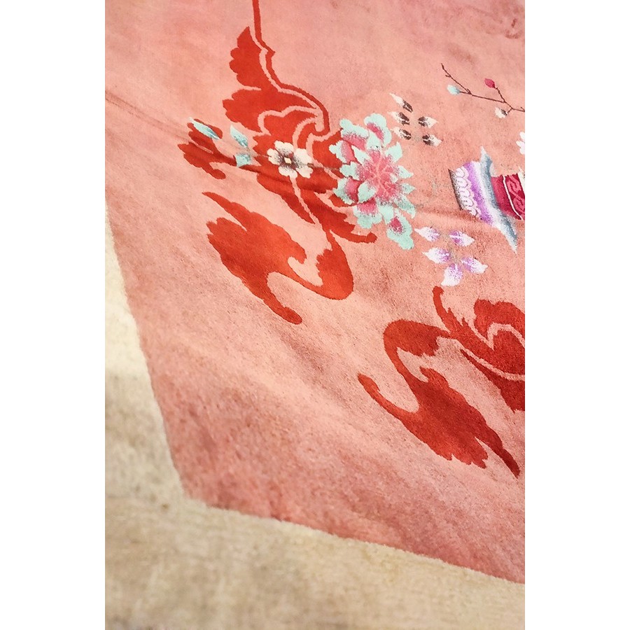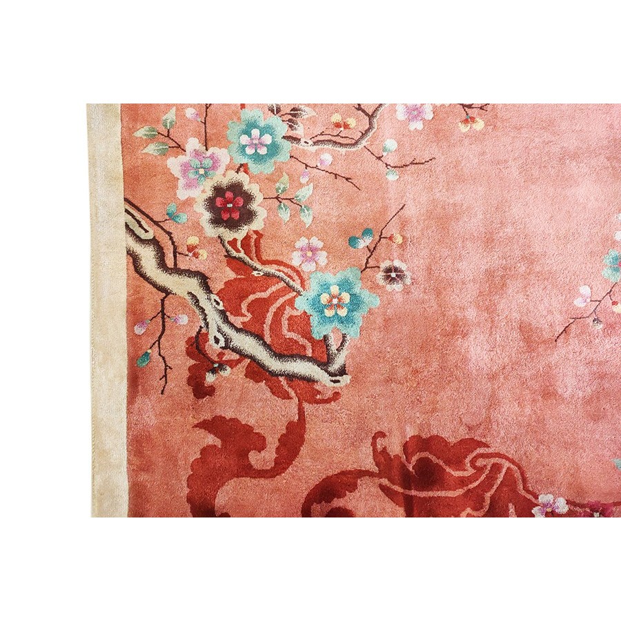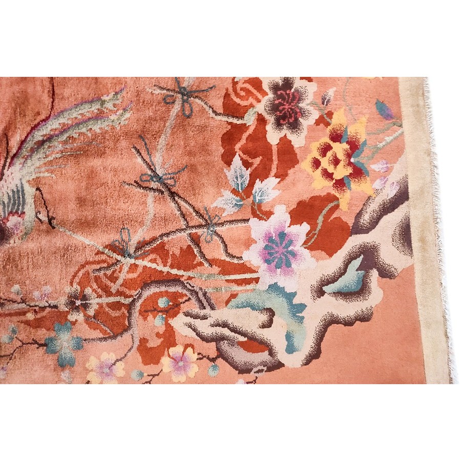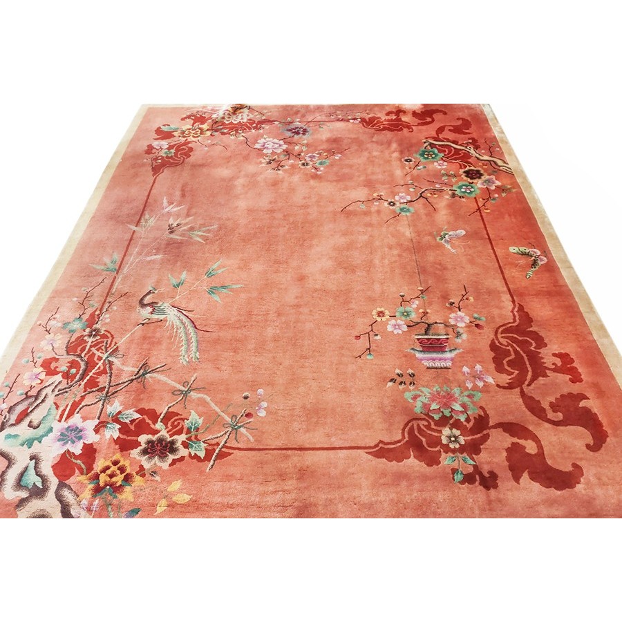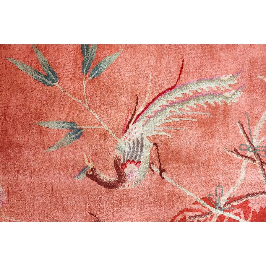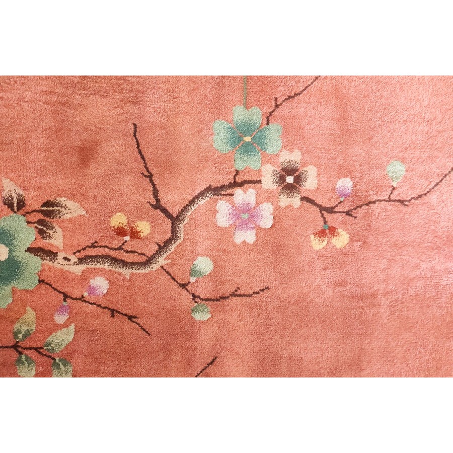 DescriptionChineseCarpets made in China proper. See entries Ningshia, Peking, Art Deco. Chinese - Art DecoAs the name implies, pieces woven between the wars for the Western market by mostly American owned firms especially Nichols and Fette, in thick heavy weaves using strong colors, asymmetric patterns and downplaying the Chinese-ness of the carpet. Nichols rugs are more strong toned than the pastel Fette. Most were woven in the coastal port city of Tientsin. Other lesser known workshops were also active. Some pieces are ultra-geometric and haute-Deco moderne in character: these are very rare. More frequent are pieces with bits of Chinese ornament: vases or other precious objects, paeonies, vines, fences, etc. Most common is the 9 x 12 size, in colors never found in mainstream Chinese rugs: backgrounds in black, mauve, purple, hot pink, orange, olive, employing the best synthetic chrome dyes of the period. Prices are still reasonable and carpets in top condition are available. | |