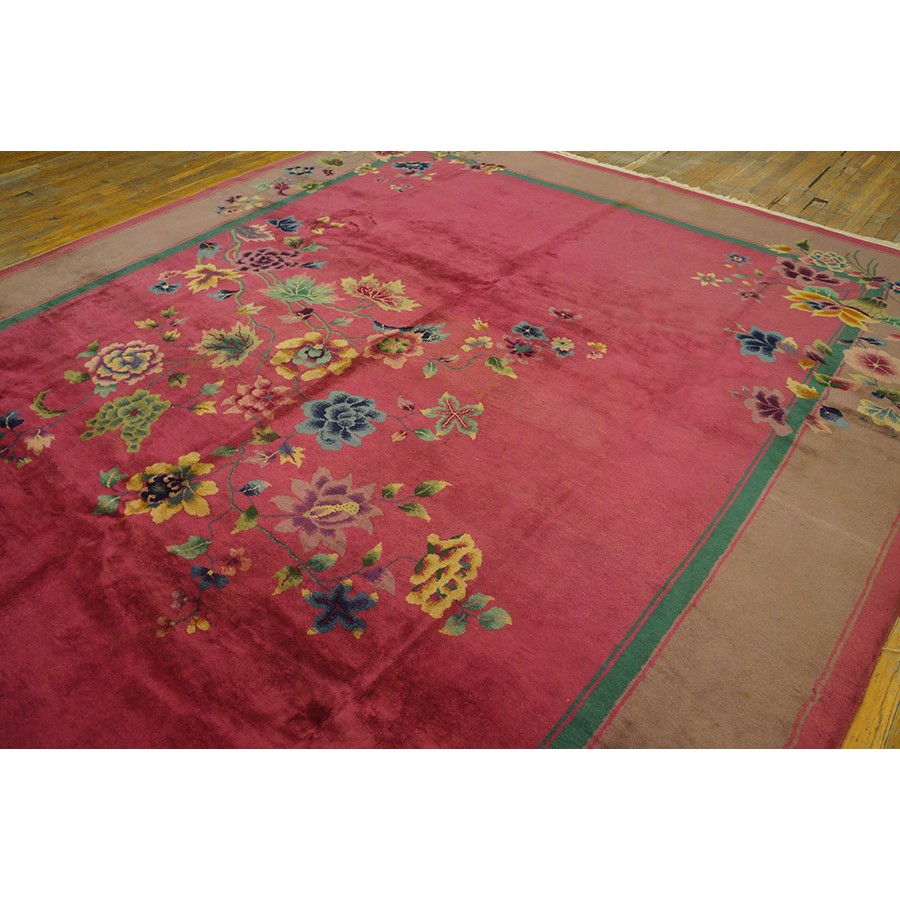 DescriptionChineseCarpets made in China proper. See entries Ningshia, Peking, Art Deco. Chinese - Art DecoAs the name implies, pieces woven between the wars for the Western market by mostly American owned firms especially Nichols and Fette, in thick heavy weaves using strong colors, asymmetric patterns and downplaying the Chinese-ness of the carpet. Nichols rugs are more strong toned than the pastel Fette. Most were woven in the coastal port city of Tientsin. Other lesser known workshops were also active. Some pieces are ultra-geometric and haute-Deco moderne in character: these are very rare. More frequent are pieces with bits of Chinese ornament: vases or other precious objects, paeonies, vines, fences, etc. Most common is the 9 x 12 size, in colors never found in mainstream Chinese rugs: backgrounds in black, mauve, purple, hot pink, orange, olive, employing the best synthetic chrome dyes of the period. Prices are still reasonable and carpets in top condition are available. | |