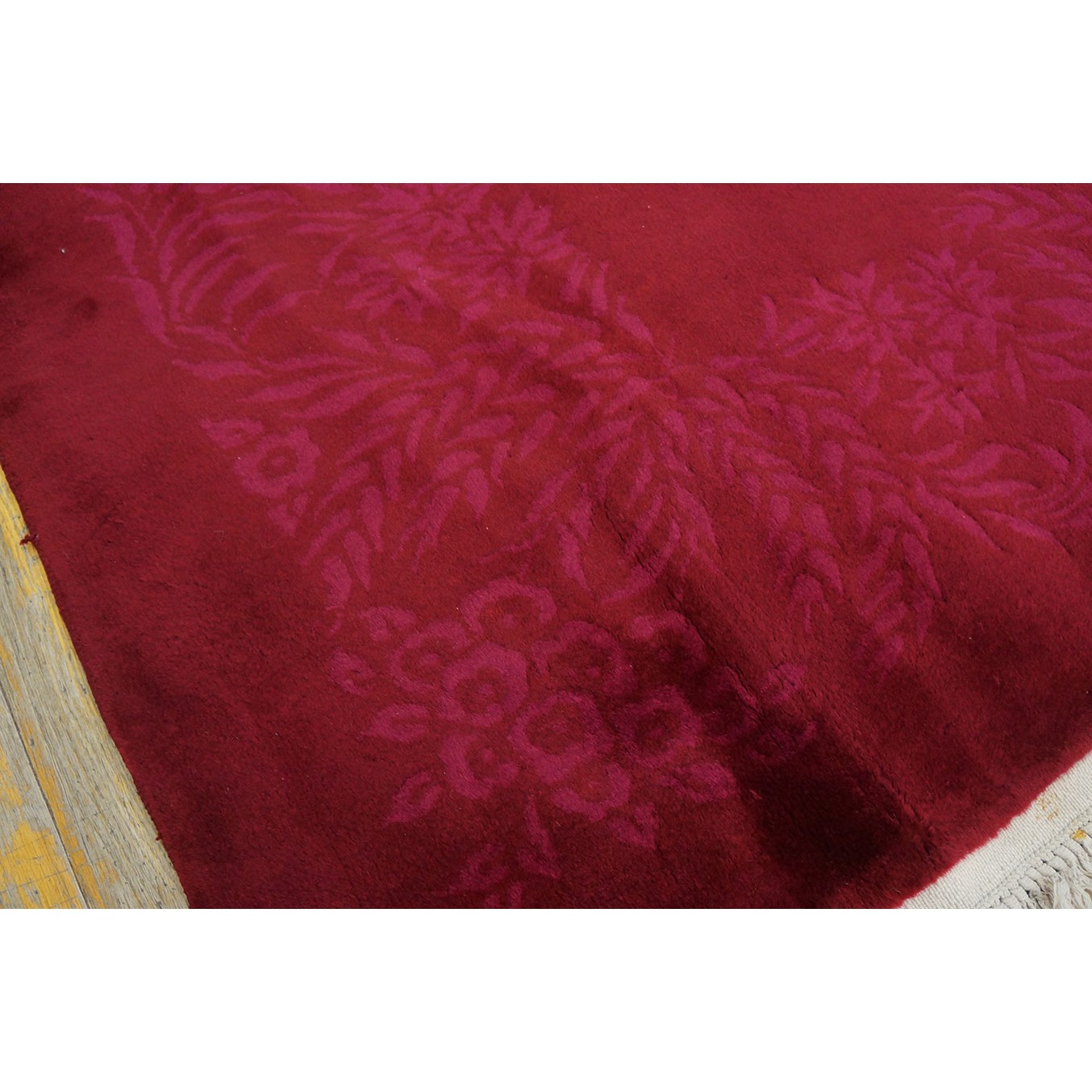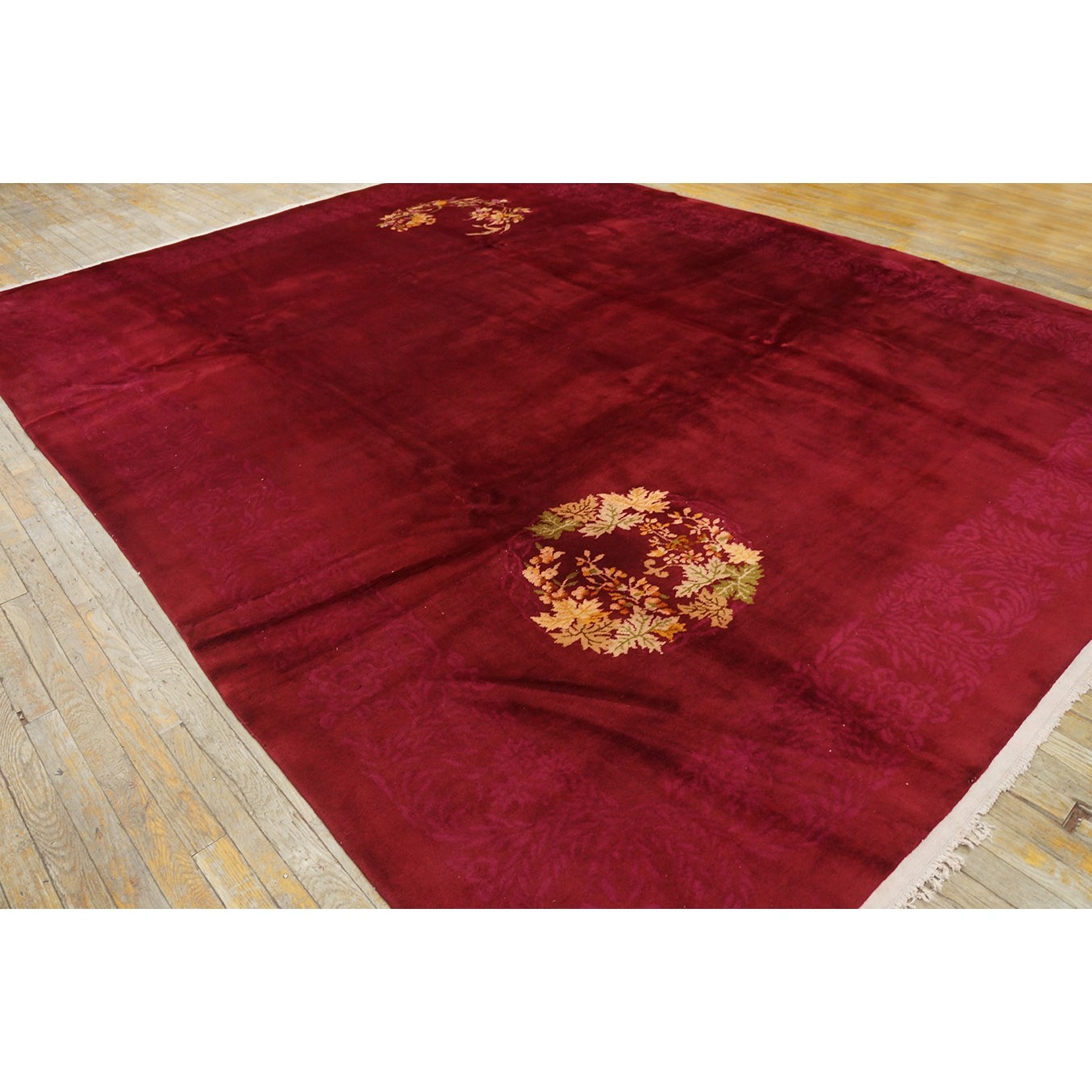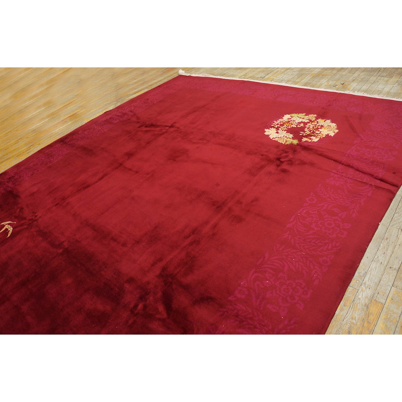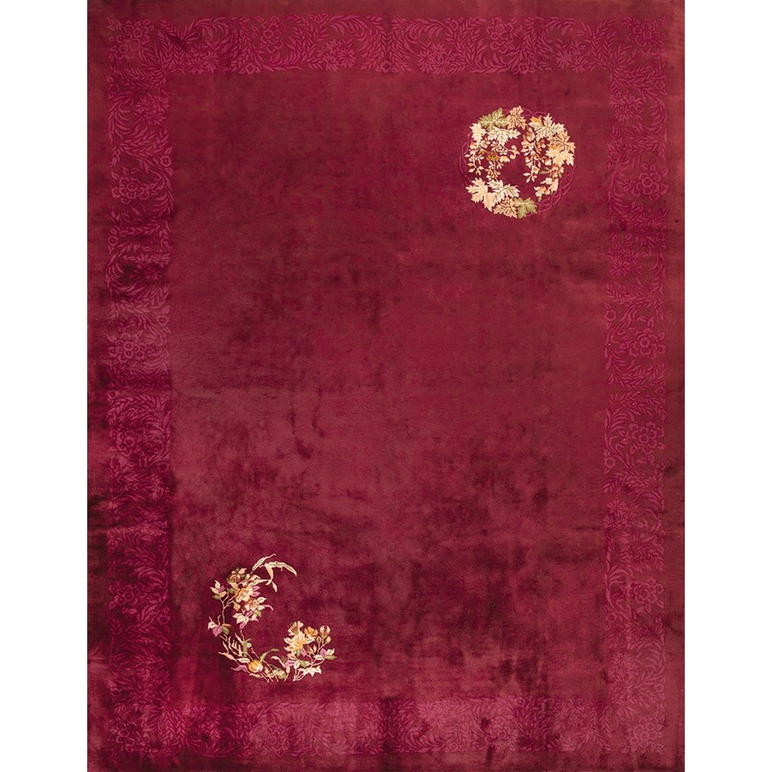 DescriptionChineseCarpets made in China proper. See entries Ningshia, Peking, Art Deco. Chinese - Art DecoAs the name implies, pieces woven between the wars for the Western market by mostly American owned firms especially Nichols and Fette, in thick heavy weaves using strong colors, asymmetric patterns and downplaying the Chinese-ness of the carpet. Nichols rugs are more strong toned than the pastel Fette. Most were woven in the coastal port city of Tientsin. Other lesser known workshops were also active. Some pieces are ultra-geometric and haute-Deco moderne in character: these are very rare. More frequent are pieces with bits of Chinese ornament: vases or other precious objects, paeonies, vines, fences, etc. Most common is the 9 x 12 size, in colors never found in mainstream Chinese rugs: backgrounds in black, mauve, purple, hot pink, orange, olive, employing the best synthetic chrome dyes of the period. Prices are still reasonable and carpets in top condition are available. | |