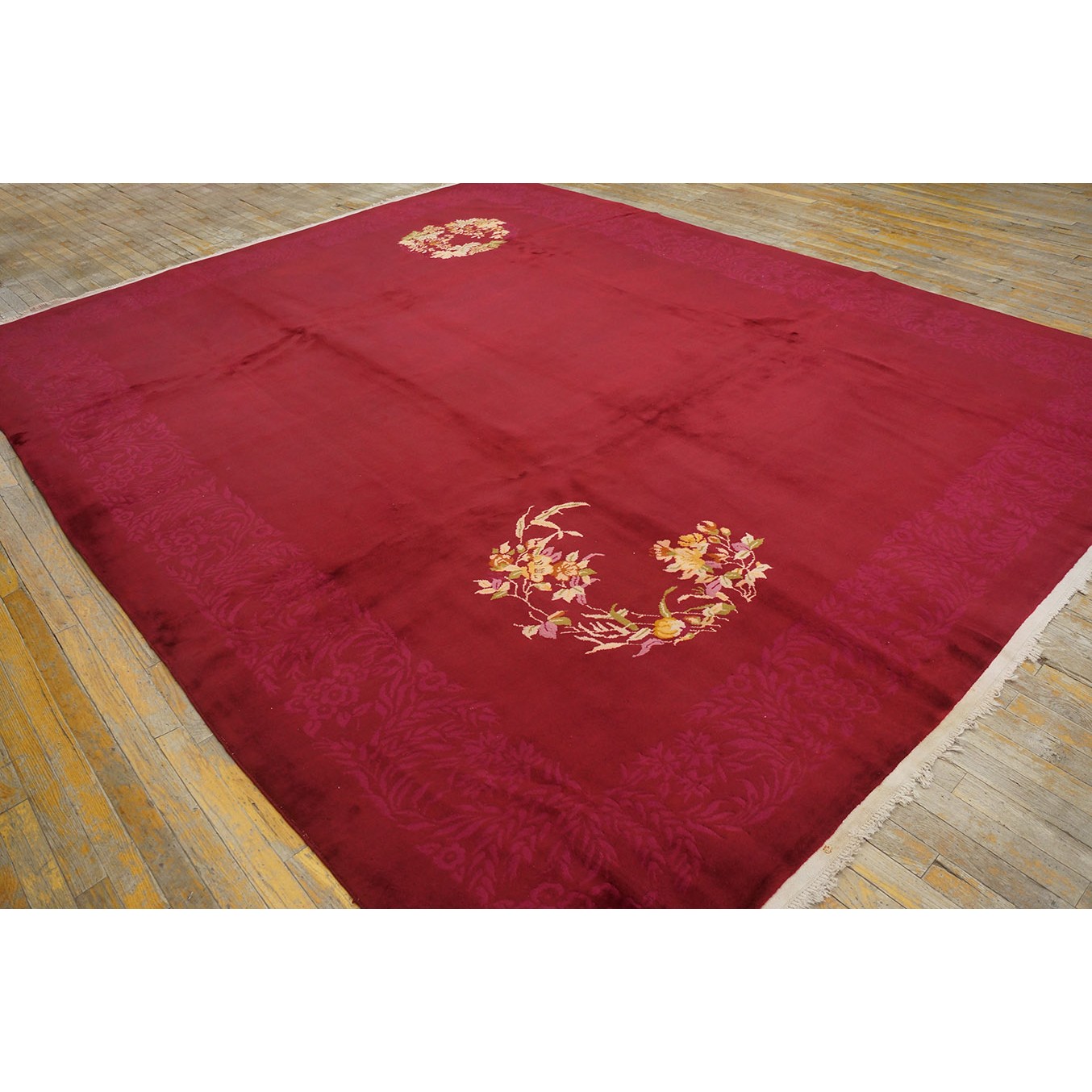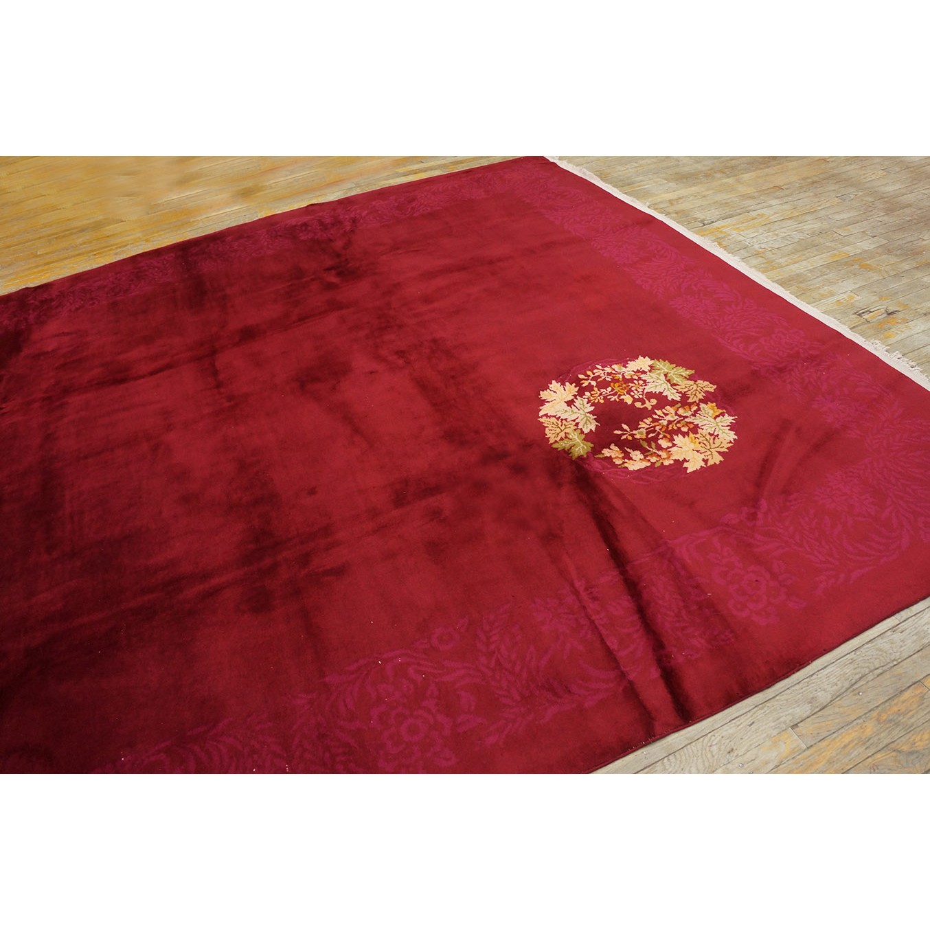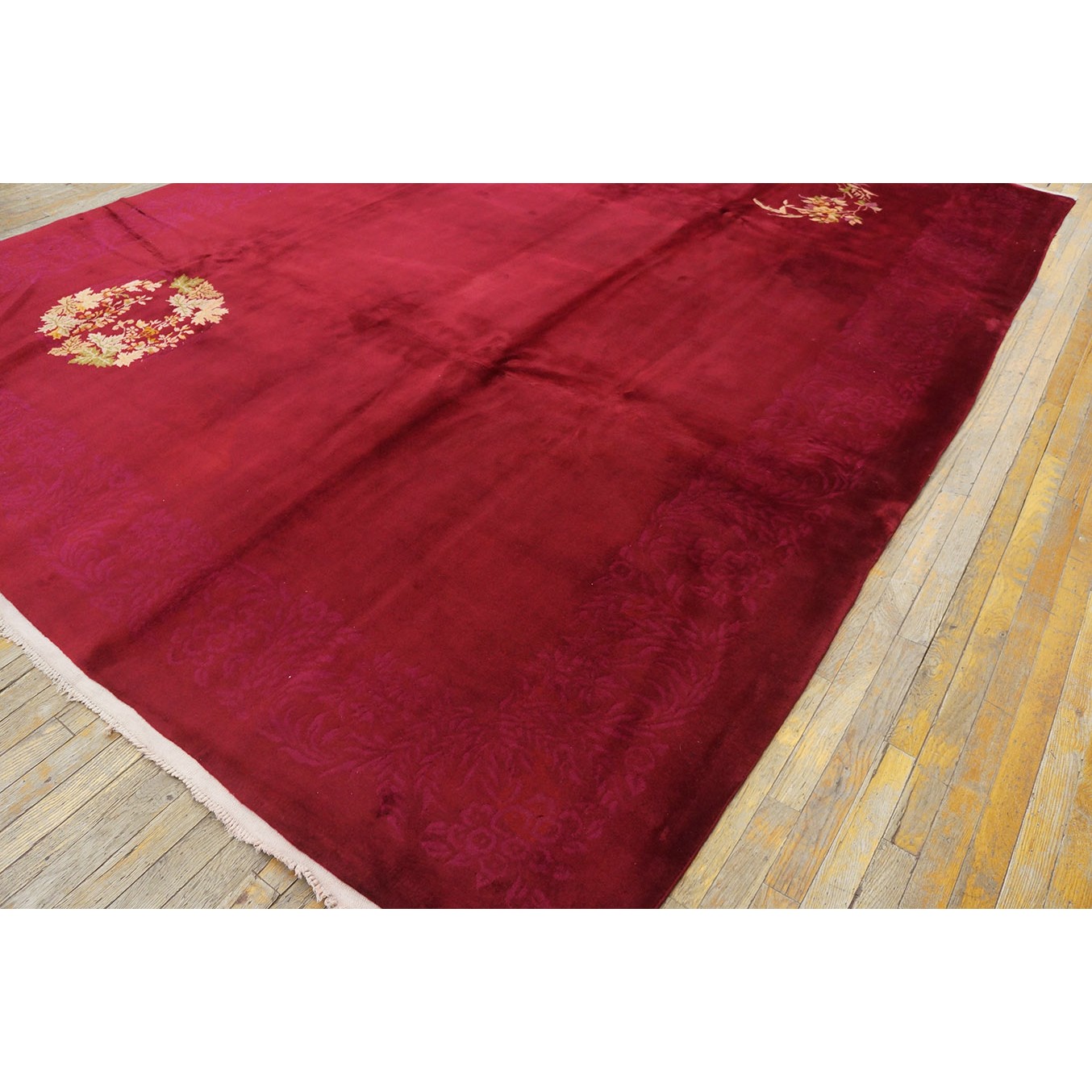 DescriptionChineseCarpets made in China proper. See entries Ningshia, Peking, Art Deco. Chinese - Art DecoAs the name implies, pieces woven between the wars for the Western market by mostly American owned firms especially Nichols and Fette, in thick heavy weaves using strong colors, asymmetric patterns and downplaying the Chinese-ness of the carpet. Nichols rugs are more strong toned than the pastel Fette. Most were woven in the coastal port city of Tientsin. Other lesser known workshops were also active. Some pieces are ultra-geometric and haute-Deco moderne in character: these are very rare. More frequent are pieces with bits of Chinese ornament: vases or other precious objects, paeonies, vines, fences, etc. Most common is the 9 x 12 size, in colors never found in mainstream Chinese rugs: backgrounds in black, mauve, purple, hot pink, orange, olive, employing the best synthetic chrome dyes of the period. Prices are still reasonable and carpets in top condition are available. | |