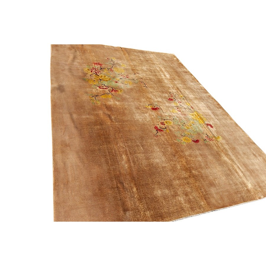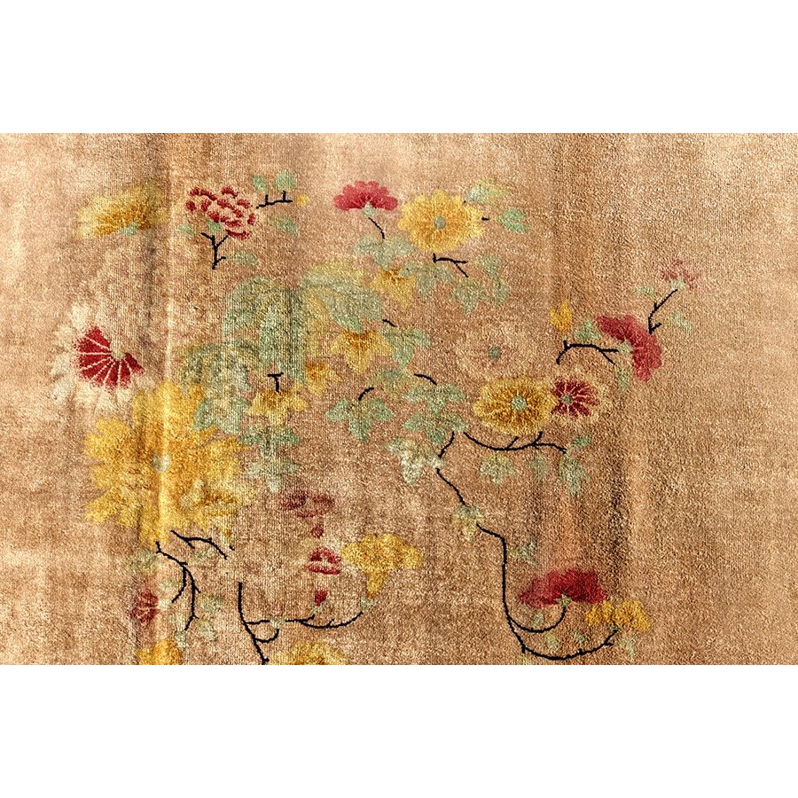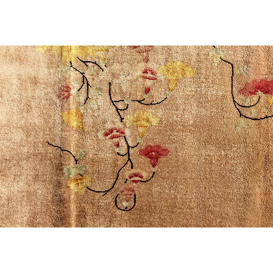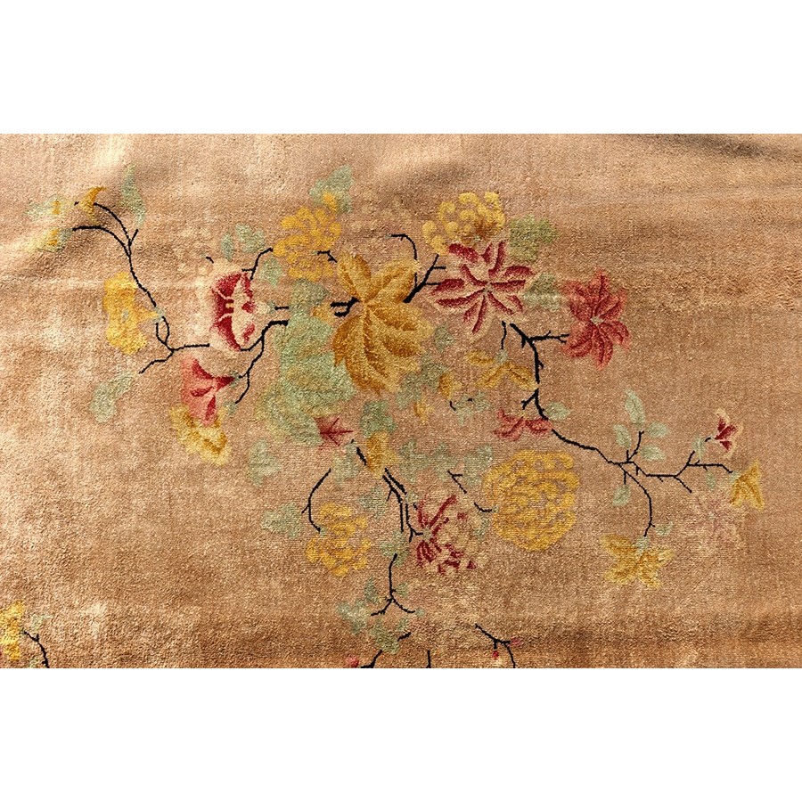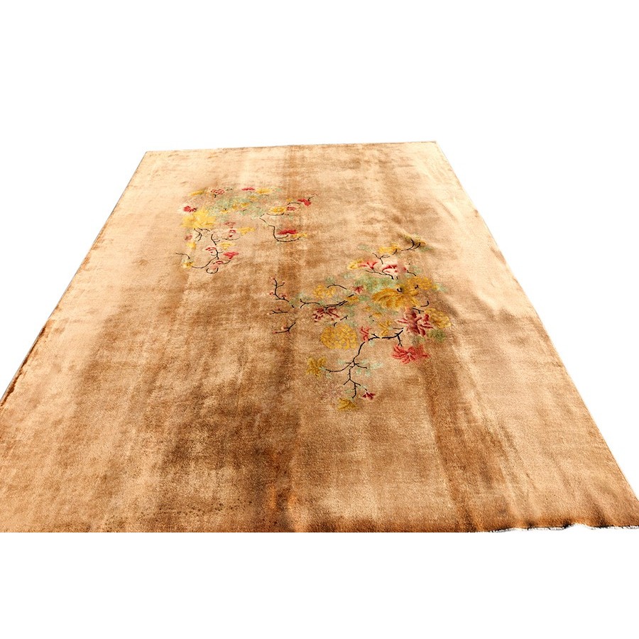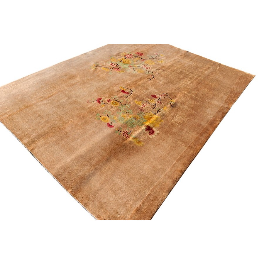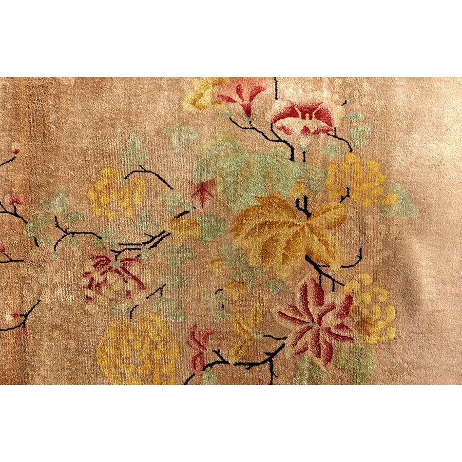 DescriptionChineseCarpets made in China proper. See entries Ningshia, Peking, Art Deco. Chinese - Art DecoAs the name implies, pieces woven between the wars for the Western market by mostly American owned firms especially Nichols and Fette, in thick heavy weaves using strong colors, asymmetric patterns and downplaying the Chinese-ness of the carpet. Nichols rugs are more strong toned than the pastel Fette. Most were woven in the coastal port city of Tientsin. Other lesser known workshops were also active. Some pieces are ultra-geometric and haute-Deco moderne in character: these are very rare. More frequent are pieces with bits of Chinese ornament: vases or other precious objects, paeonies, vines, fences, etc. Most common is the 9 x 12 size, in colors never found in mainstream Chinese rugs: backgrounds in black, mauve, purple, hot pink, orange, olive, employing the best synthetic chrome dyes of the period. Prices are still reasonable and carpets in top condition are available. | |