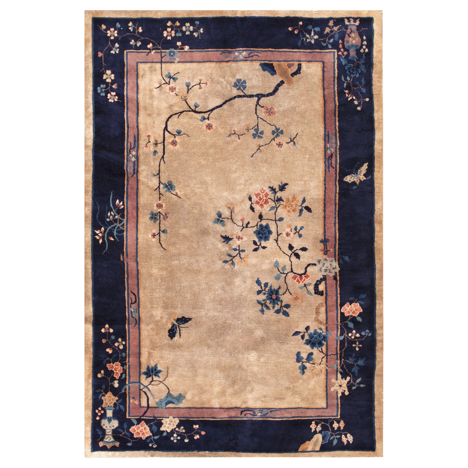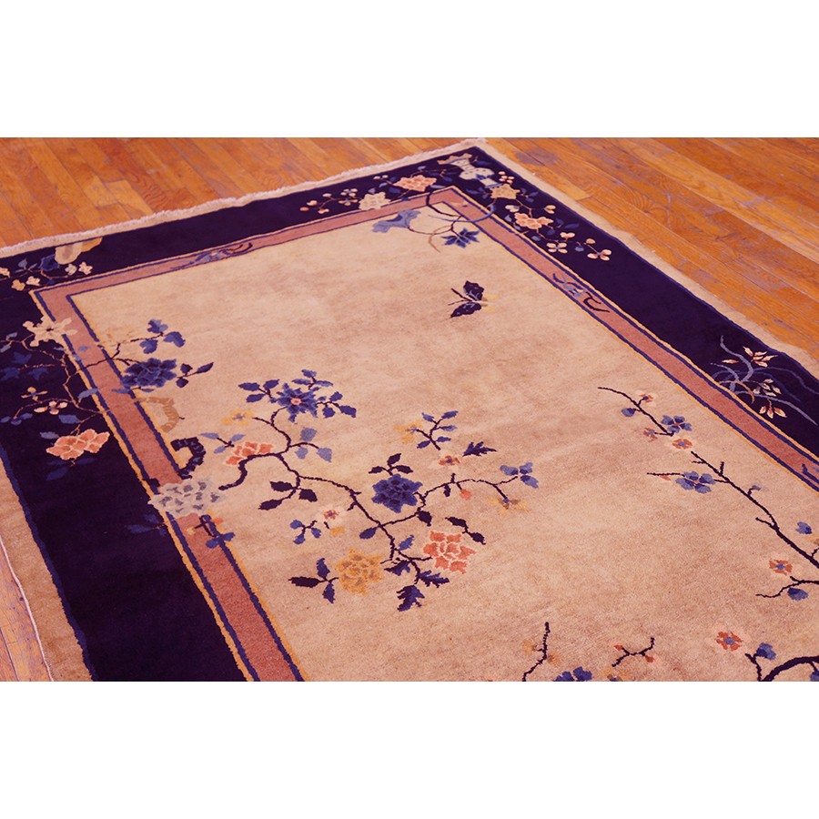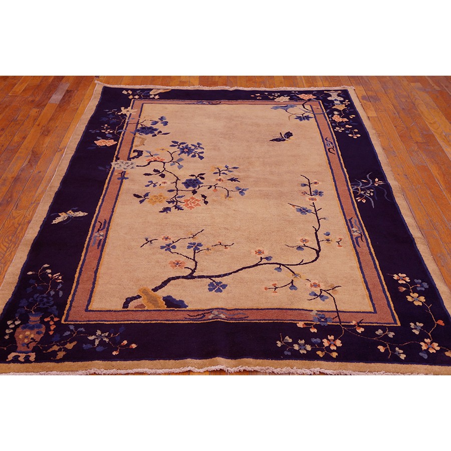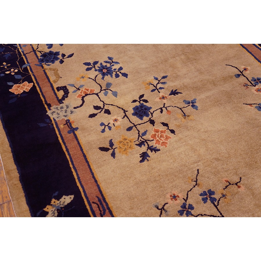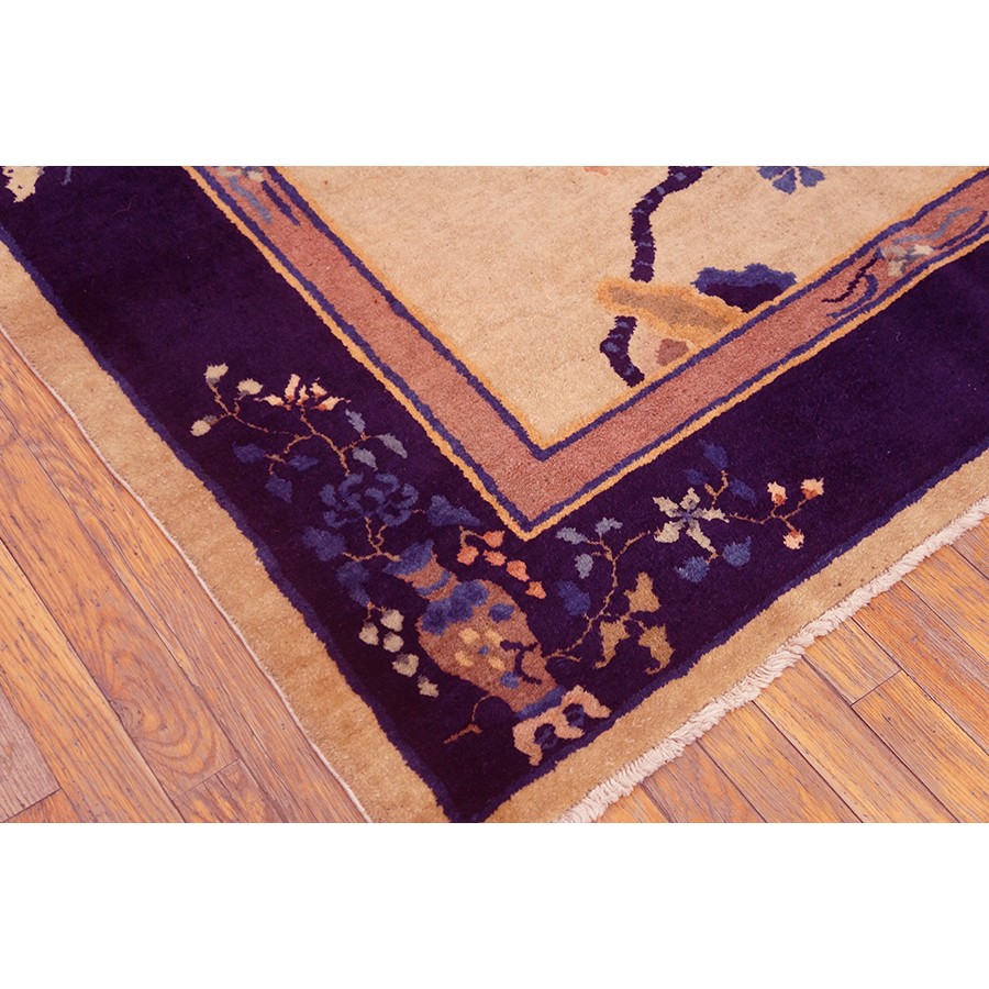DescriptionChineseCarpets made in China proper. See entries Ningshia, Peking, Art Deco. Chinese - Art DecoAs the name implies, pieces woven between the wars for the Western market by mostly American owned firms especially Nichols and Fette, in thick heavy weaves using strong colors, asymmetric patterns and downplaying the Chinese-ness of the carpet. Nichols rugs are more strong toned than the pastel Fette. Most were woven in the coastal port city of Tientsin. Other lesser known workshops were also active. Some pieces are ultra-geometric and haute-Deco moderne in character: these are very rare. More frequent are pieces with bits of Chinese ornament: vases or other precious objects, paeonies, vines, fences, etc. Most common is the 9 x 12 size, in colors never found in mainstream Chinese rugs: backgrounds in black, mauve, purple, hot pink, orange, olive, employing the best synthetic chrome dyes of the period. Prices are still reasonable and carpets in top condition are available. | |