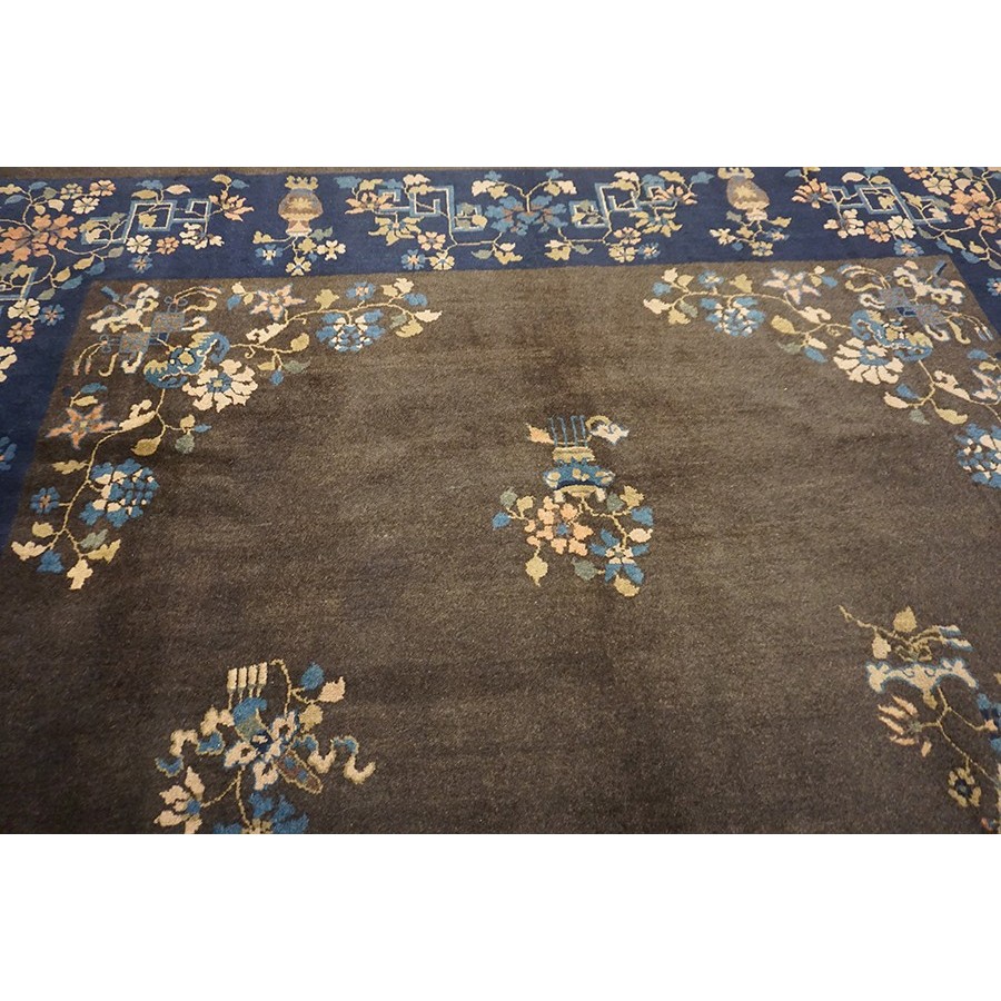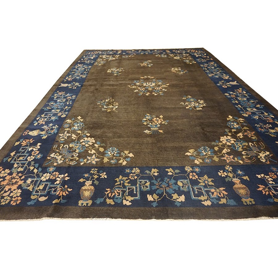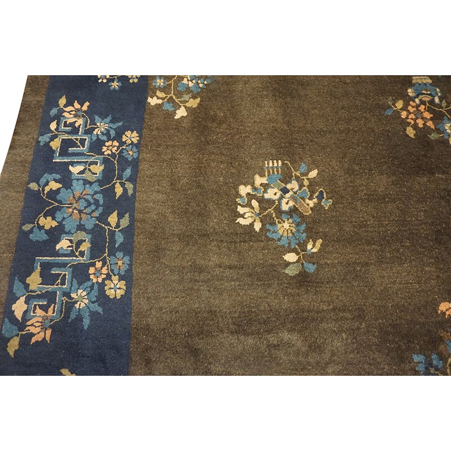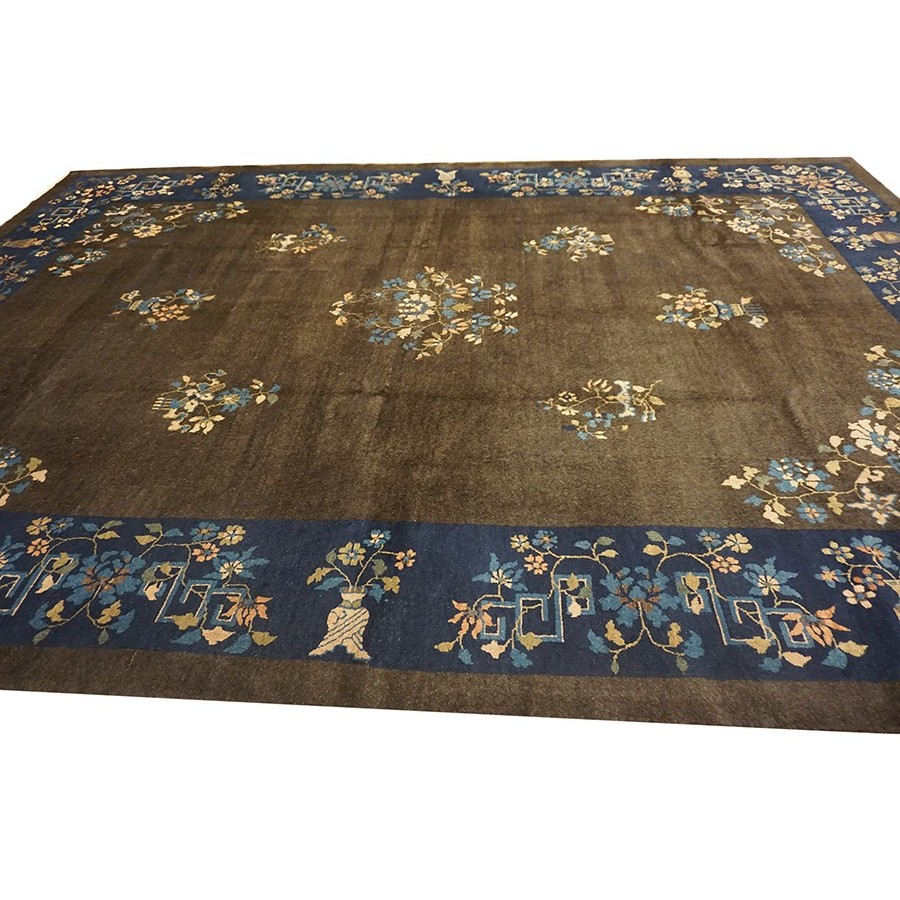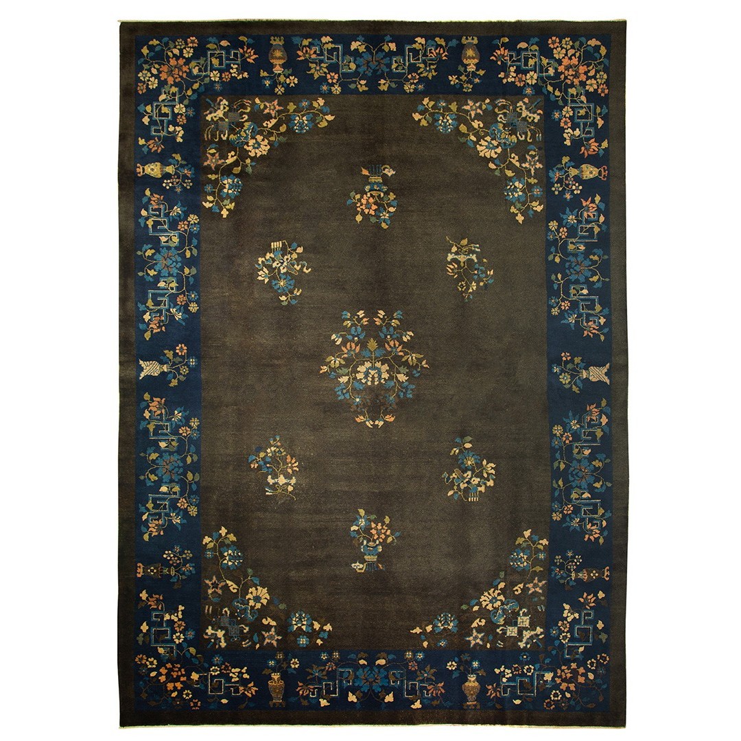 DescriptionChineseCarpets made in China proper. See entries Ningshia, Peking, Art Deco. Chinese - Art DecoAs the name implies, pieces woven between the wars for the Western market by mostly American owned firms especially Nichols and Fette, in thick heavy weaves using strong colors, asymmetric patterns and downplaying the Chinese-ness of the carpet. Nichols rugs are more strong toned than the pastel Fette. Most were woven in the coastal port city of Tientsin. Other lesser known workshops were also active. Some pieces are ultra-geometric and haute-Deco moderne in character: these are very rare. More frequent are pieces with bits of Chinese ornament: vases or other precious objects, paeonies, vines, fences, etc. Most common is the 9 x 12 size, in colors never found in mainstream Chinese rugs: backgrounds in black, mauve, purple, hot pink, orange, olive, employing the best synthetic chrome dyes of the period. Prices are still reasonable and carpets in top condition are available. | |