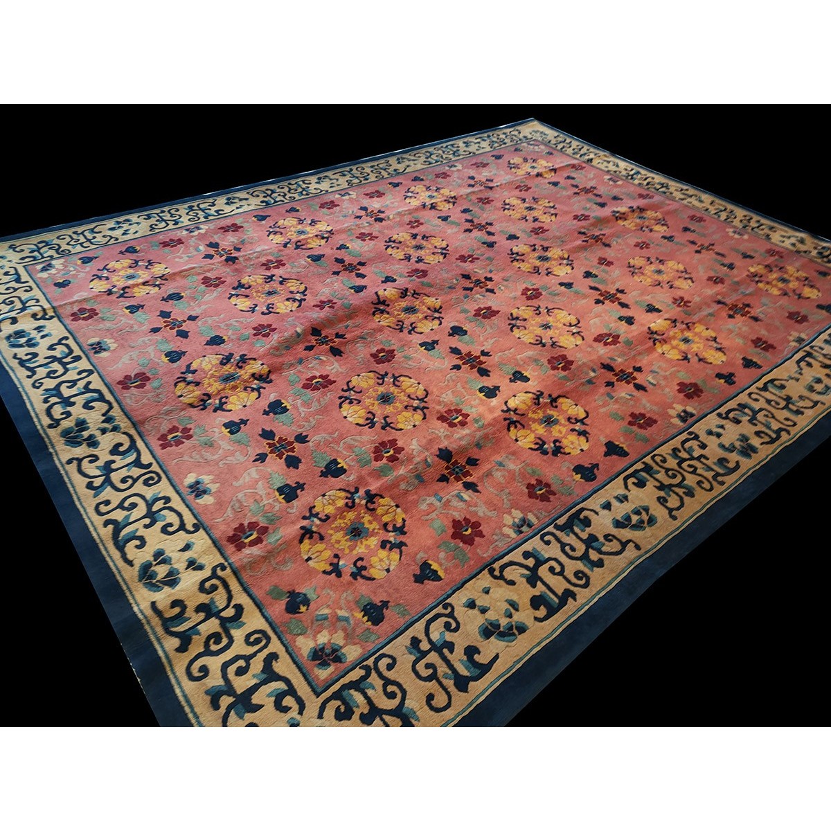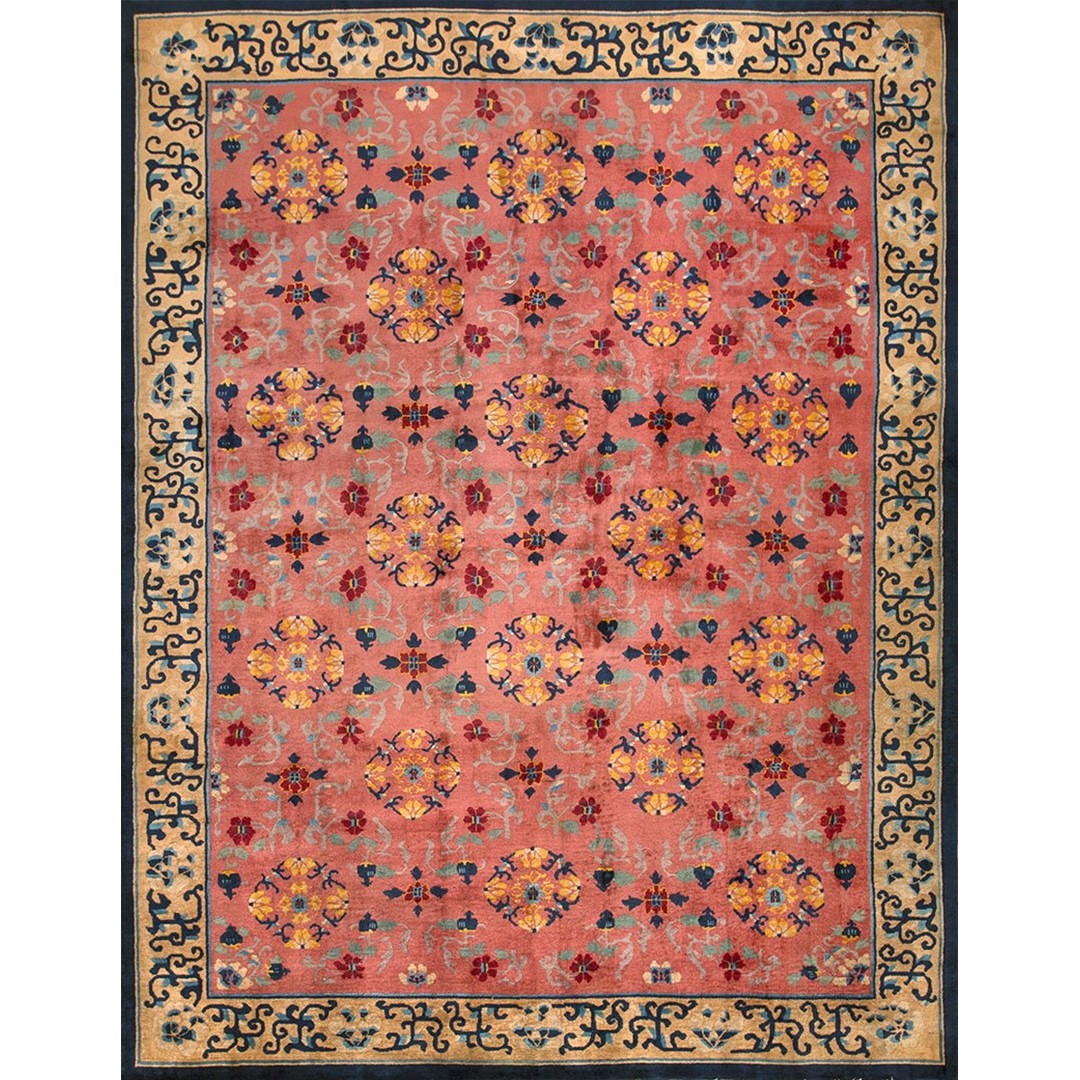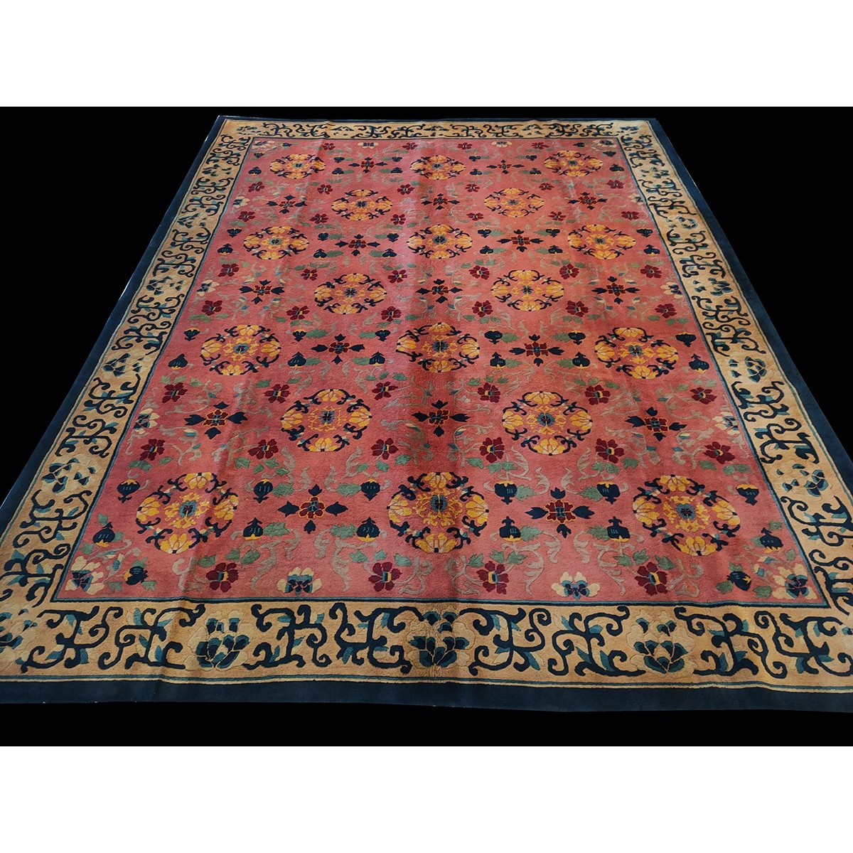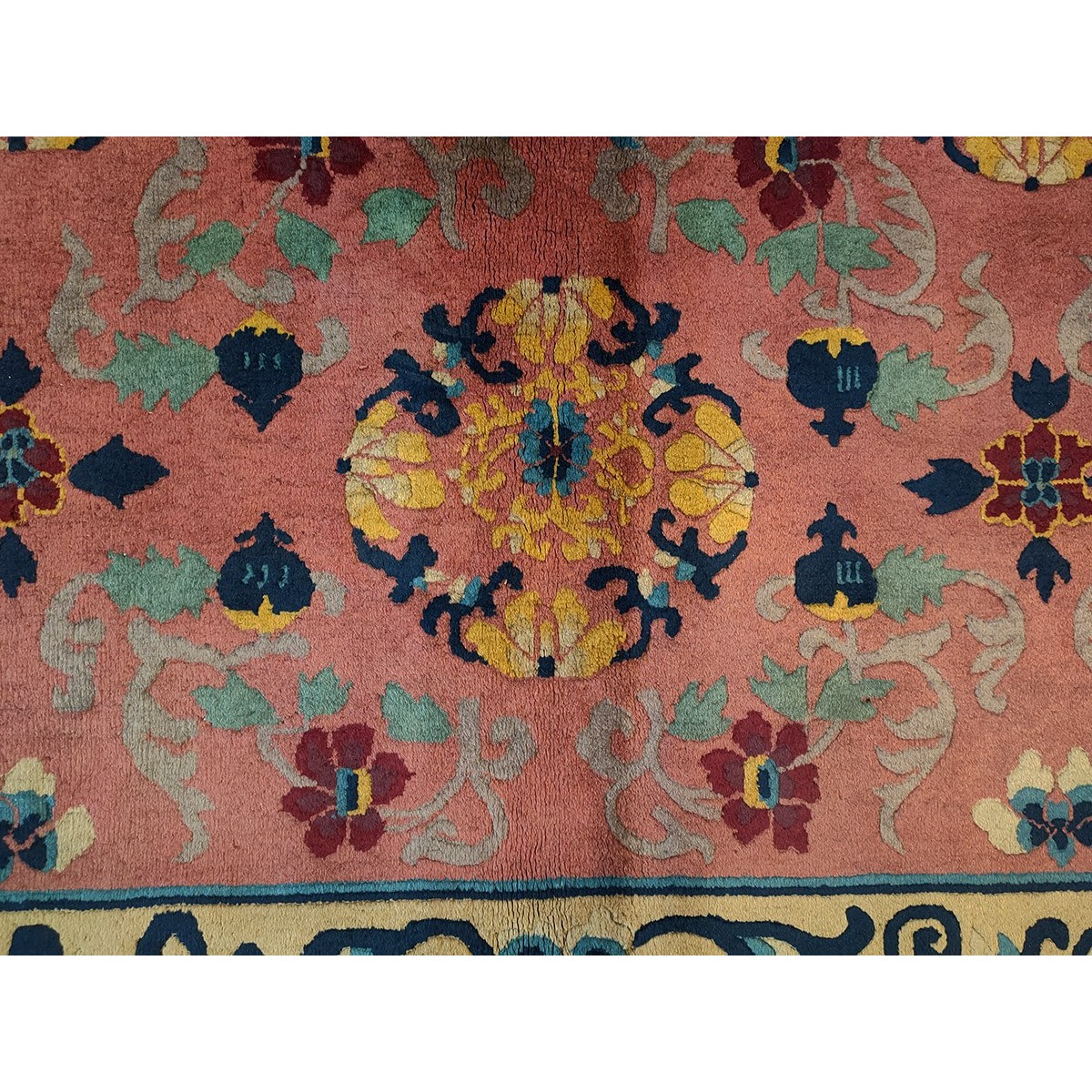 DescriptionChineseCarpets made in China proper. See entries Ningshia, Peking, Art Deco. Chinese - Art DecoAs the name implies, pieces woven between the wars for the Western market by mostly American owned firms especially Nichols and Fette, in thick heavy weaves using strong colors, asymmetric patterns and downplaying the Chinese-ness of the carpet. Nichols rugs are more strong toned than the pastel Fette. Most were woven in the coastal port city of Tientsin. Other lesser known workshops were also active. Some pieces are ultra-geometric and haute-Deco moderne in character: these are very rare. More frequent are pieces with bits of Chinese ornament: vases or other precious objects, paeonies, vines, fences, etc. Most common is the 9 x 12 size, in colors never found in mainstream Chinese rugs: backgrounds in black, mauve, purple, hot pink, orange, olive, employing the best synthetic chrome dyes of the period. Prices are still reasonable and carpets in top condition are available. | |