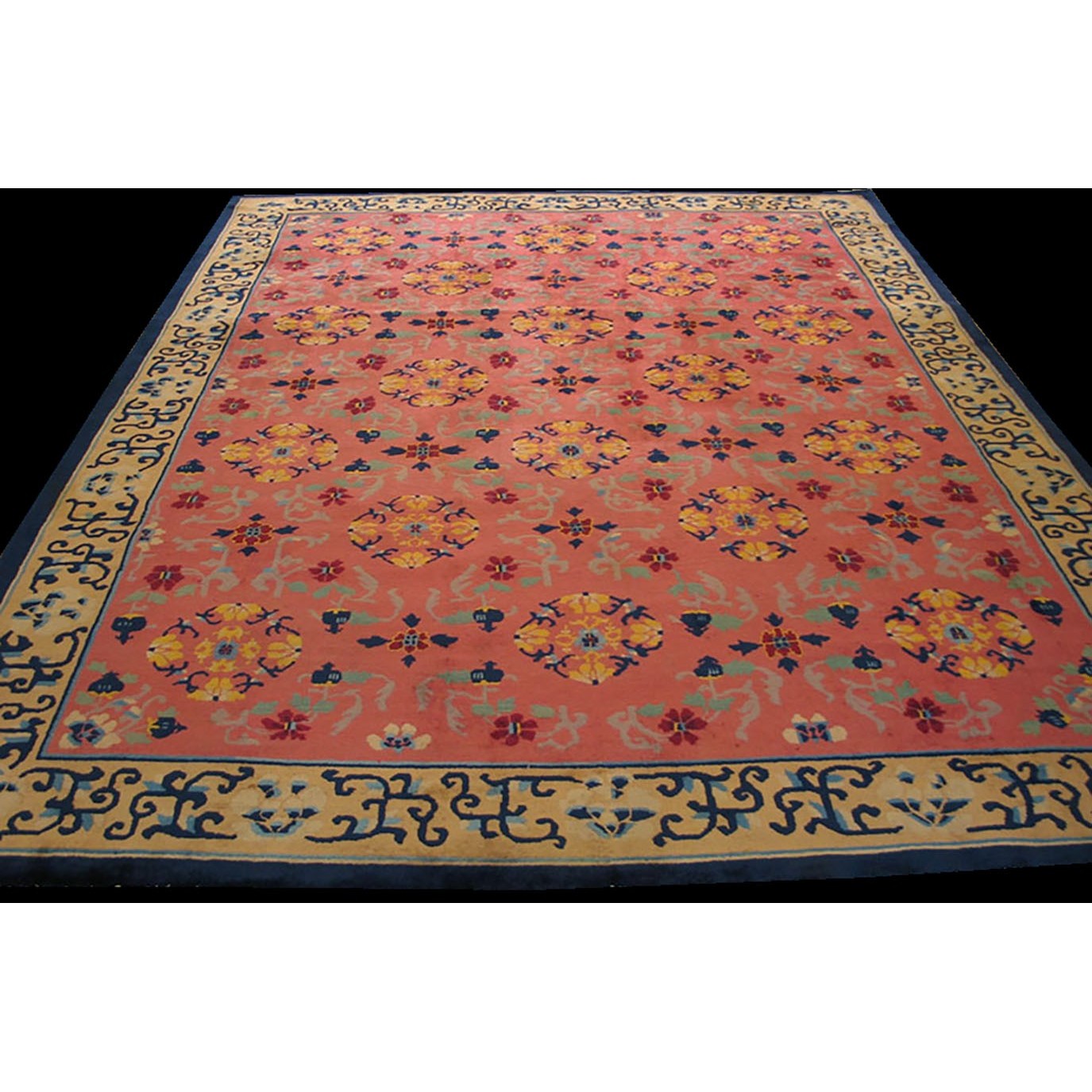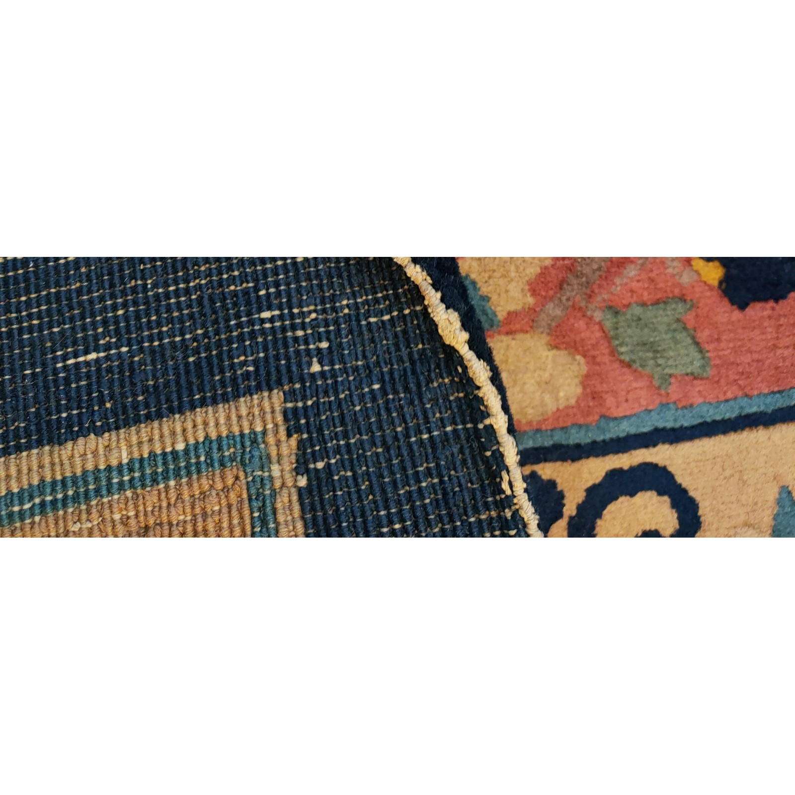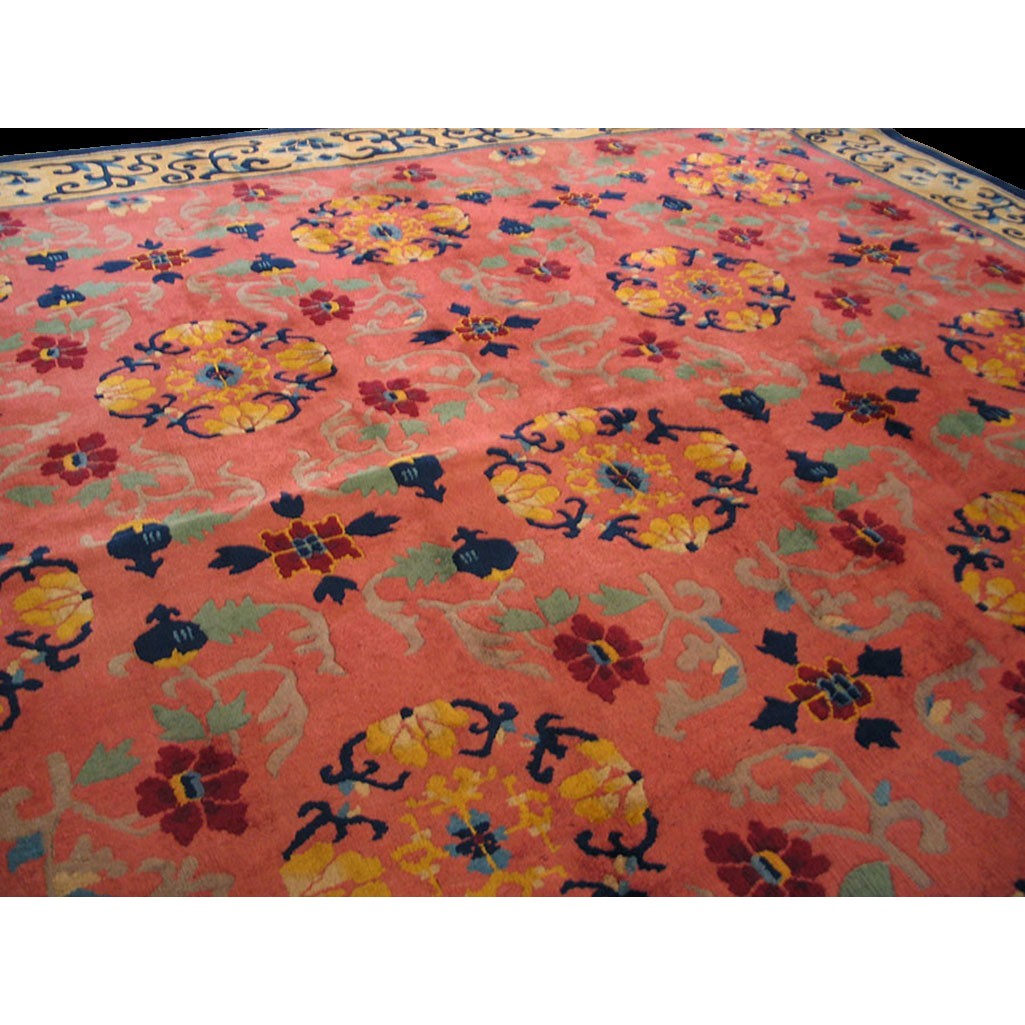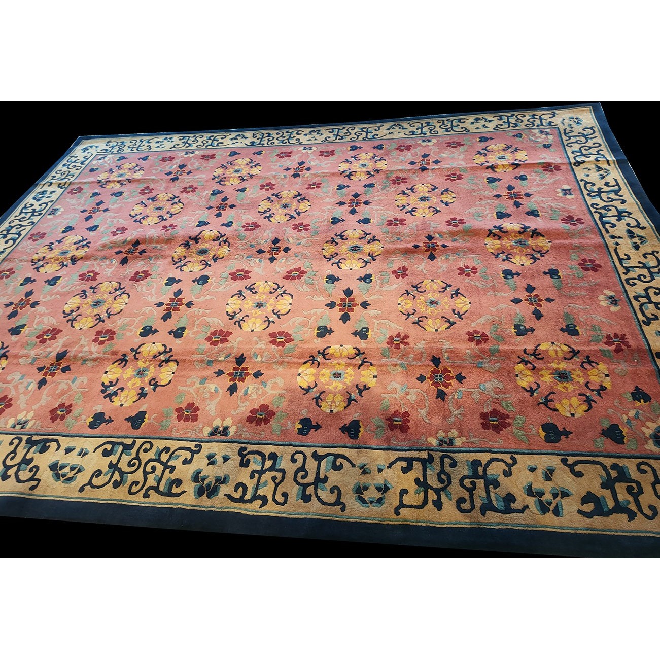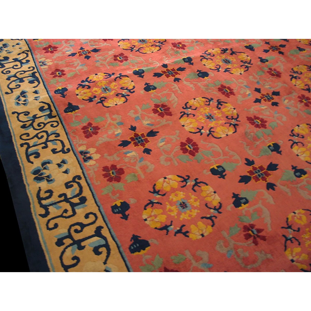DescriptionChineseCarpets made in China proper. See entries Ningshia, Peking, Art Deco. Chinese - Art DecoAs the name implies, pieces woven between the wars for the Western market by mostly American owned firms especially Nichols and Fette, in thick heavy weaves using strong colors, asymmetric patterns and downplaying the Chinese-ness of the carpet. Nichols rugs are more strong toned than the pastel Fette. Most were woven in the coastal port city of Tientsin. Other lesser known workshops were also active. Some pieces are ultra-geometric and haute-Deco moderne in character: these are very rare. More frequent are pieces with bits of Chinese ornament: vases or other precious objects, paeonies, vines, fences, etc. Most common is the 9 x 12 size, in colors never found in mainstream Chinese rugs: backgrounds in black, mauve, purple, hot pink, orange, olive, employing the best synthetic chrome dyes of the period. Prices are still reasonable and carpets in top condition are available. | |