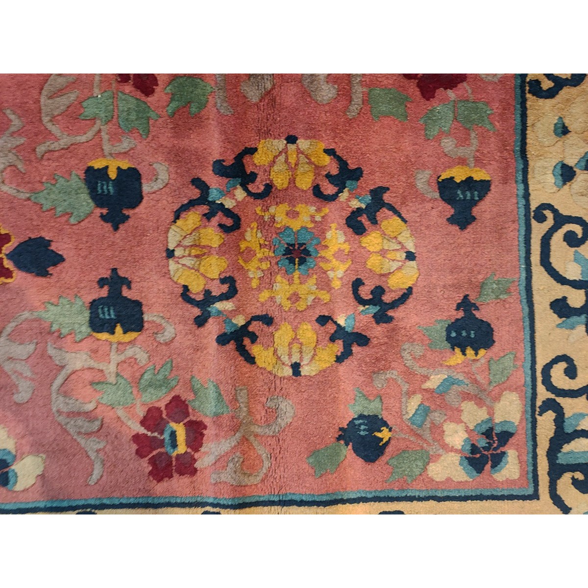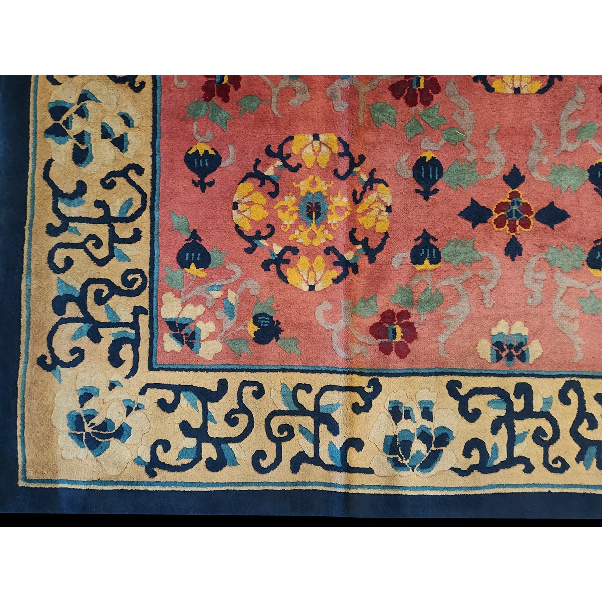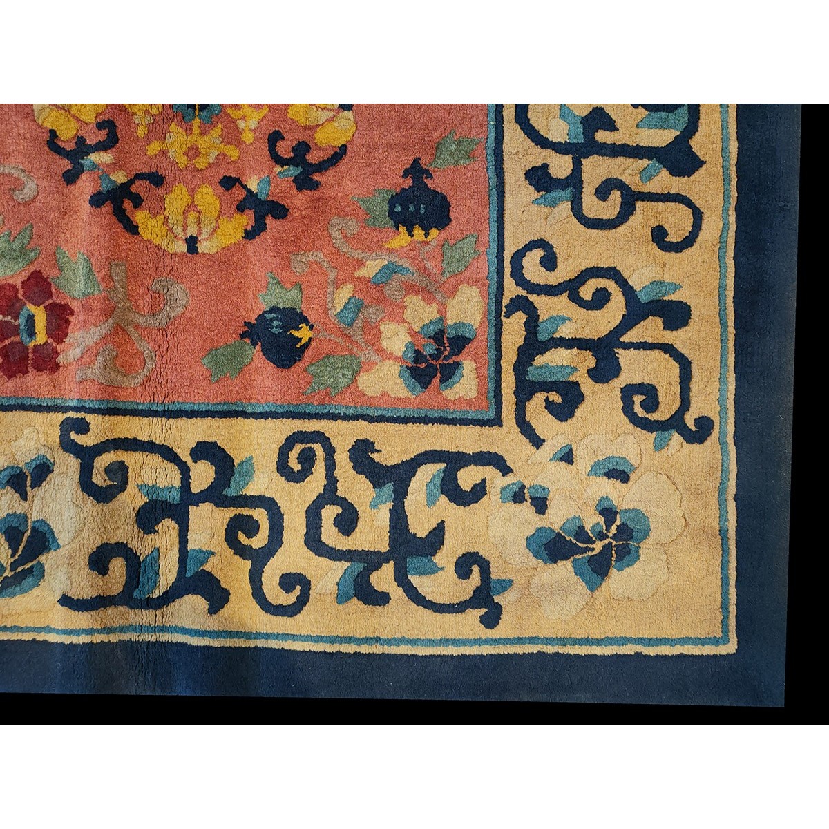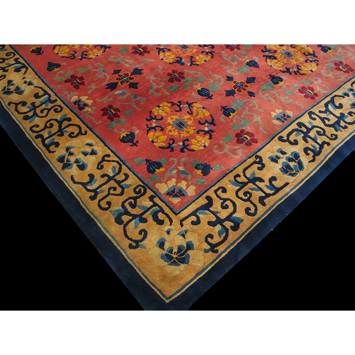 DescriptionChineseCarpets made in China proper. See entries Ningshia, Peking, Art Deco. Chinese - Art DecoAs the name implies, pieces woven between the wars for the Western market by mostly American owned firms especially Nichols and Fette, in thick heavy weaves using strong colors, asymmetric patterns and downplaying the Chinese-ness of the carpet. Nichols rugs are more strong toned than the pastel Fette. Most were woven in the coastal port city of Tientsin. Other lesser known workshops were also active. Some pieces are ultra-geometric and haute-Deco moderne in character: these are very rare. More frequent are pieces with bits of Chinese ornament: vases or other precious objects, paeonies, vines, fences, etc. Most common is the 9 x 12 size, in colors never found in mainstream Chinese rugs: backgrounds in black, mauve, purple, hot pink, orange, olive, employing the best synthetic chrome dyes of the period. Prices are still reasonable and carpets in top condition are available. | |