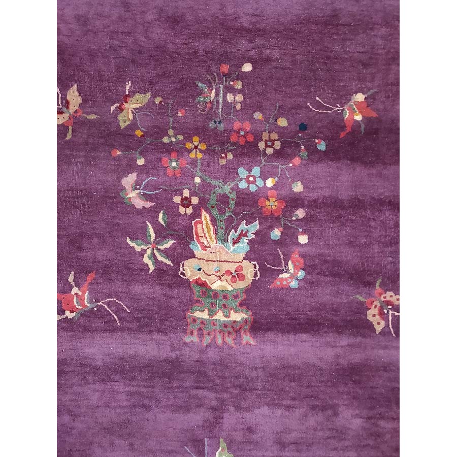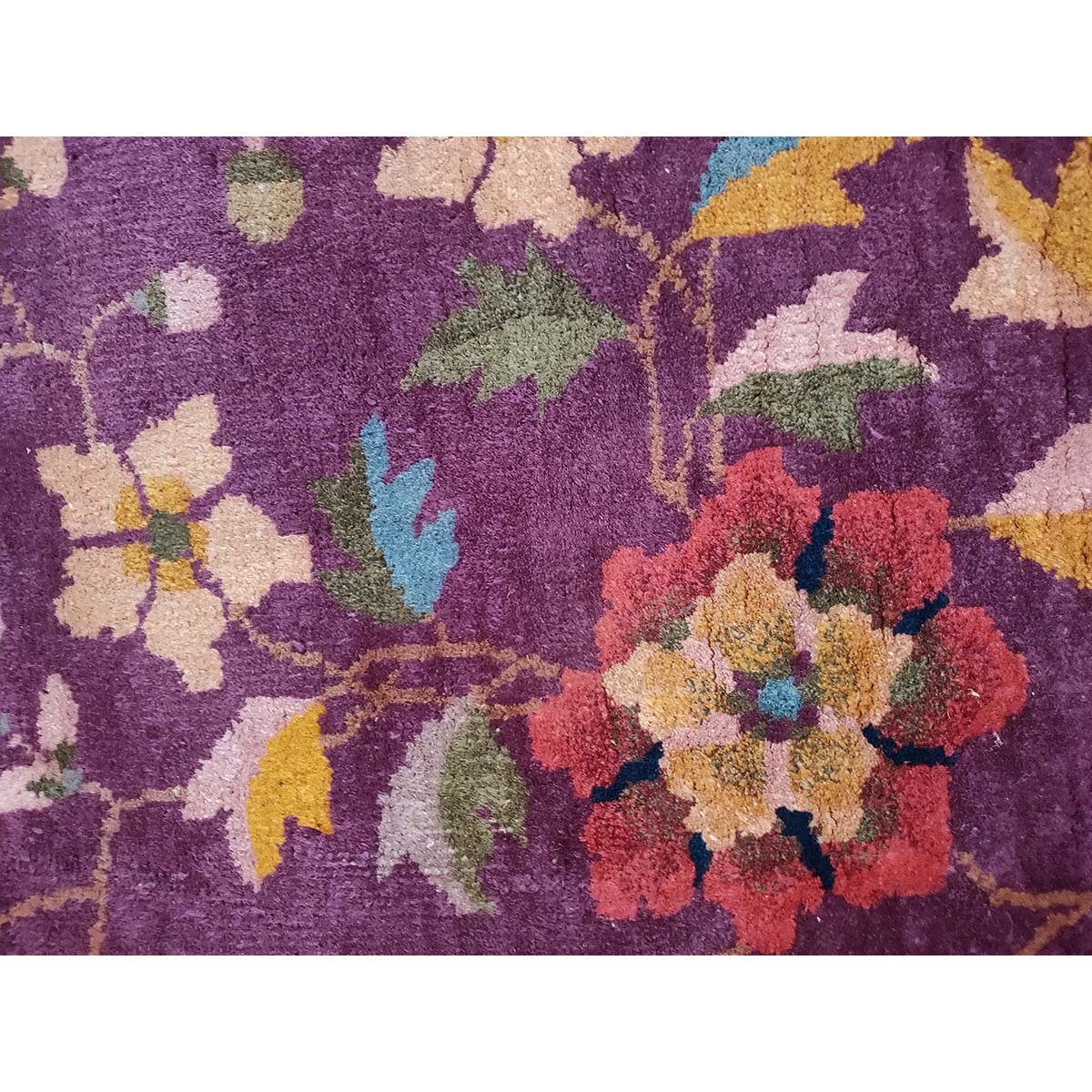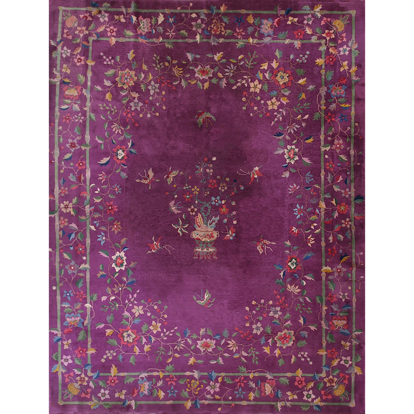 DescriptionChineseCarpets made in China proper. See entries Ningshia, Peking, Art Deco. Chinese - Art DecoAs the name implies, pieces woven between the wars for the Western market by mostly American owned firms especially Nichols and Fette, in thick heavy weaves using strong colors, asymmetric patterns and downplaying the Chinese-ness of the carpet. Nichols rugs are more strong toned than the pastel Fette. Most were woven in the coastal port city of Tientsin. Other lesser known workshops were also active. Some pieces are ultra-geometric and haute-Deco moderne in character: these are very rare. More frequent are pieces with bits of Chinese ornament: vases or other precious objects, paeonies, vines, fences, etc. Most common is the 9 x 12 size, in colors never found in mainstream Chinese rugs: backgrounds in black, mauve, purple, hot pink, orange, olive, employing the best synthetic chrome dyes of the period. Prices are still reasonable and carpets in top condition are available. | |
