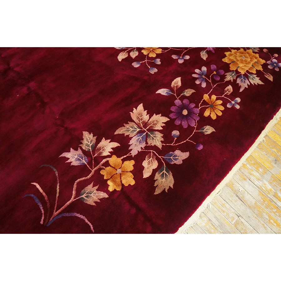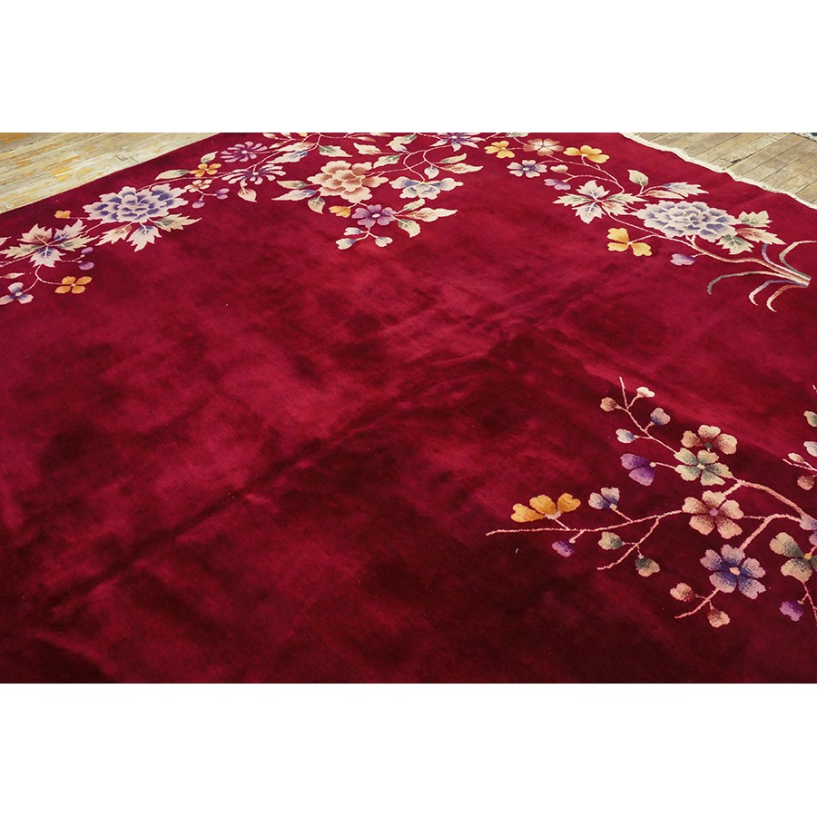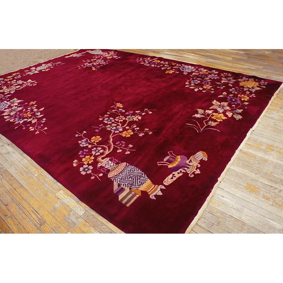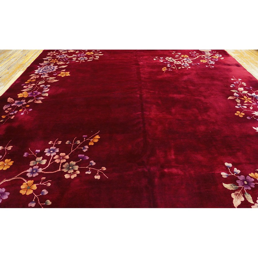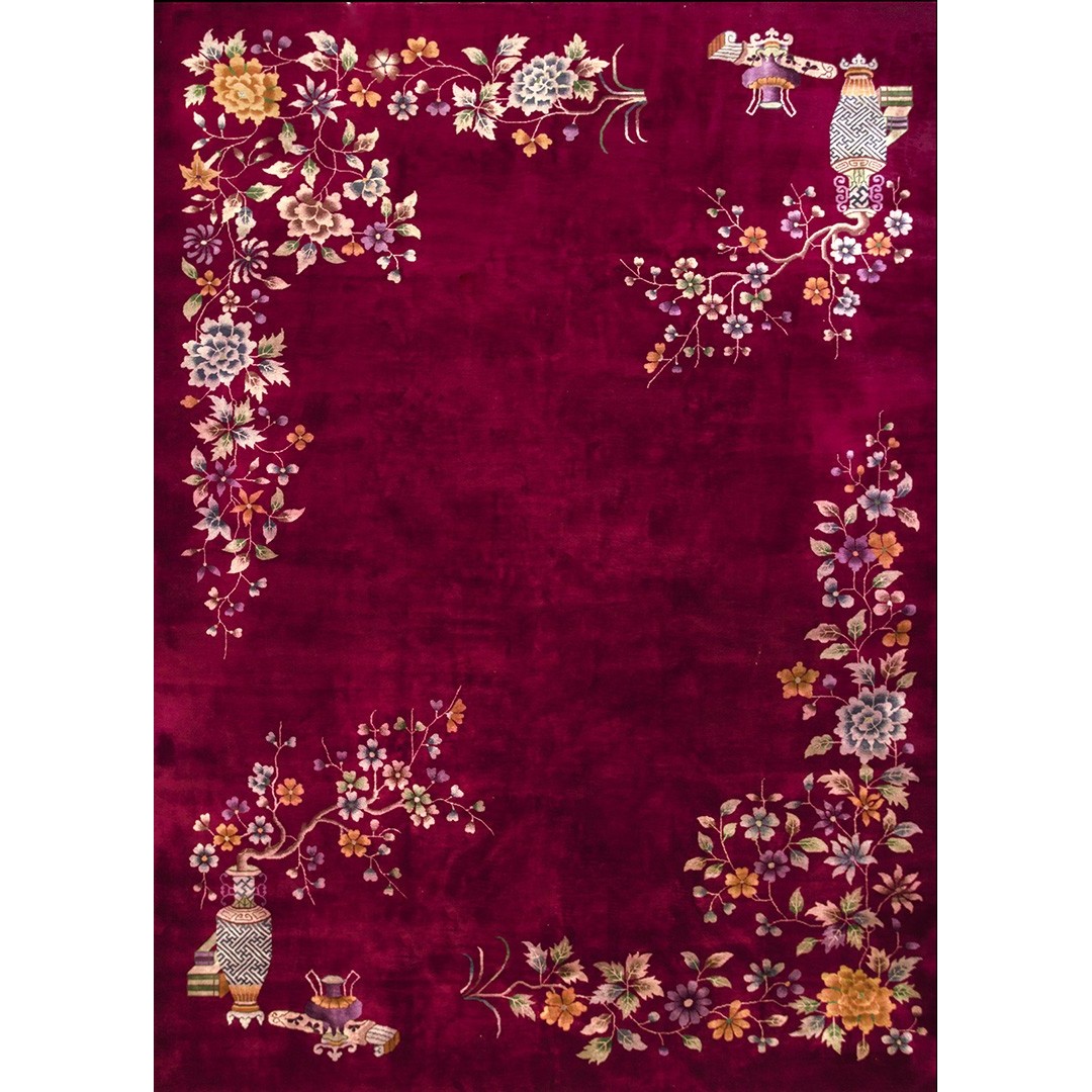 DescriptionChineseCarpets made in China proper. See entries Ningshia, Peking, Art Deco. Chinese - Art DecoAs the name implies, pieces woven between the wars for the Western market by mostly American owned firms especially Nichols and Fette, in thick heavy weaves using strong colors, asymmetric patterns and downplaying the Chinese-ness of the carpet. Nichols rugs are more strong toned than the pastel Fette. Most were woven in the coastal port city of Tientsin. Other lesser known workshops were also active. Some pieces are ultra-geometric and haute-Deco moderne in character: these are very rare. More frequent are pieces with bits of Chinese ornament: vases or other precious objects, paeonies, vines, fences, etc. Most common is the 9 x 12 size, in colors never found in mainstream Chinese rugs: backgrounds in black, mauve, purple, hot pink, orange, olive, employing the best synthetic chrome dyes of the period. Prices are still reasonable and carpets in top condition are available. | |