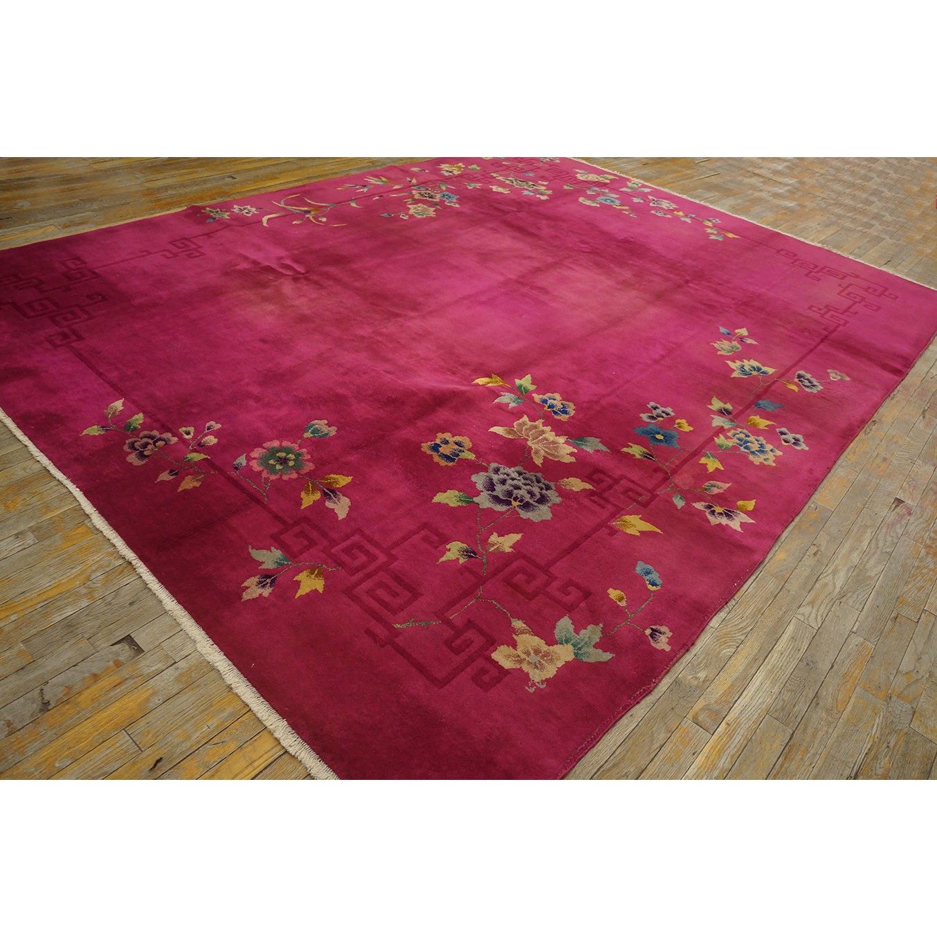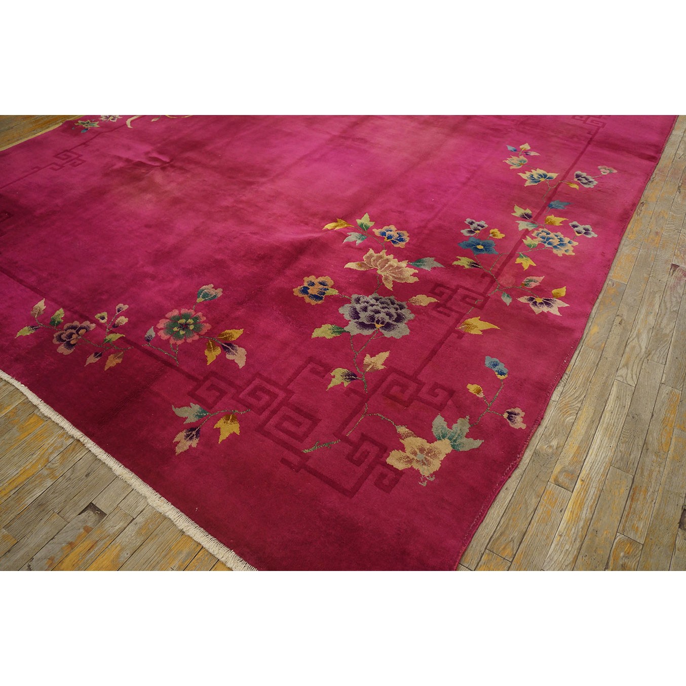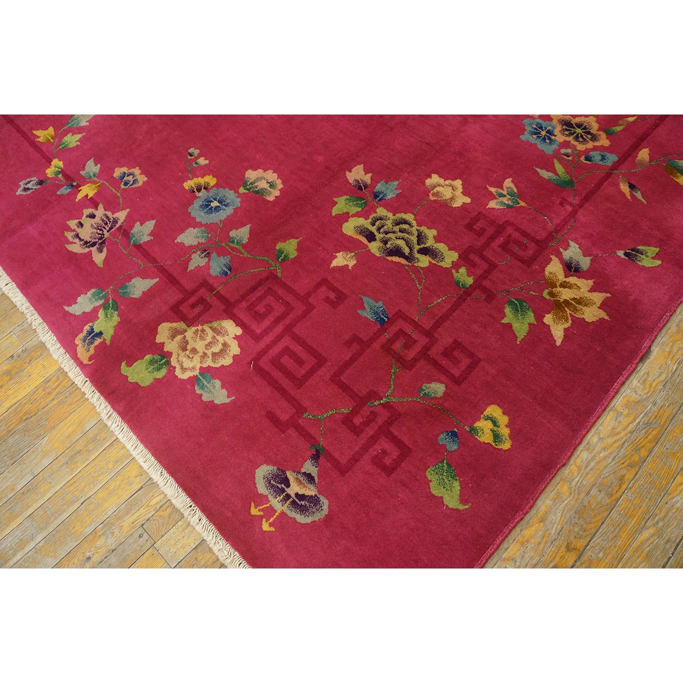 DescriptionChineseCarpets made in China proper. See entries Ningshia, Peking, Art Deco. Chinese - Art DecoAs the name implies, pieces woven between the wars for the Western market by mostly American owned firms especially Nichols and Fette, in thick heavy weaves using strong colors, asymmetric patterns and downplaying the Chinese-ness of the carpet. Nichols rugs are more strong toned than the pastel Fette. Most were woven in the coastal port city of Tientsin. Other lesser known workshops were also active. Some pieces are ultra-geometric and haute-Deco moderne in character: these are very rare. More frequent are pieces with bits of Chinese ornament: vases or other precious objects, paeonies, vines, fences, etc. Most common is the 9 x 12 size, in colors never found in mainstream Chinese rugs: backgrounds in black, mauve, purple, hot pink, orange, olive, employing the best synthetic chrome dyes of the period. Prices are still reasonable and carpets in top condition are available. | |