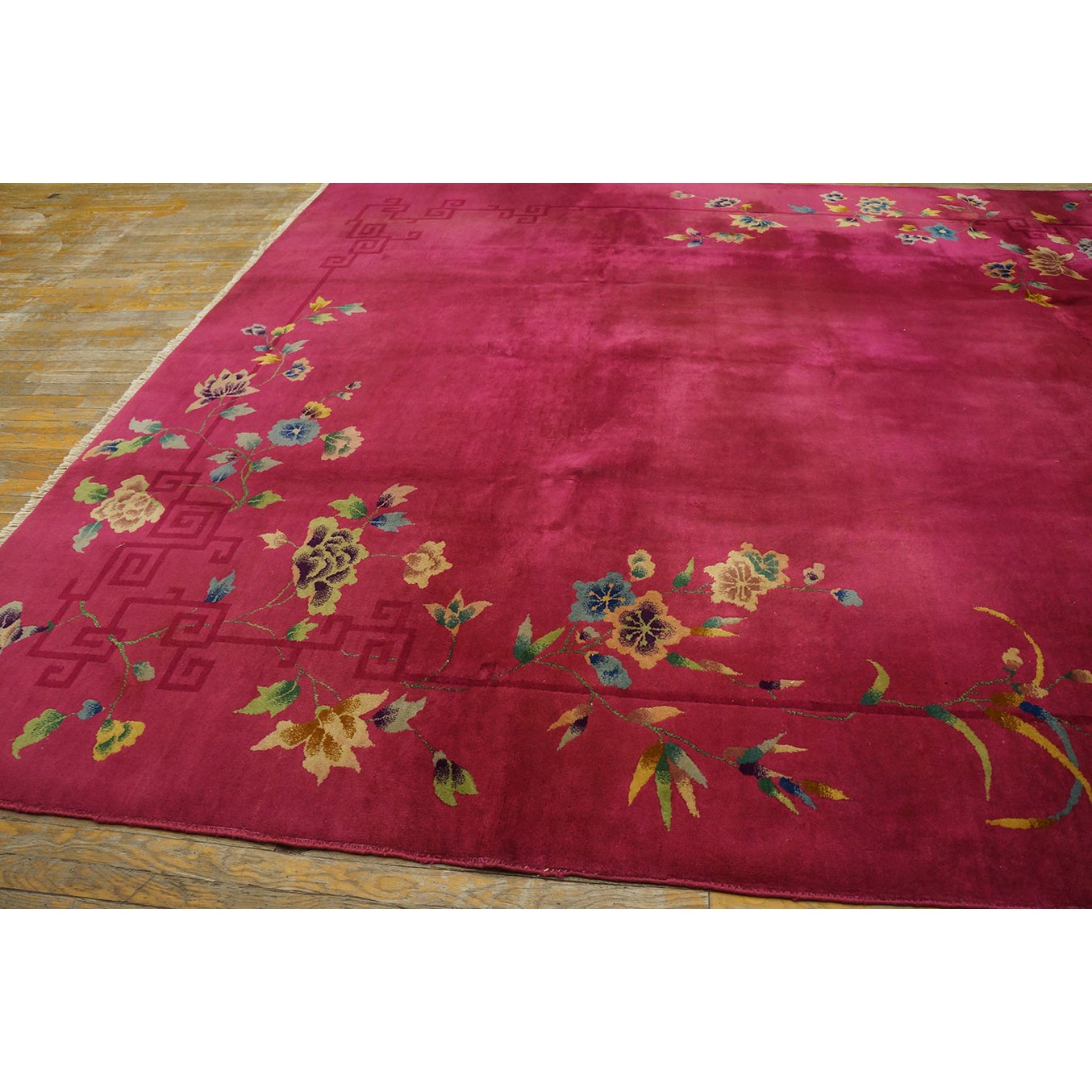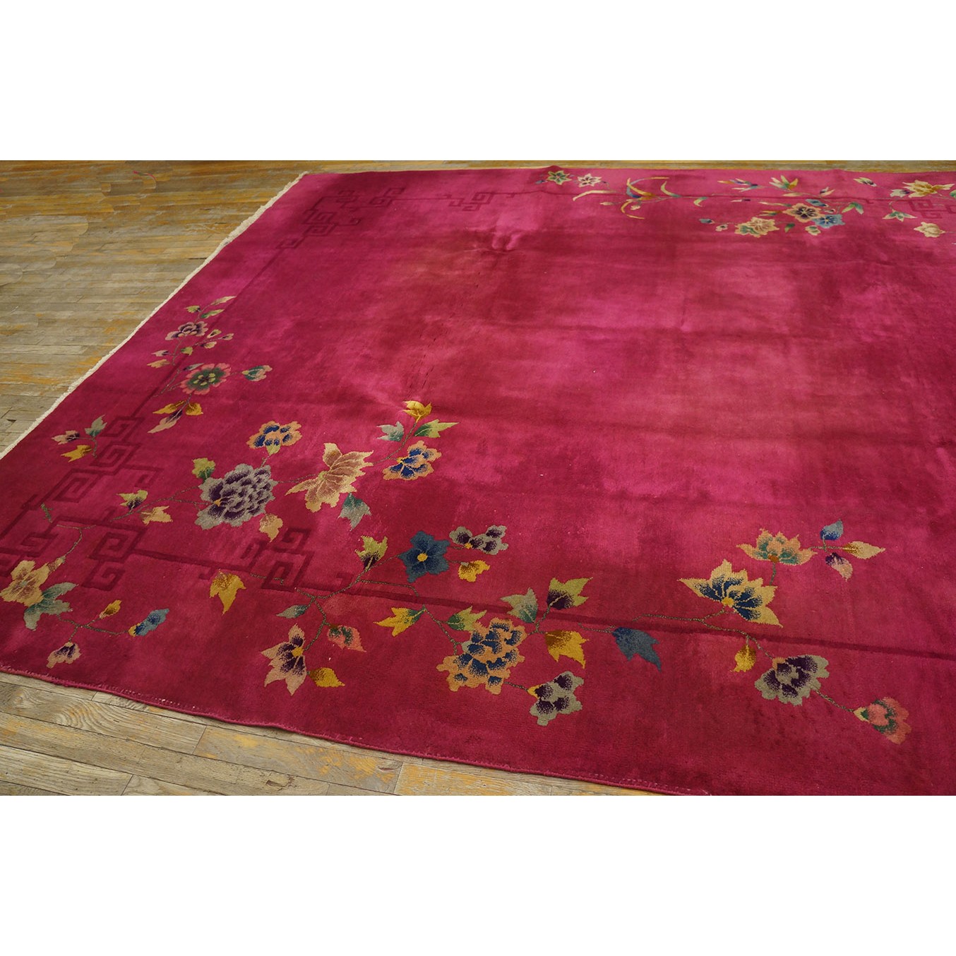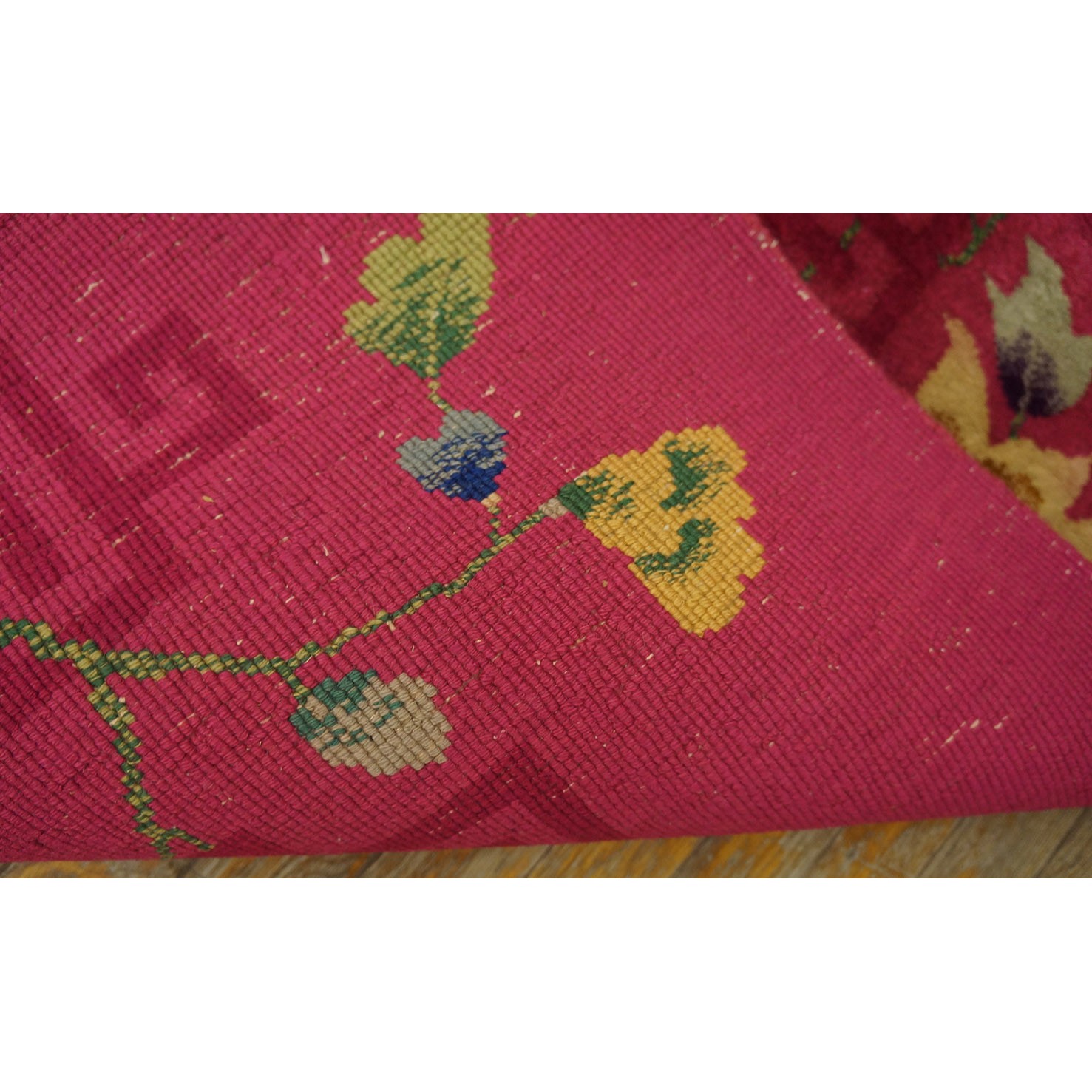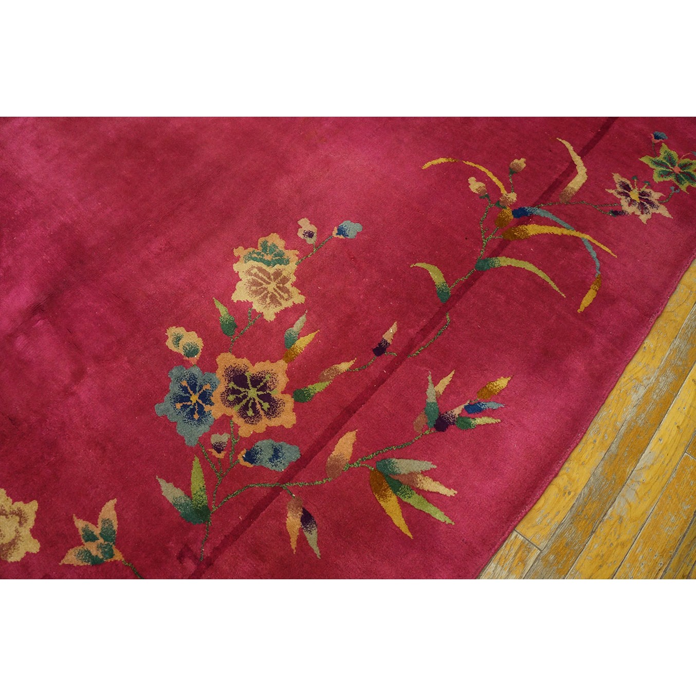 DescriptionChineseCarpets made in China proper. See entries Ningshia, Peking, Art Deco. Chinese - Art DecoAs the name implies, pieces woven between the wars for the Western market by mostly American owned firms especially Nichols and Fette, in thick heavy weaves using strong colors, asymmetric patterns and downplaying the Chinese-ness of the carpet. Nichols rugs are more strong toned than the pastel Fette. Most were woven in the coastal port city of Tientsin. Other lesser known workshops were also active. Some pieces are ultra-geometric and haute-Deco moderne in character: these are very rare. More frequent are pieces with bits of Chinese ornament: vases or other precious objects, paeonies, vines, fences, etc. Most common is the 9 x 12 size, in colors never found in mainstream Chinese rugs: backgrounds in black, mauve, purple, hot pink, orange, olive, employing the best synthetic chrome dyes of the period. Prices are still reasonable and carpets in top condition are available. | |