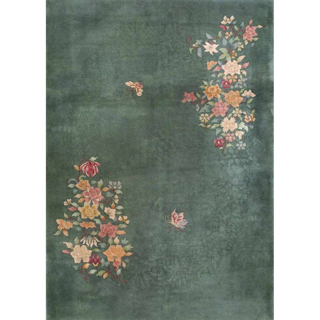 DescriptionChineseCarpets made in China proper. See entries Ningshia, Peking, Art Deco. Chinese - Art DecoAs the name implies, pieces woven between the wars for the Western market by mostly American owned firms especially Nichols and Fette, in thick heavy weaves using strong colors, asymmetric patterns and downplaying the Chinese-ness of the carpet. Nichols rugs are more strong toned than the pastel Fette. Most were woven in the coastal port city of Tientsin. Other lesser known workshops were also active. Some pieces are ultra-geometric and haute-Deco moderne in character: these are very rare. More frequent are pieces with bits of Chinese ornament: vases or other precious objects, paeonies, vines, fences, etc. Most common is the 9 x 12 size, in colors never found in mainstream Chinese rugs: backgrounds in black, mauve, purple, hot pink, orange, olive, employing the best synthetic chrome dyes of the period. Prices are still reasonable and carpets in top condition are available. | |