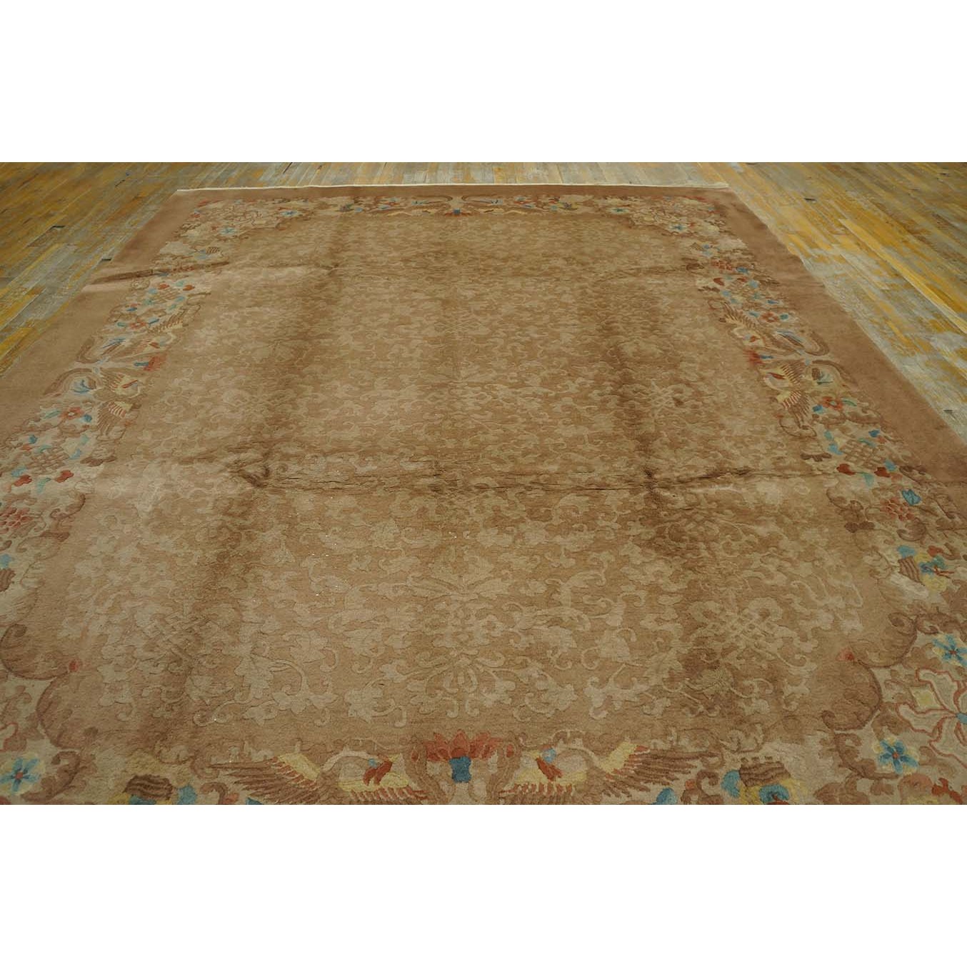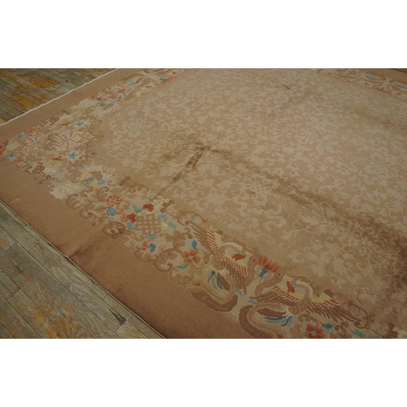 DescriptionChineseCarpets made in China proper. See entries Ningshia, Peking, Art Deco. Chinese - Art DecoAs the name implies, pieces woven between the wars for the Western market by mostly American owned firms especially Nichols and Fette, in thick heavy weaves using strong colors, asymmetric patterns and downplaying the Chinese-ness of the carpet. Nichols rugs are more strong toned than the pastel Fette. Most were woven in the coastal port city of Tientsin. Other lesser known workshops were also active. Some pieces are ultra-geometric and haute-Deco moderne in character: these are very rare. More frequent are pieces with bits of Chinese ornament: vases or other precious objects, paeonies, vines, fences, etc. Most common is the 9 x 12 size, in colors never found in mainstream Chinese rugs: backgrounds in black, mauve, purple, hot pink, orange, olive, employing the best synthetic chrome dyes of the period. Prices are still reasonable and carpets in top condition are available. | |