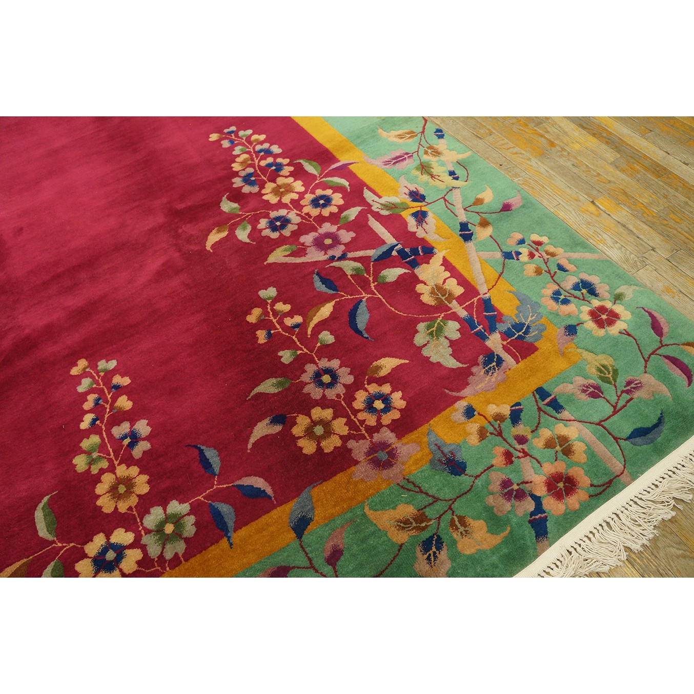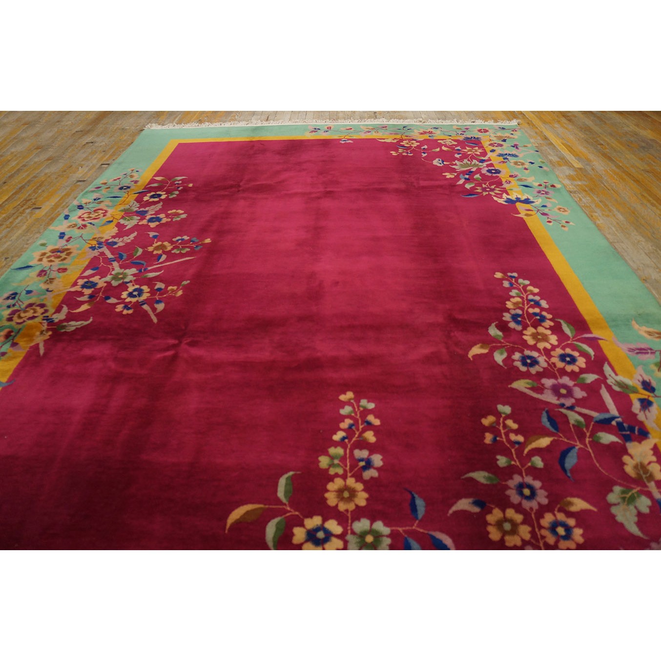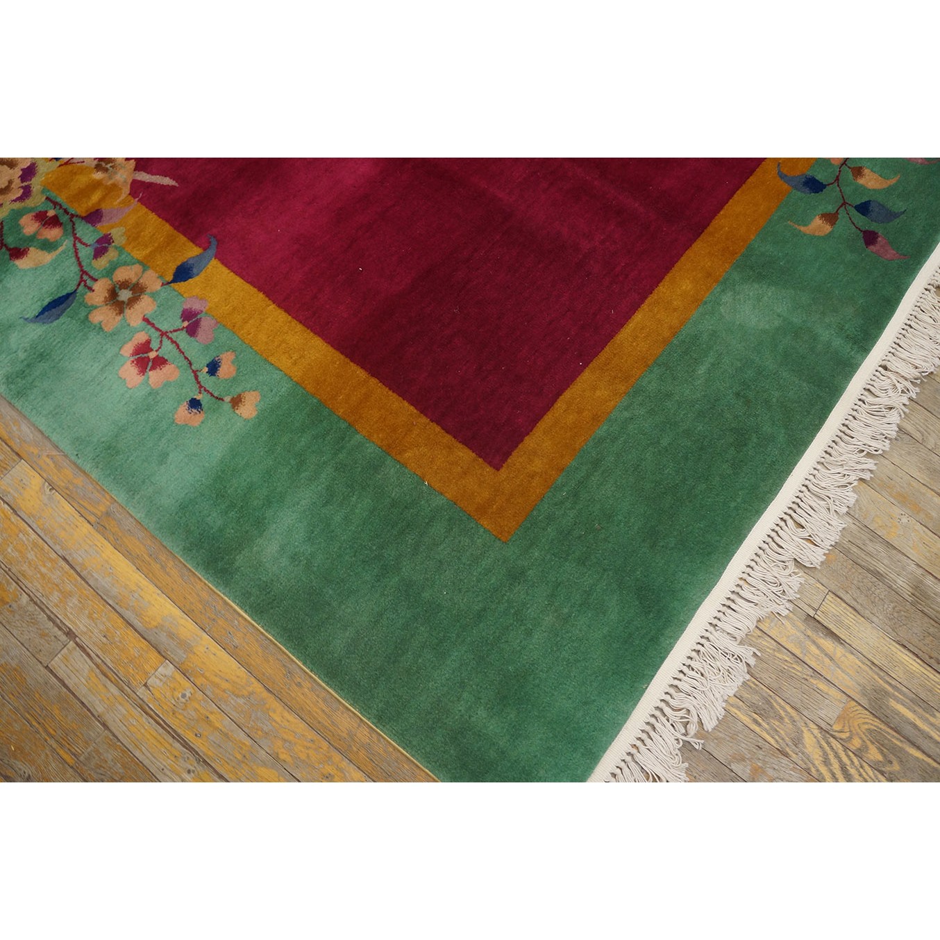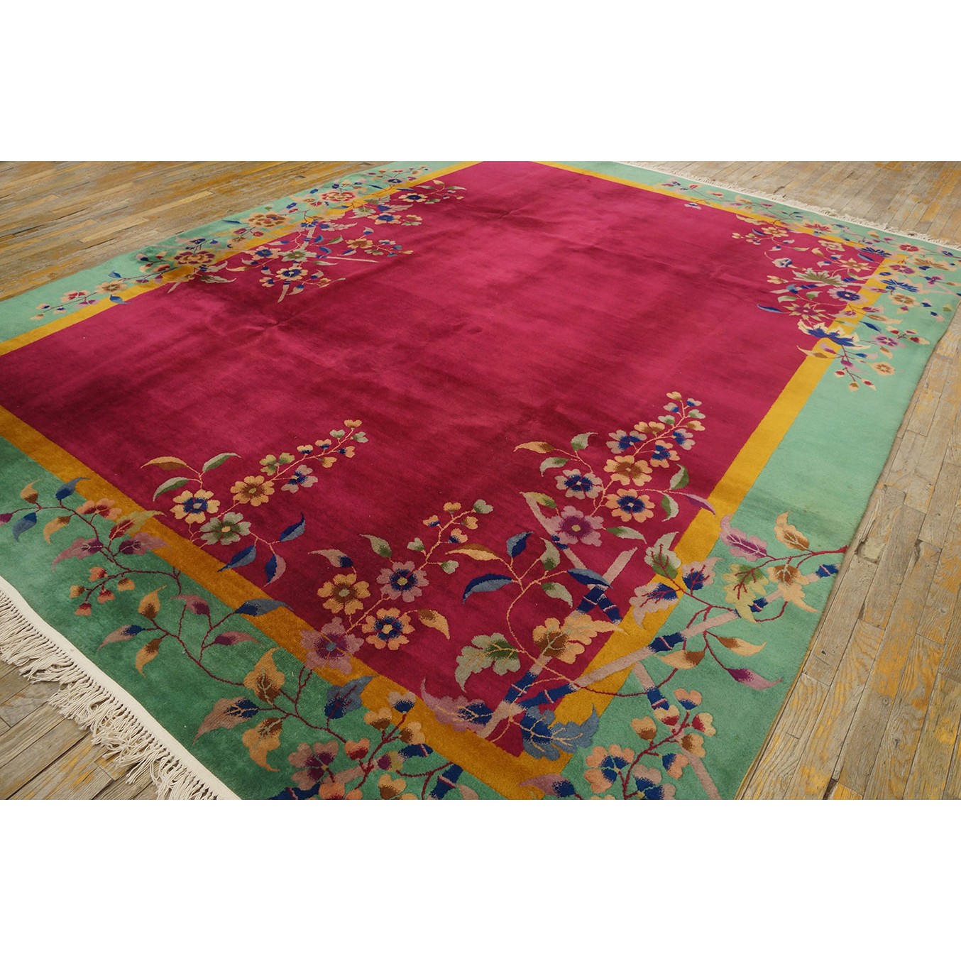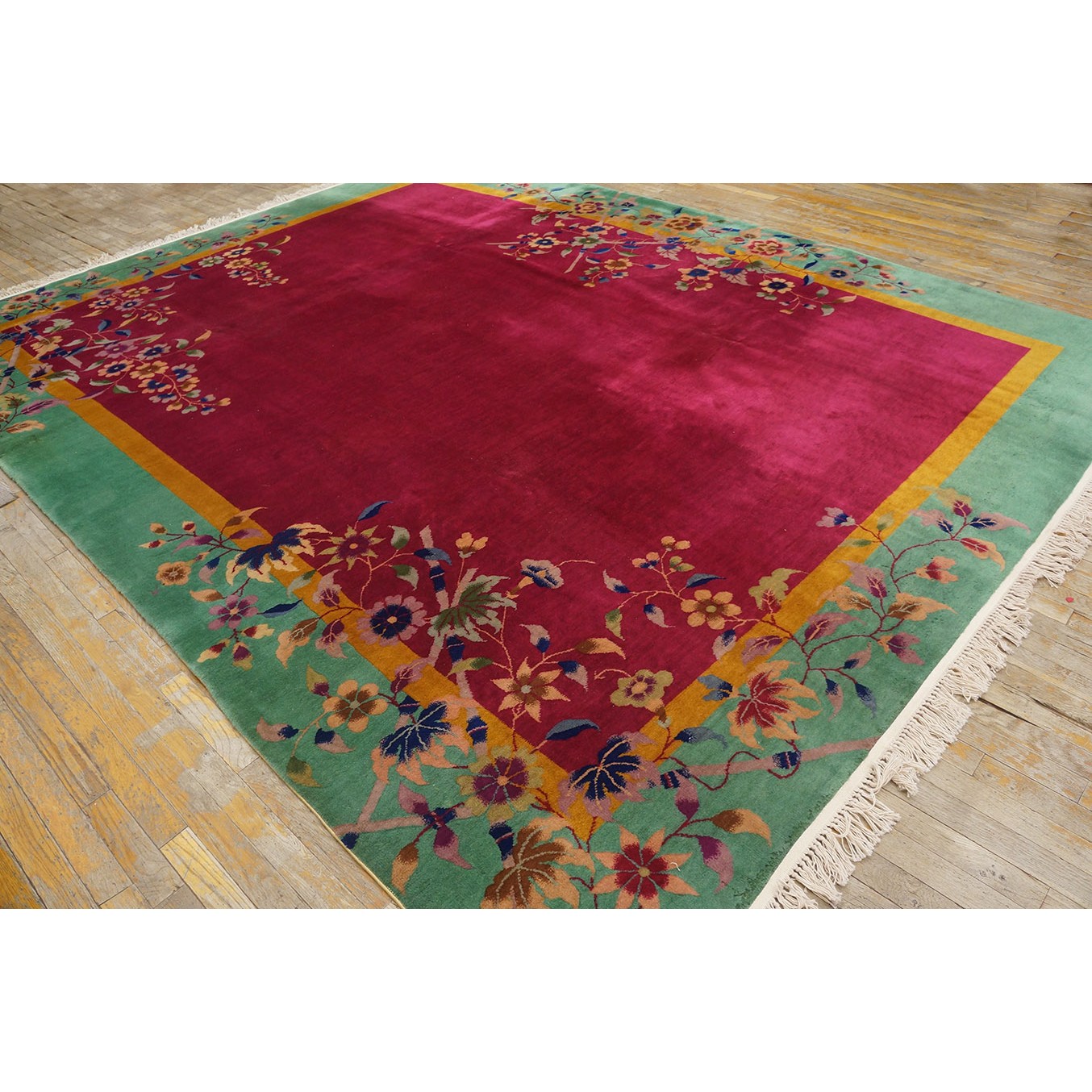 DescriptionChineseCarpets made in China proper. See entries Ningshia, Peking, Art Deco. Chinese - Art DecoAs the name implies, pieces woven between the wars for the Western market by mostly American owned firms especially Nichols and Fette, in thick heavy weaves using strong colors, asymmetric patterns and downplaying the Chinese-ness of the carpet. Nichols rugs are more strong toned than the pastel Fette. Most were woven in the coastal port city of Tientsin. Other lesser known workshops were also active. Some pieces are ultra-geometric and haute-Deco moderne in character: these are very rare. More frequent are pieces with bits of Chinese ornament: vases or other precious objects, paeonies, vines, fences, etc. Most common is the 9 x 12 size, in colors never found in mainstream Chinese rugs: backgrounds in black, mauve, purple, hot pink, orange, olive, employing the best synthetic chrome dyes of the period. Prices are still reasonable and carpets in top condition are available. | |
