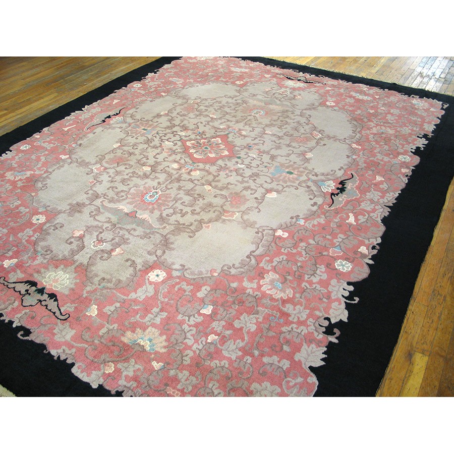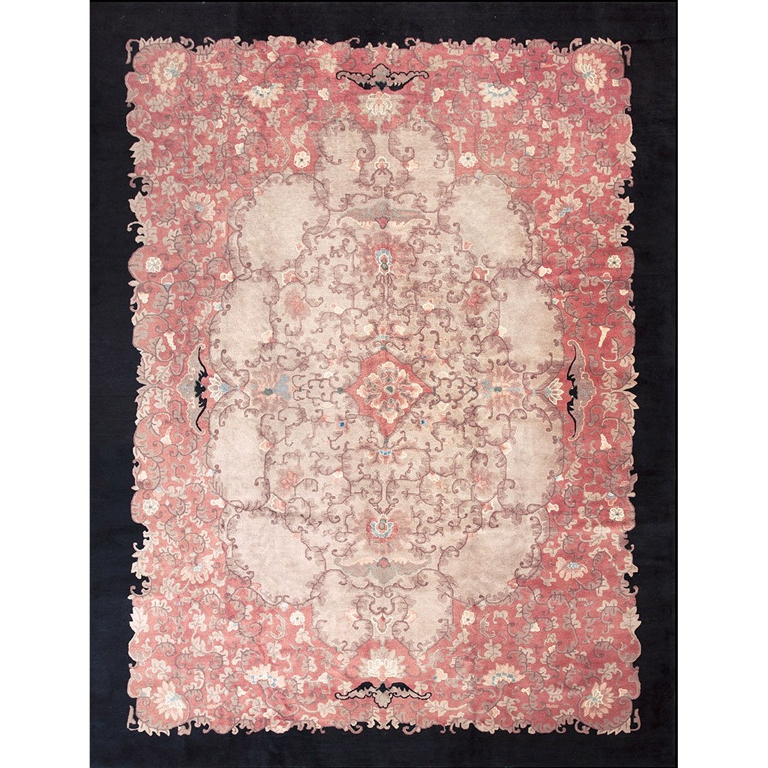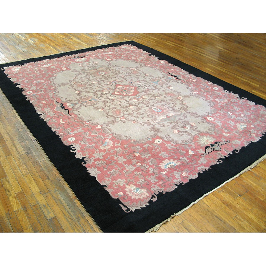 DescriptionChineseCarpets made in China proper. See entries Ningshia, Peking, Art Deco. Chinese - Art DecoAs the name implies, pieces woven between the wars for the Western market by mostly American owned firms especially Nichols and Fette, in thick heavy weaves using strong colors, asymmetric patterns and downplaying the Chinese-ness of the carpet. Nichols rugs are more strong toned than the pastel Fette. Most were woven in the coastal port city of Tientsin. Other lesser known workshops were also active. Some pieces are ultra-geometric and haute-Deco moderne in character: these are very rare. More frequent are pieces with bits of Chinese ornament: vases or other precious objects, paeonies, vines, fences, etc. Most common is the 9 x 12 size, in colors never found in mainstream Chinese rugs: backgrounds in black, mauve, purple, hot pink, orange, olive, employing the best synthetic chrome dyes of the period. Prices are still reasonable and carpets in top condition are available. | |