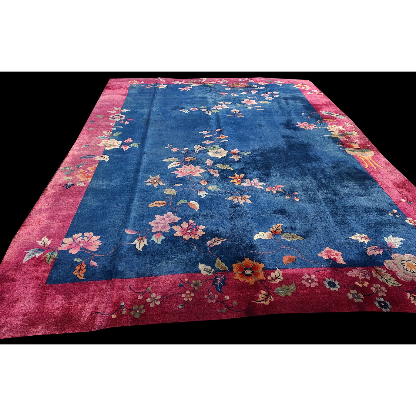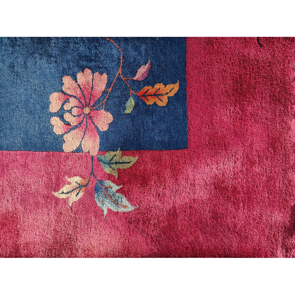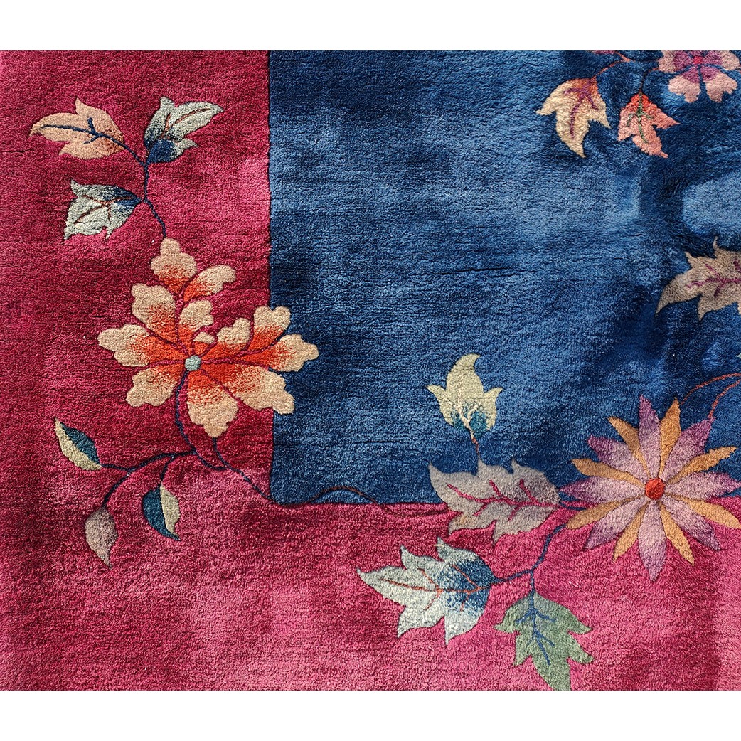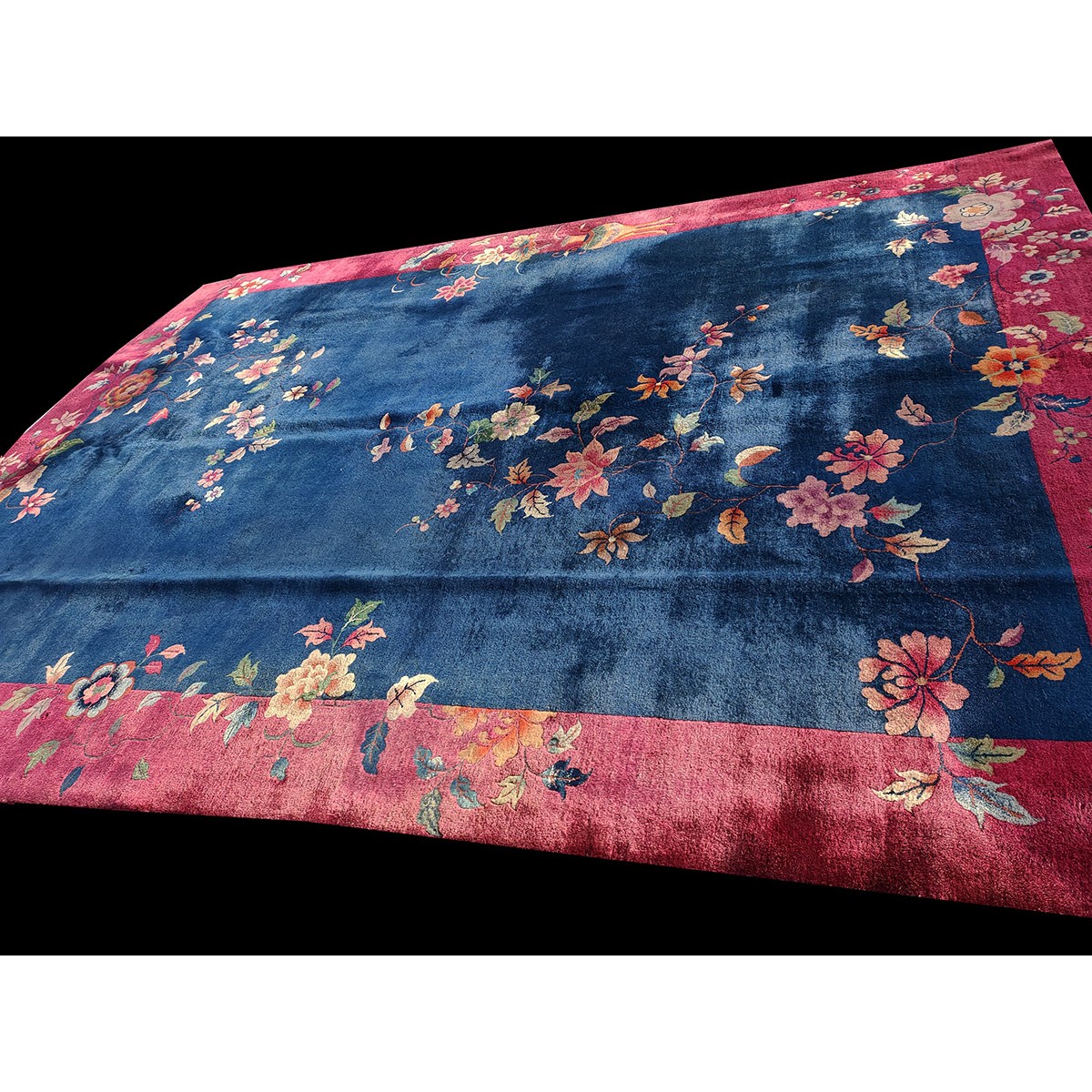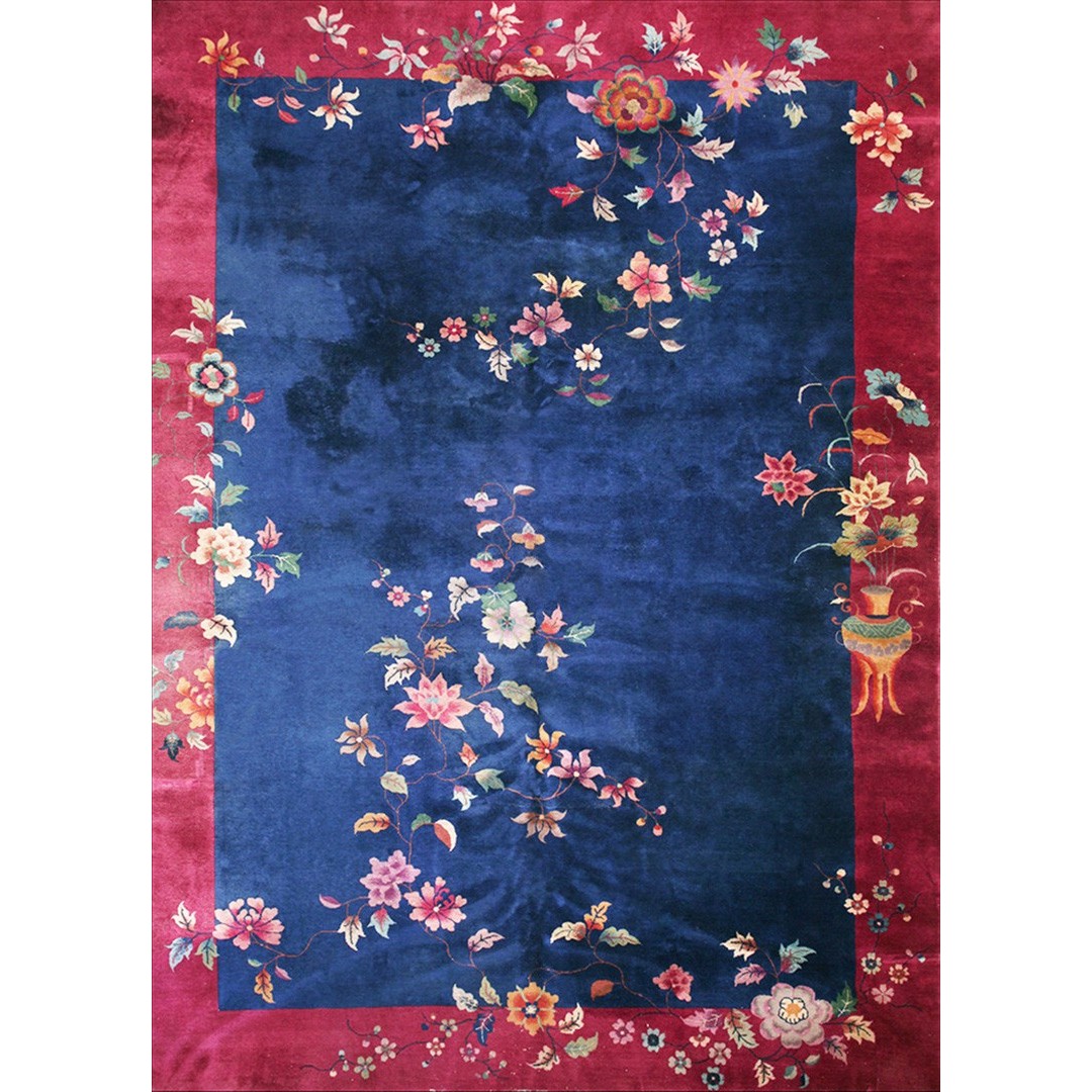 DescriptionChineseCarpets made in China proper. See entries Ningshia, Peking, Art Deco. Chinese - Art DecoAs the name implies, pieces woven between the wars for the Western market by mostly American owned firms especially Nichols and Fette, in thick heavy weaves using strong colors, asymmetric patterns and downplaying the Chinese-ness of the carpet. Nichols rugs are more strong toned than the pastel Fette. Most were woven in the coastal port city of Tientsin. Other lesser known workshops were also active. Some pieces are ultra-geometric and haute-Deco moderne in character: these are very rare. More frequent are pieces with bits of Chinese ornament: vases or other precious objects, paeonies, vines, fences, etc. Most common is the 9 x 12 size, in colors never found in mainstream Chinese rugs: backgrounds in black, mauve, purple, hot pink, orange, olive, employing the best synthetic chrome dyes of the period. Prices are still reasonable and carpets in top condition are available. | |