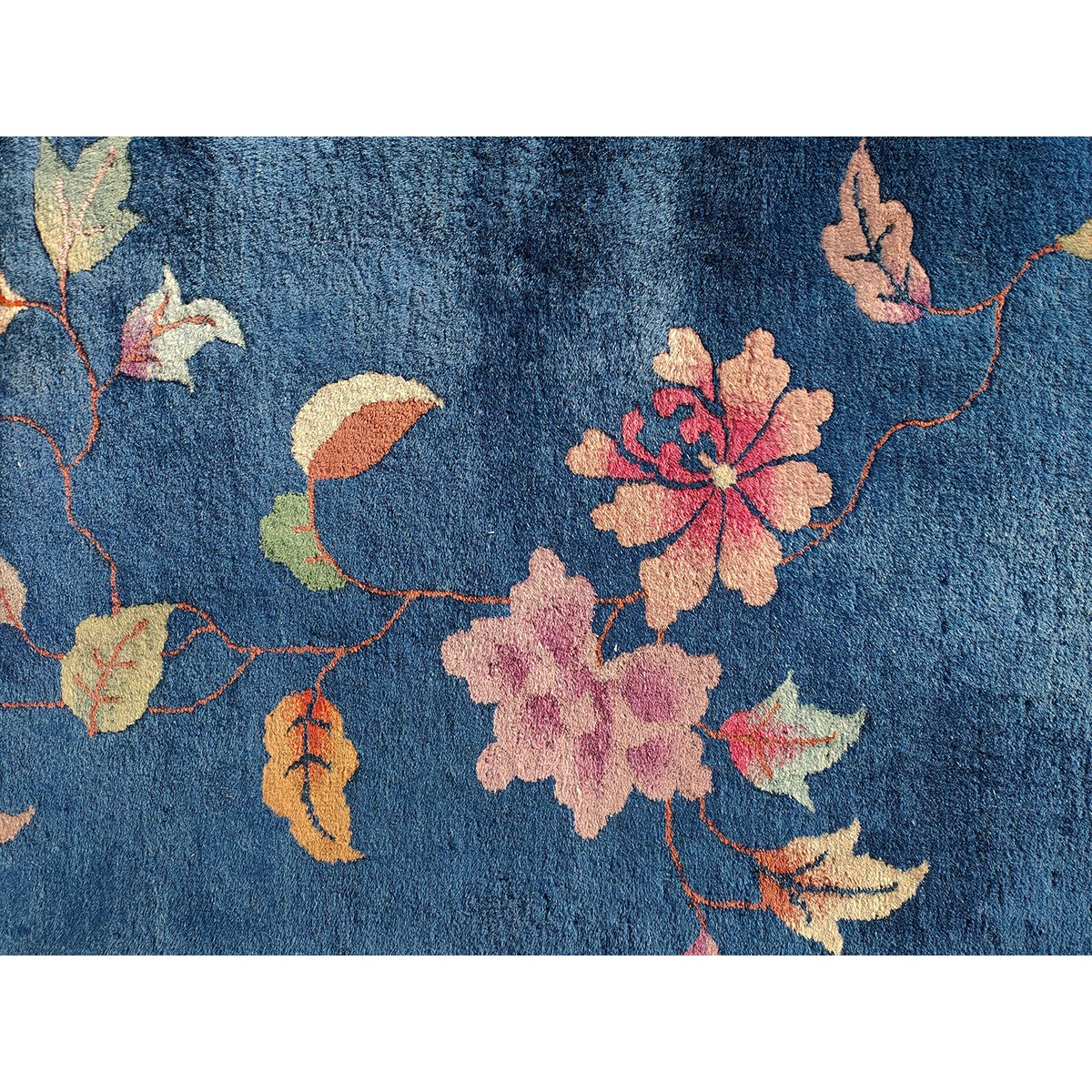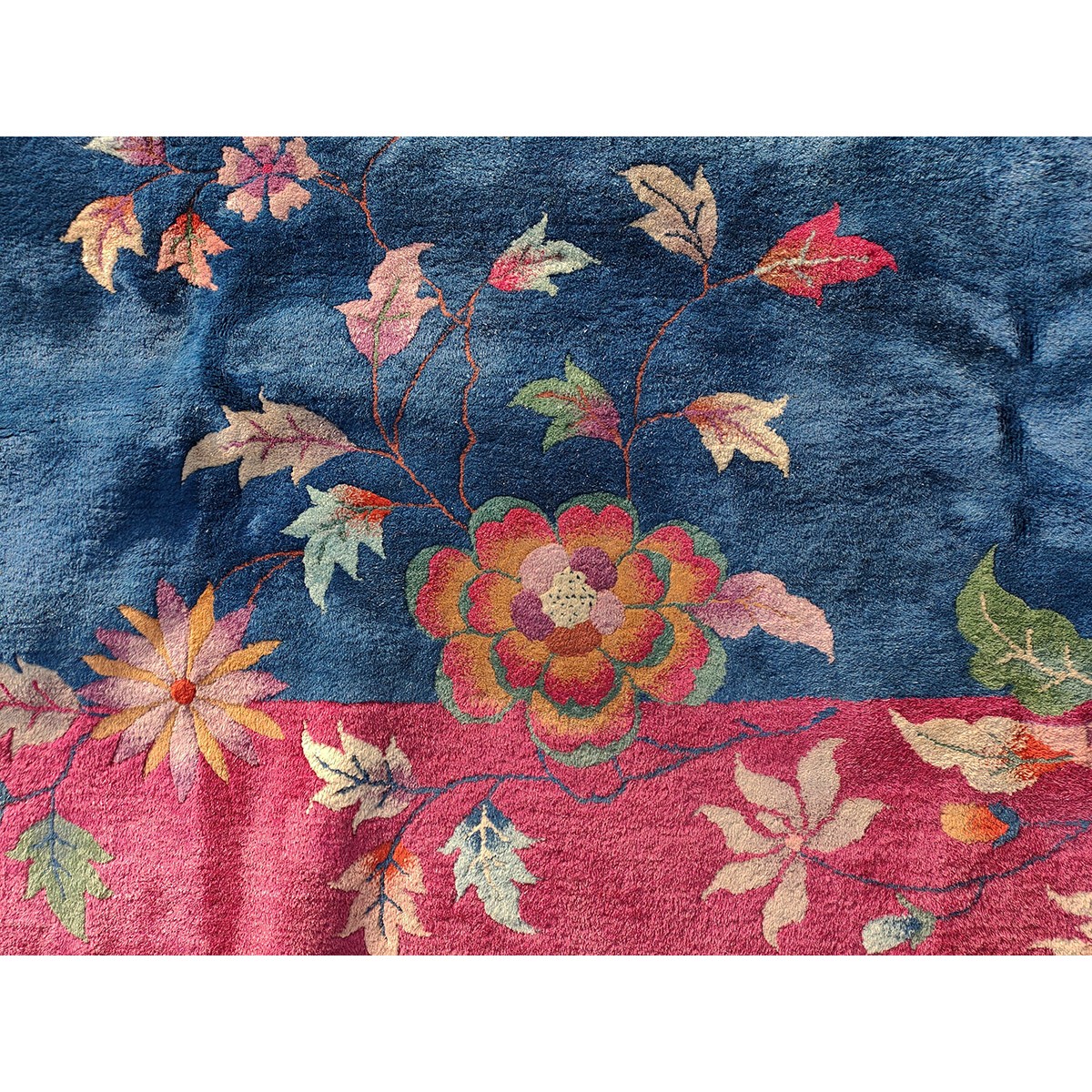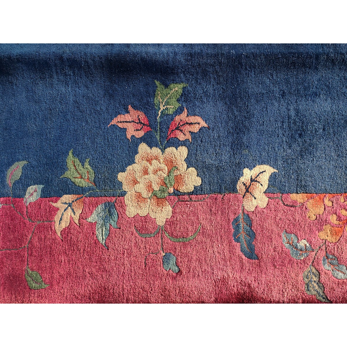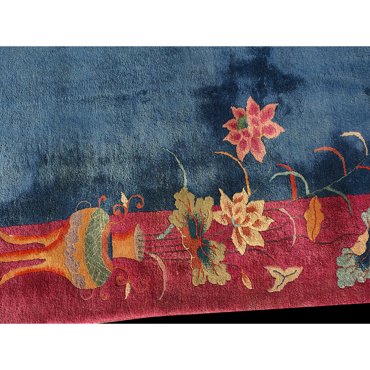 DescriptionChineseCarpets made in China proper. See entries Ningshia, Peking, Art Deco. Chinese - Art DecoAs the name implies, pieces woven between the wars for the Western market by mostly American owned firms especially Nichols and Fette, in thick heavy weaves using strong colors, asymmetric patterns and downplaying the Chinese-ness of the carpet. Nichols rugs are more strong toned than the pastel Fette. Most were woven in the coastal port city of Tientsin. Other lesser known workshops were also active. Some pieces are ultra-geometric and haute-Deco moderne in character: these are very rare. More frequent are pieces with bits of Chinese ornament: vases or other precious objects, paeonies, vines, fences, etc. Most common is the 9 x 12 size, in colors never found in mainstream Chinese rugs: backgrounds in black, mauve, purple, hot pink, orange, olive, employing the best synthetic chrome dyes of the period. Prices are still reasonable and carpets in top condition are available. | |