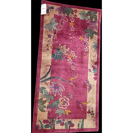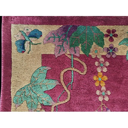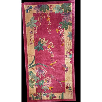DescriptionChineseCarpets made in China proper. See entries Ningshia, Peking, Art Deco. Chinese - Art DecoAs the name implies, pieces woven between the wars for the Western market by mostly American owned firms especially Nichols and Fette, in thick heavy weaves using strong colors, asymmetric patterns and downplaying the Chinese-ness of the carpet. Nichols rugs are more strong toned than the pastel Fette. Most were woven in the coastal port city of Tientsin. Other lesser known workshops were also active. Some pieces are ultra-geometric and haute-Deco moderne in character: these are very rare. More frequent are pieces with bits of Chinese ornament: vases or other precious objects, paeonies, vines, fences, etc. Most common is the 9 x 12 size, in colors never found in mainstream Chinese rugs: backgrounds in black, mauve, purple, hot pink, orange, olive, employing the best synthetic chrome dyes of the period. Prices are still reasonable and carpets in top condition are available. | |