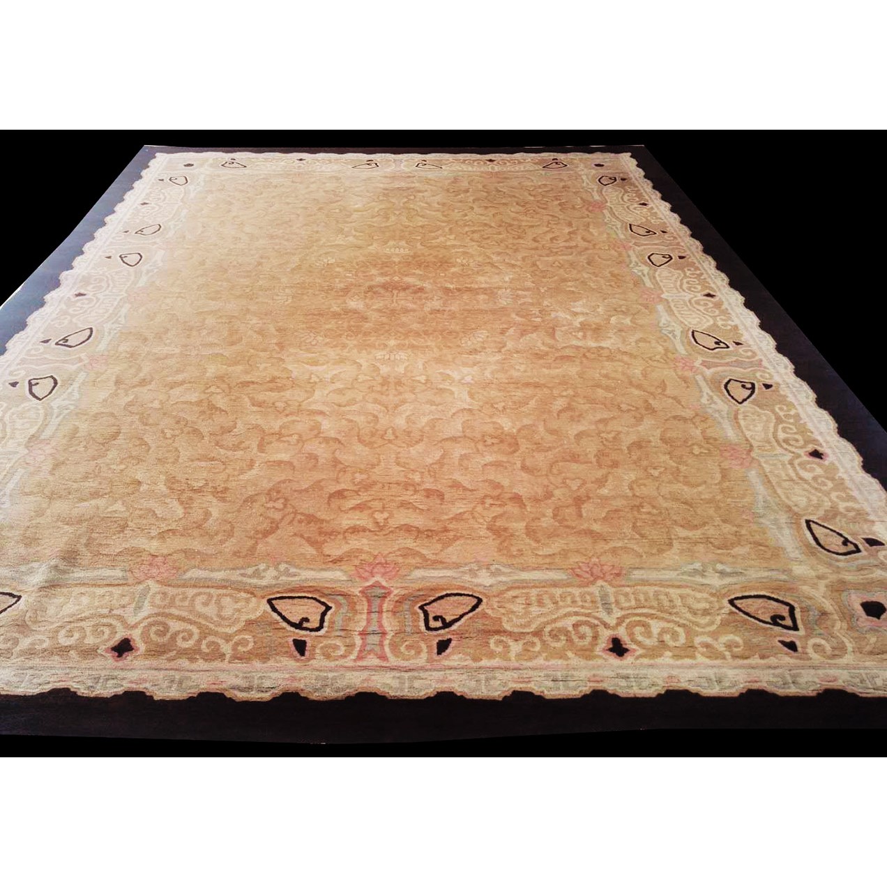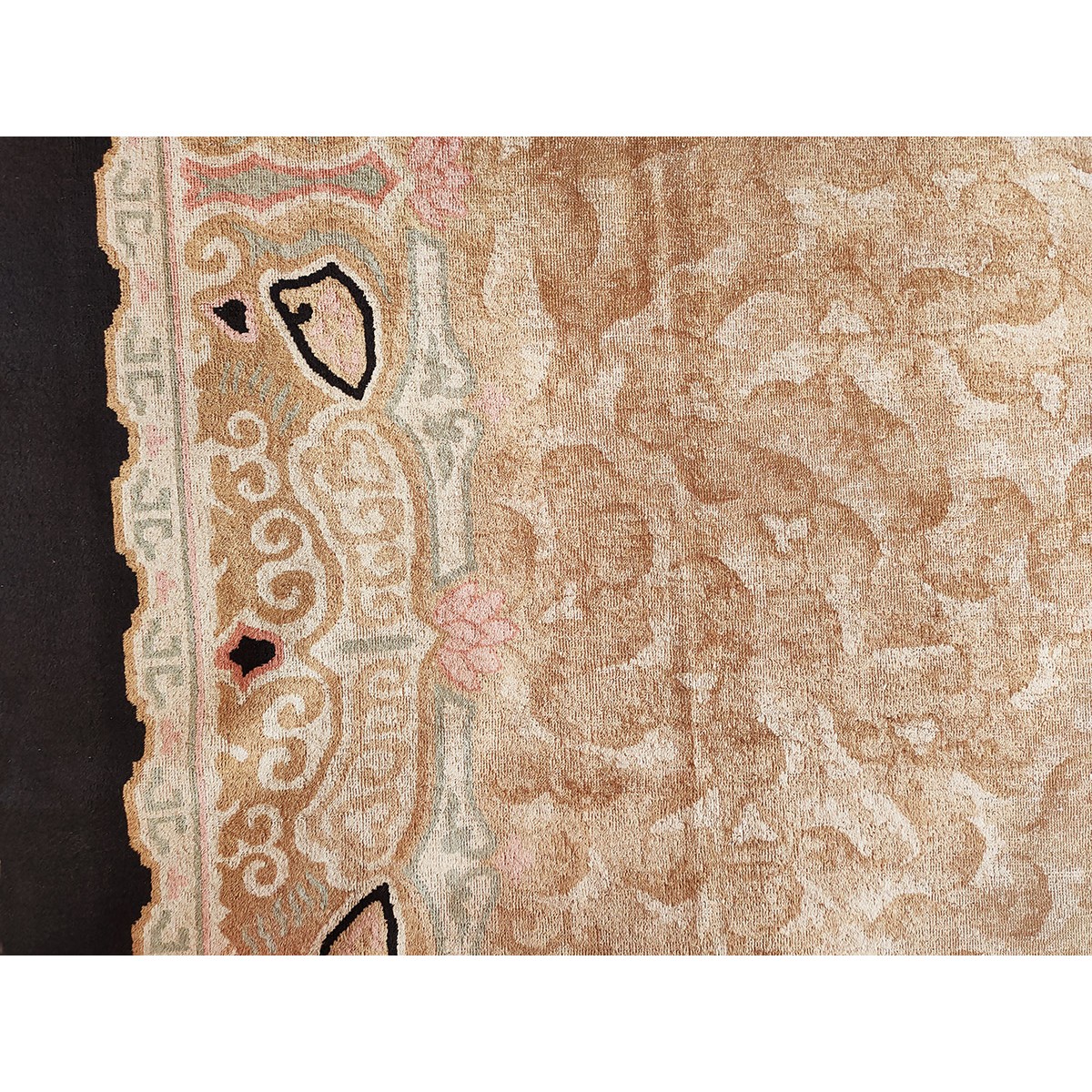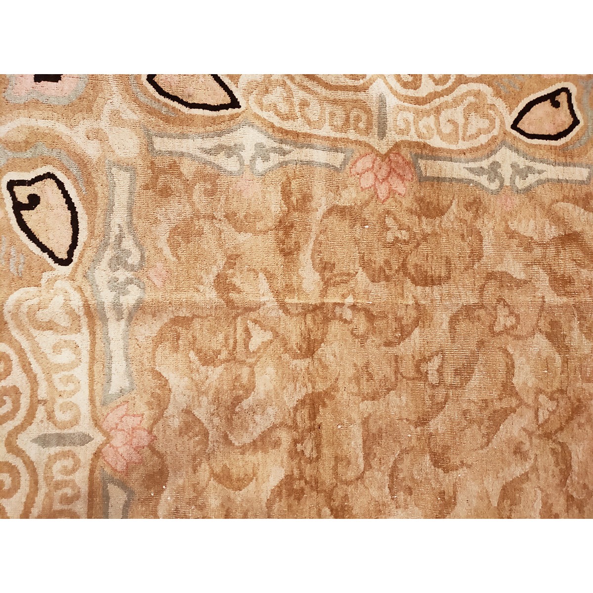 DescriptionChineseCarpets made in China proper. See entries Ningshia, Peking, Art Deco. Chinese - Art DecoAs the name implies, pieces woven between the wars for the Western market by mostly American owned firms especially Nichols and Fette, in thick heavy weaves using strong colors, asymmetric patterns and downplaying the Chinese-ness of the carpet. Nichols rugs are more strong toned than the pastel Fette. Most were woven in the coastal port city of Tientsin. Other lesser known workshops were also active. Some pieces are ultra-geometric and haute-Deco moderne in character: these are very rare. More frequent are pieces with bits of Chinese ornament: vases or other precious objects, paeonies, vines, fences, etc. Most common is the 9 x 12 size, in colors never found in mainstream Chinese rugs: backgrounds in black, mauve, purple, hot pink, orange, olive, employing the best synthetic chrome dyes of the period. Prices are still reasonable and carpets in top condition are available. | |