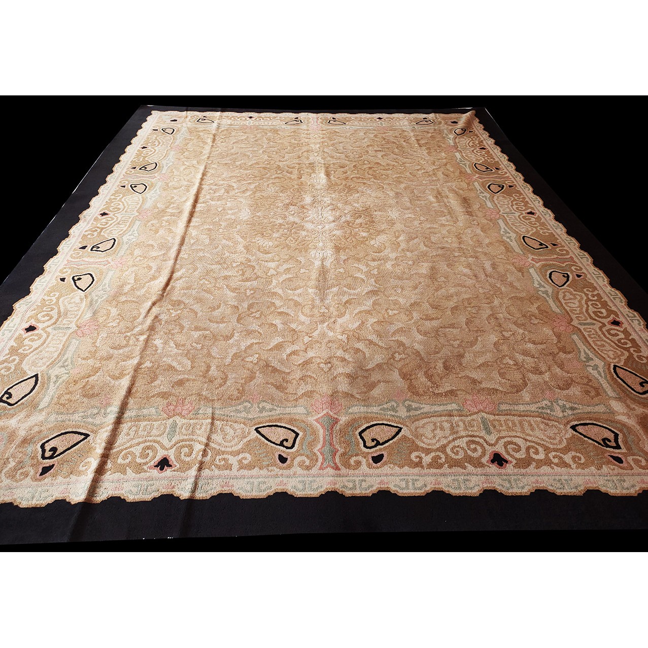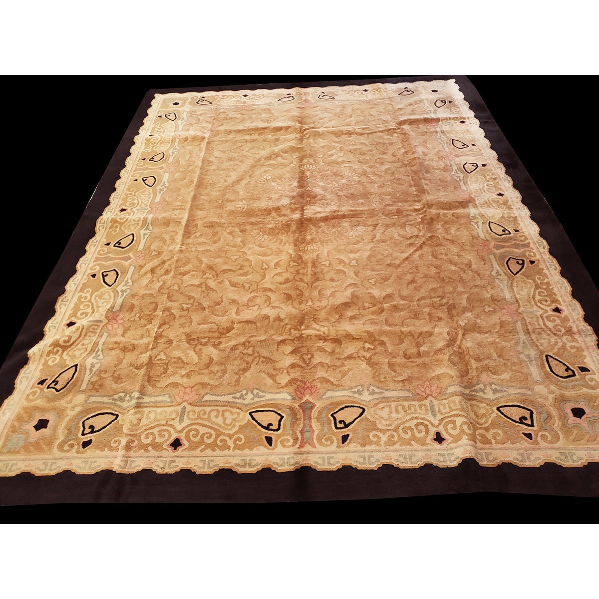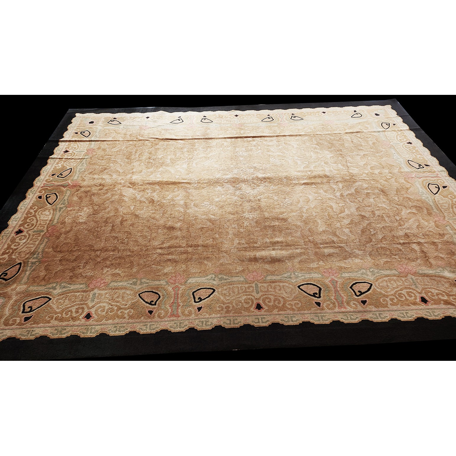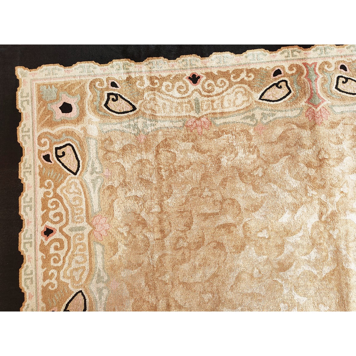 DescriptionChineseCarpets made in China proper. See entries Ningshia, Peking, Art Deco. Chinese - Art DecoAs the name implies, pieces woven between the wars for the Western market by mostly American owned firms especially Nichols and Fette, in thick heavy weaves using strong colors, asymmetric patterns and downplaying the Chinese-ness of the carpet. Nichols rugs are more strong toned than the pastel Fette. Most were woven in the coastal port city of Tientsin. Other lesser known workshops were also active. Some pieces are ultra-geometric and haute-Deco moderne in character: these are very rare. More frequent are pieces with bits of Chinese ornament: vases or other precious objects, paeonies, vines, fences, etc. Most common is the 9 x 12 size, in colors never found in mainstream Chinese rugs: backgrounds in black, mauve, purple, hot pink, orange, olive, employing the best synthetic chrome dyes of the period. Prices are still reasonable and carpets in top condition are available. | |