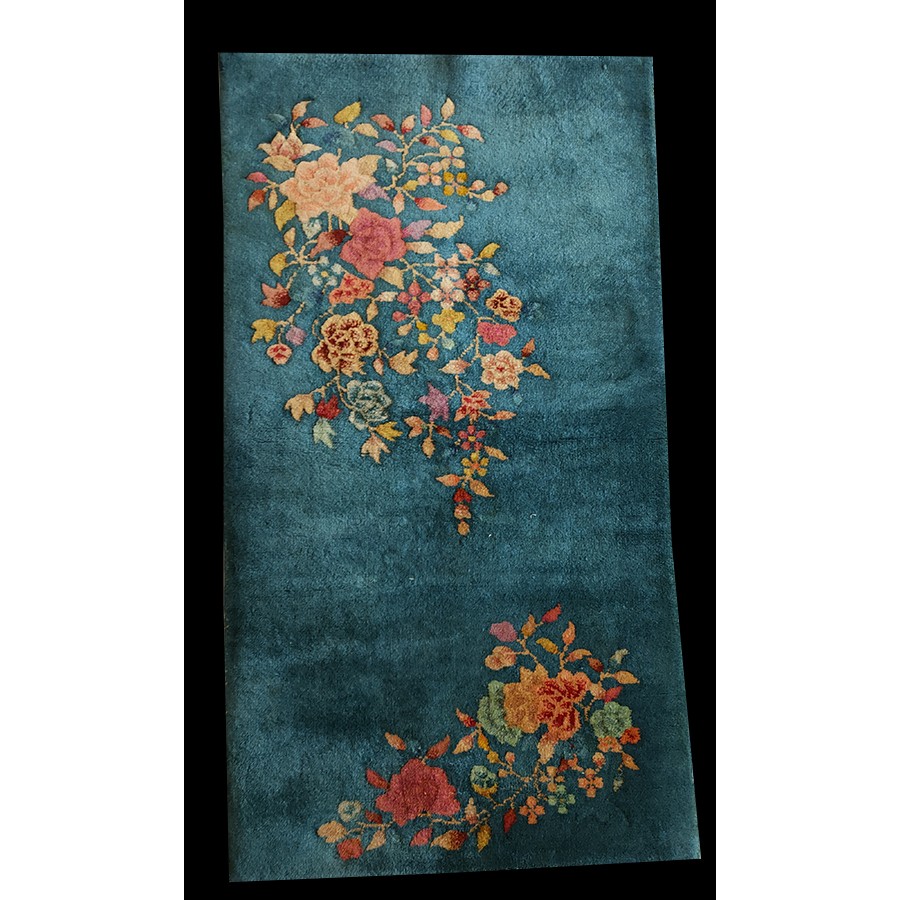 DescriptionChineseCarpets made in China proper. See entries Ningshia, Peking, Art Deco. Chinese - Art DecoAs the name implies, pieces woven between the wars for the Western market by mostly American owned firms especially Nichols and Fette, in thick heavy weaves using strong colors, asymmetric patterns and downplaying the Chinese-ness of the carpet. Nichols rugs are more strong toned than the pastel Fette. Most were woven in the coastal port city of Tientsin. Other lesser known workshops were also active. Some pieces are ultra-geometric and haute-Deco moderne in character: these are very rare. More frequent are pieces with bits of Chinese ornament: vases or other precious objects, paeonies, vines, fences, etc. Most common is the 9 x 12 size, in colors never found in mainstream Chinese rugs: backgrounds in black, mauve, purple, hot pink, orange, olive, employing the best synthetic chrome dyes of the period. Prices are still reasonable and carpets in top condition are available. | |