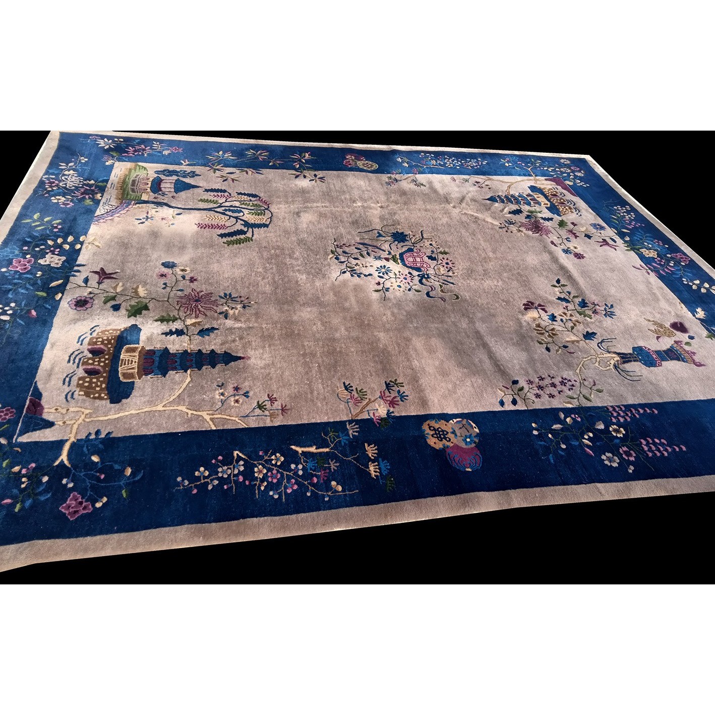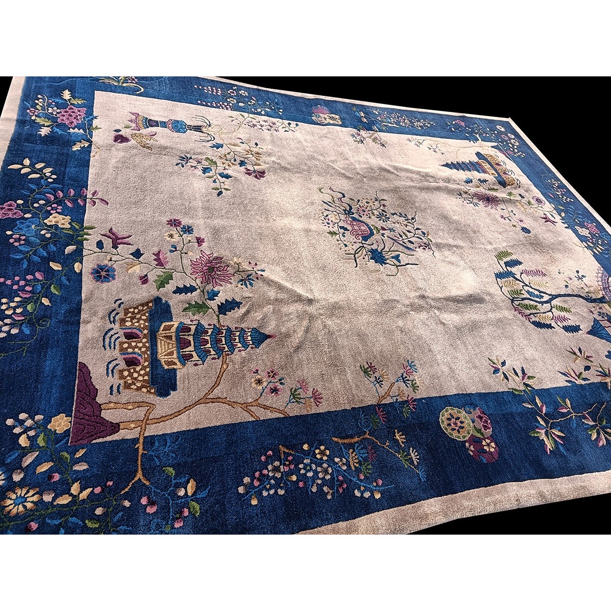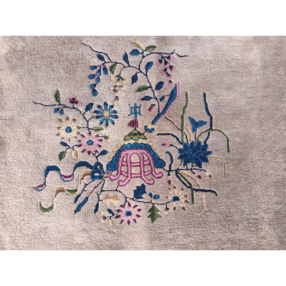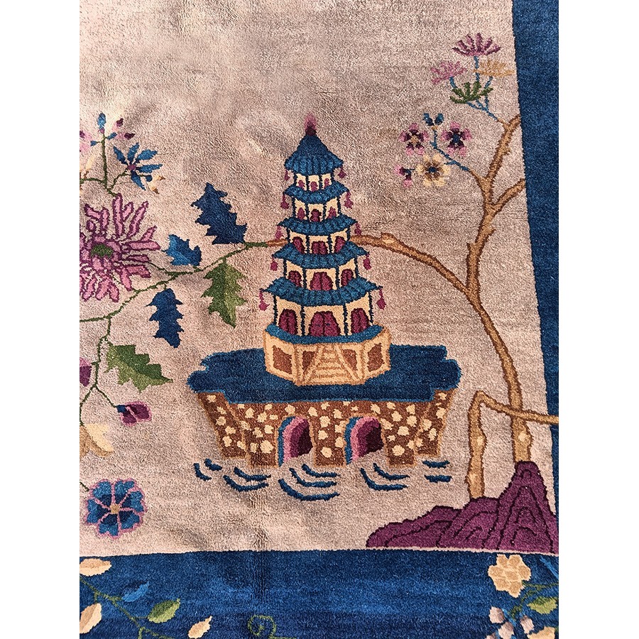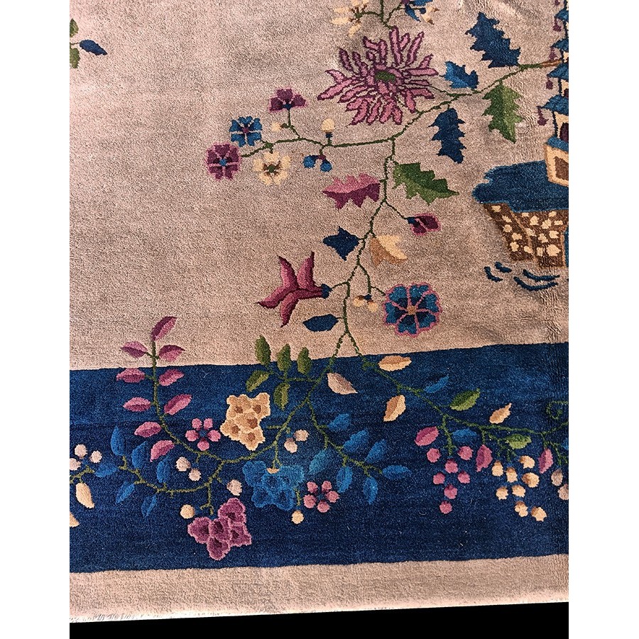 As the name implies, pieces woven between the wars for the Western market by mostly American owned firms especially Nichols and Fette, in thick heavy weaves using strong colors, asymmetric patterns and downplaying the Chinese-ness of the carpet. Nichols rugs are more strong toned than the pastel Fette. Most were woven in the coastal port city of Tientsin. Other lesser known workshops were also active. Some pieces are ultra-geometric and haute-Deco moderne in character: these are very rare. More frequent are pieces with bits of Chinese ornament: vases or other precious objects, paeonies, vines, fences, etc. Most common is the 9’ x 12’ size, in colors never found in mainstream Chinese rugs: backgrounds in black, mauve, purple, hot pink, orange, olive, employing the best synthetic chrome dyes of the period. Prices are still reasonable and carpets in top condition are available.