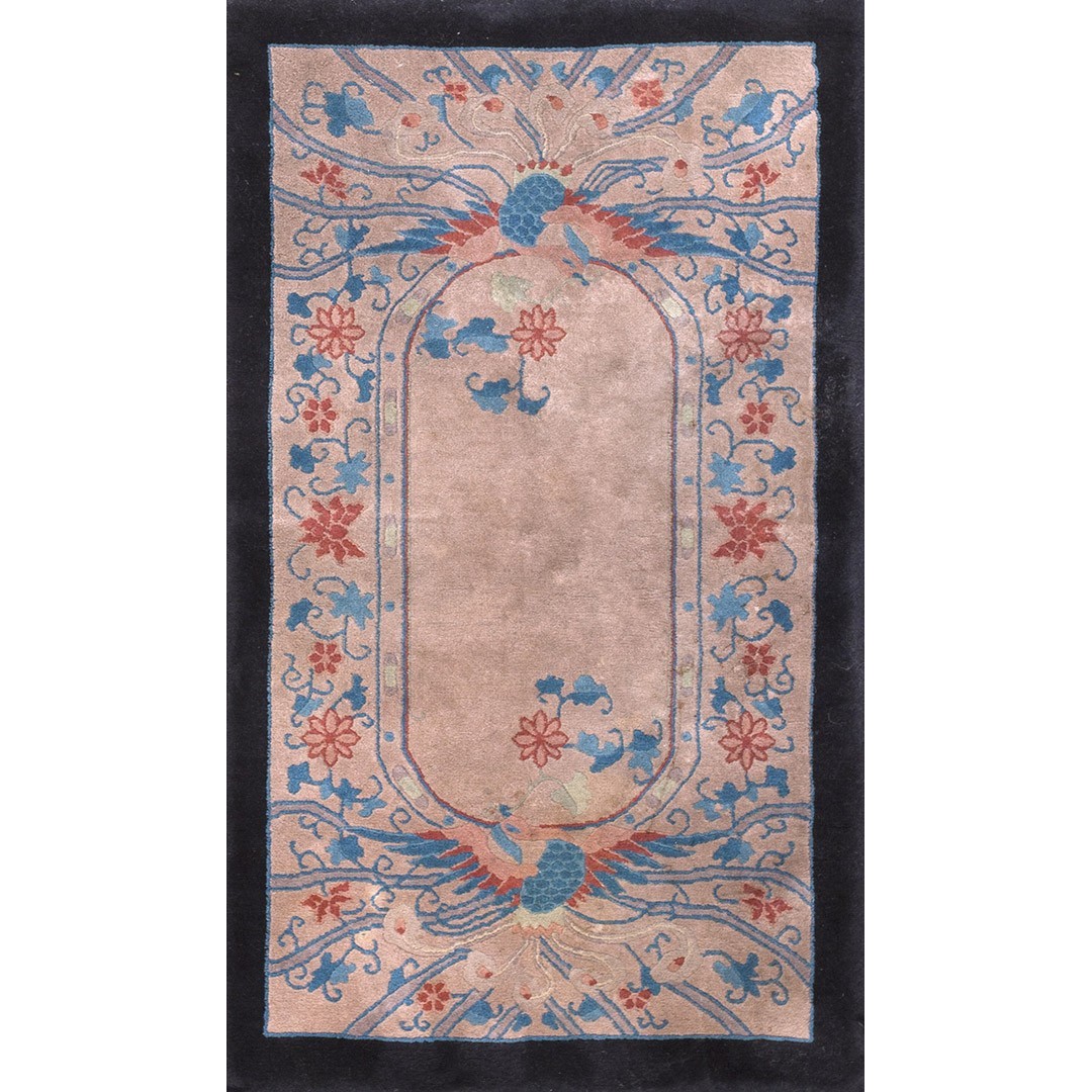 DescriptionChineseCarpets made in China proper. See entries Ningshia, Peking, Art Deco. Chinese - Art DecoAs the name implies, pieces woven between the wars for the Western market by mostly American owned firms especially Nichols and Fette, in thick heavy weaves using strong colors, asymmetric patterns and downplaying the Chinese-ness of the carpet. Nichols rugs are more strong toned than the pastel Fette. Most were woven in the coastal port city of Tientsin. Other lesser known workshops were also active. Some pieces are ultra-geometric and haute-Deco moderne in character: these are very rare. More frequent are pieces with bits of Chinese ornament: vases or other precious objects, paeonies, vines, fences, etc. Most common is the 9 x 12 size, in colors never found in mainstream Chinese rugs: backgrounds in black, mauve, purple, hot pink, orange, olive, employing the best synthetic chrome dyes of the period. Prices are still reasonable and carpets in top condition are available. | |