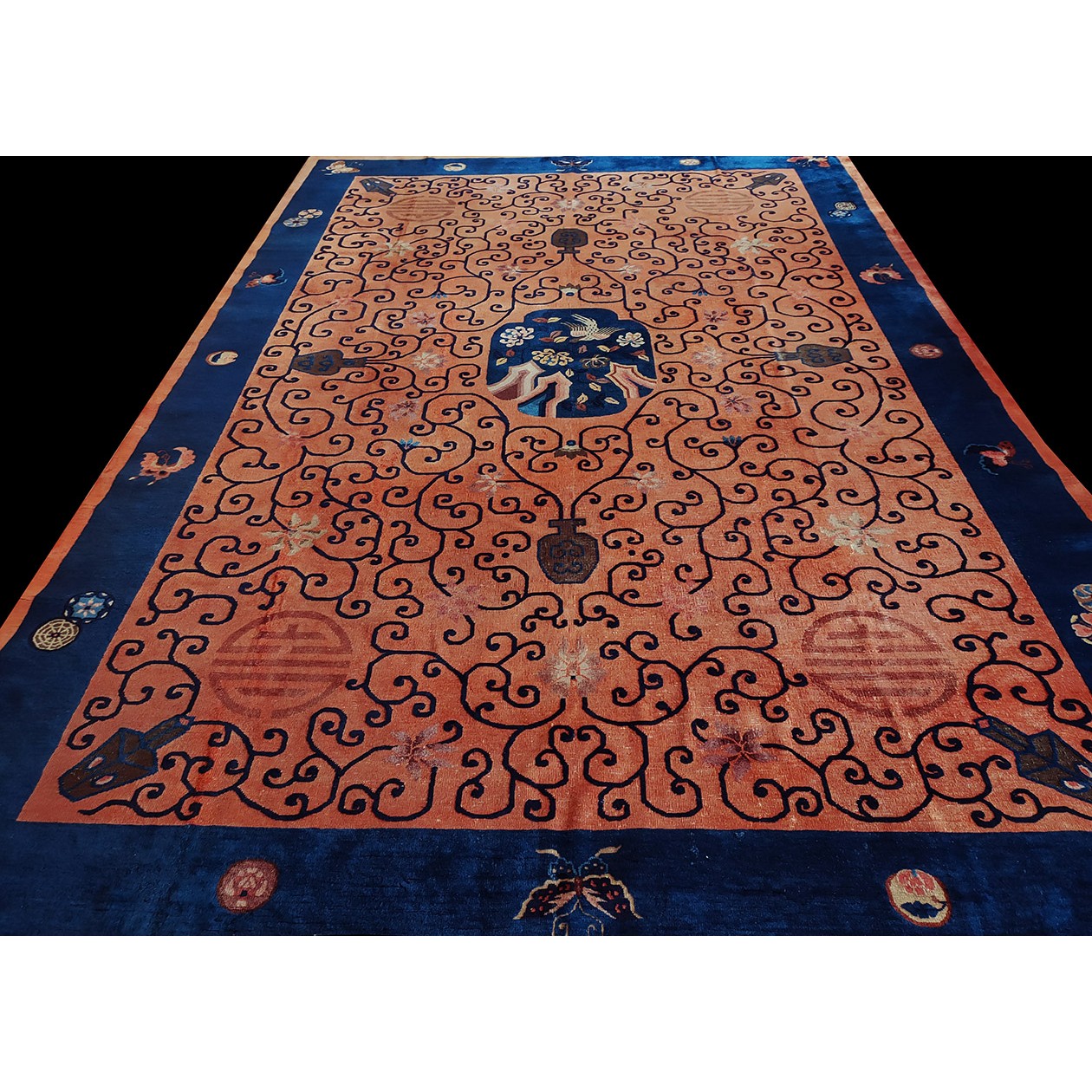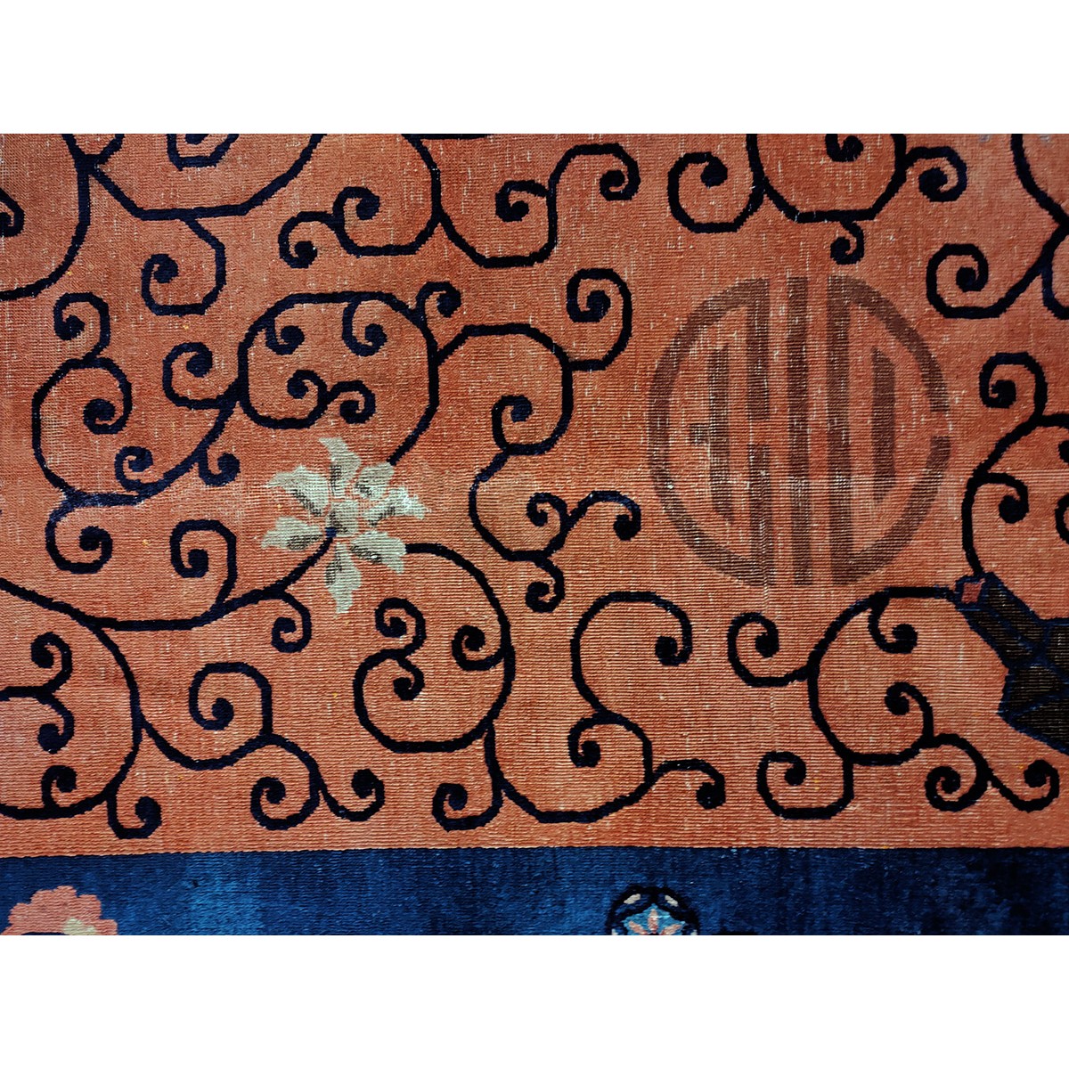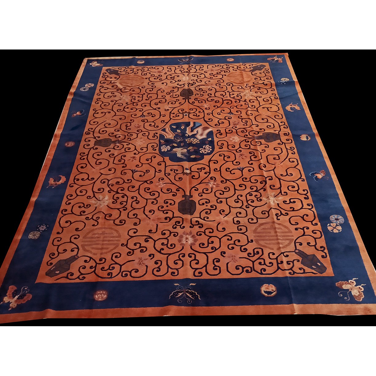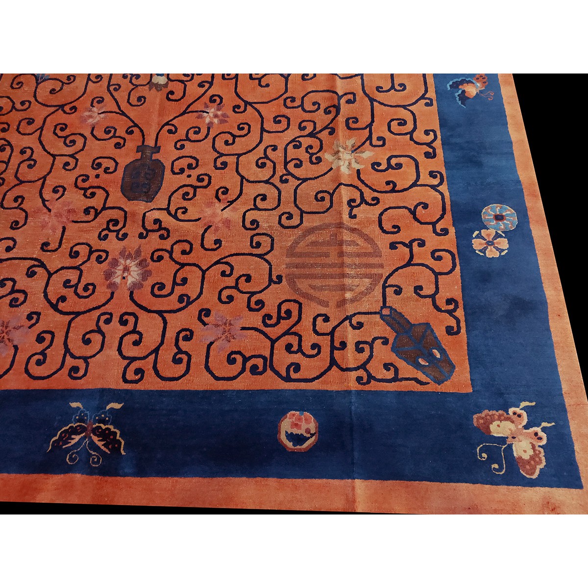 DescriptionChineseCarpets made in China proper. See entries Ningshia, Peking, Art Deco. Chinese - Art DecoAs the name implies, pieces woven between the wars for the Western market by mostly American owned firms especially Nichols and Fette, in thick heavy weaves using strong colors, asymmetric patterns and downplaying the Chinese-ness of the carpet. Nichols rugs are more strong toned than the pastel Fette. Most were woven in the coastal port city of Tientsin. Other lesser known workshops were also active. Some pieces are ultra-geometric and haute-Deco moderne in character: these are very rare. More frequent are pieces with bits of Chinese ornament: vases or other precious objects, paeonies, vines, fences, etc. Most common is the 9 x 12 size, in colors never found in mainstream Chinese rugs: backgrounds in black, mauve, purple, hot pink, orange, olive, employing the best synthetic chrome dyes of the period. Prices are still reasonable and carpets in top condition are available. | |