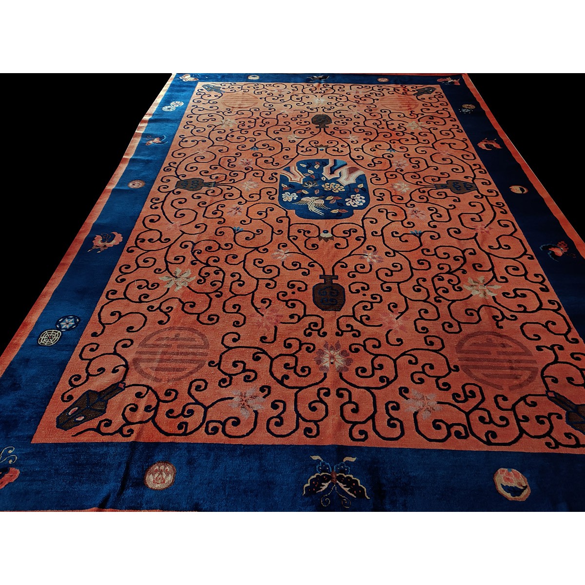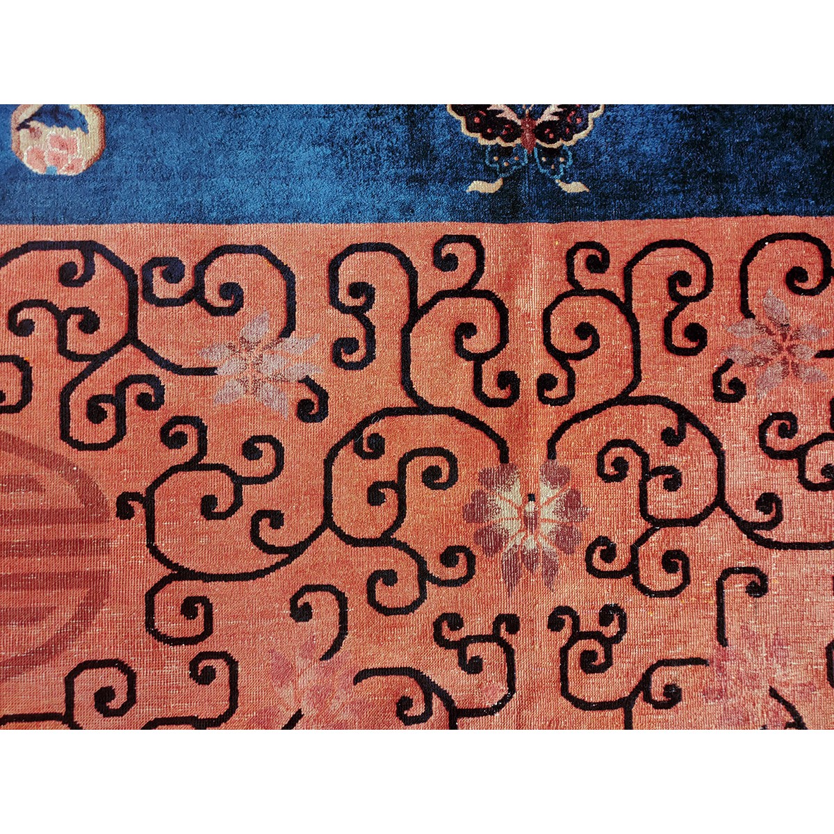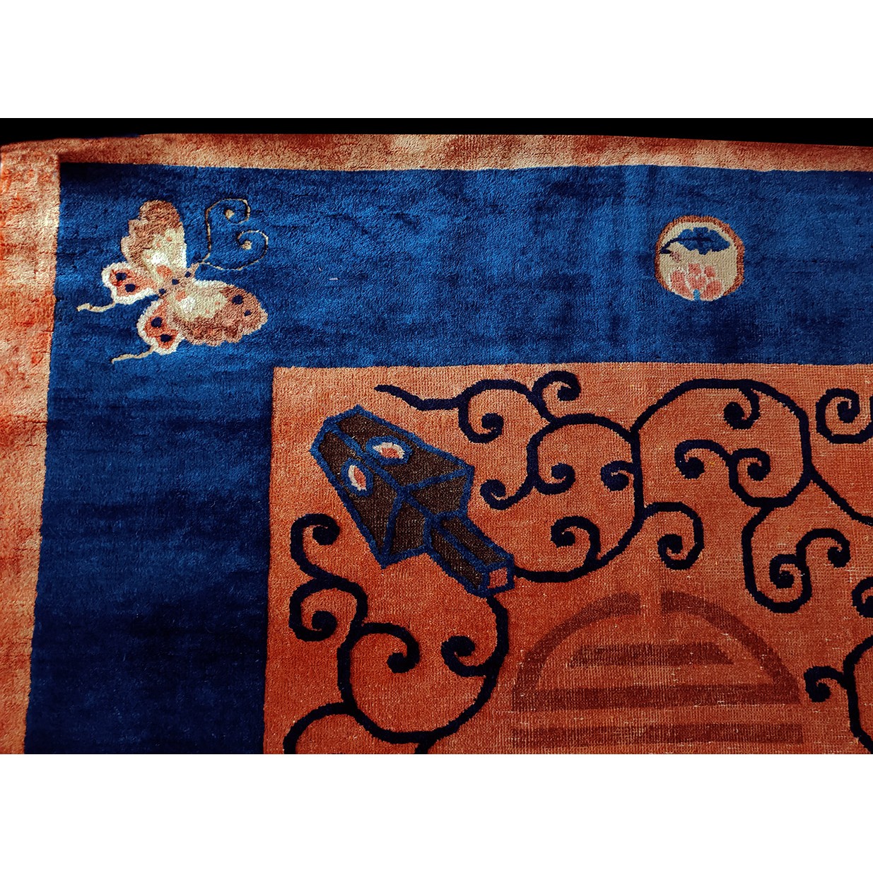 DescriptionChineseCarpets made in China proper. See entries Ningshia, Peking, Art Deco. Chinese - Art DecoAs the name implies, pieces woven between the wars for the Western market by mostly American owned firms especially Nichols and Fette, in thick heavy weaves using strong colors, asymmetric patterns and downplaying the Chinese-ness of the carpet. Nichols rugs are more strong toned than the pastel Fette. Most were woven in the coastal port city of Tientsin. Other lesser known workshops were also active. Some pieces are ultra-geometric and haute-Deco moderne in character: these are very rare. More frequent are pieces with bits of Chinese ornament: vases or other precious objects, paeonies, vines, fences, etc. Most common is the 9 x 12 size, in colors never found in mainstream Chinese rugs: backgrounds in black, mauve, purple, hot pink, orange, olive, employing the best synthetic chrome dyes of the period. Prices are still reasonable and carpets in top condition are available. | |