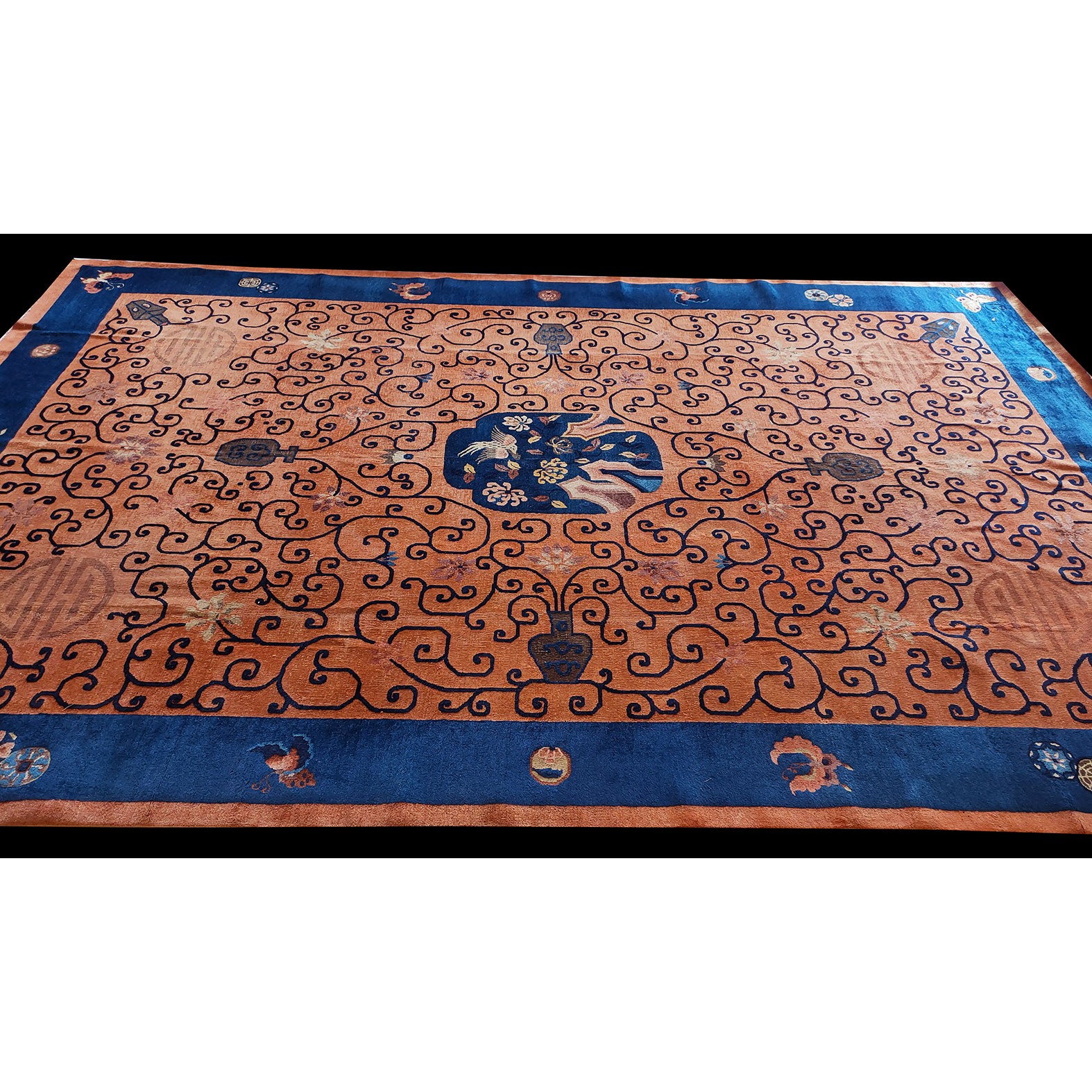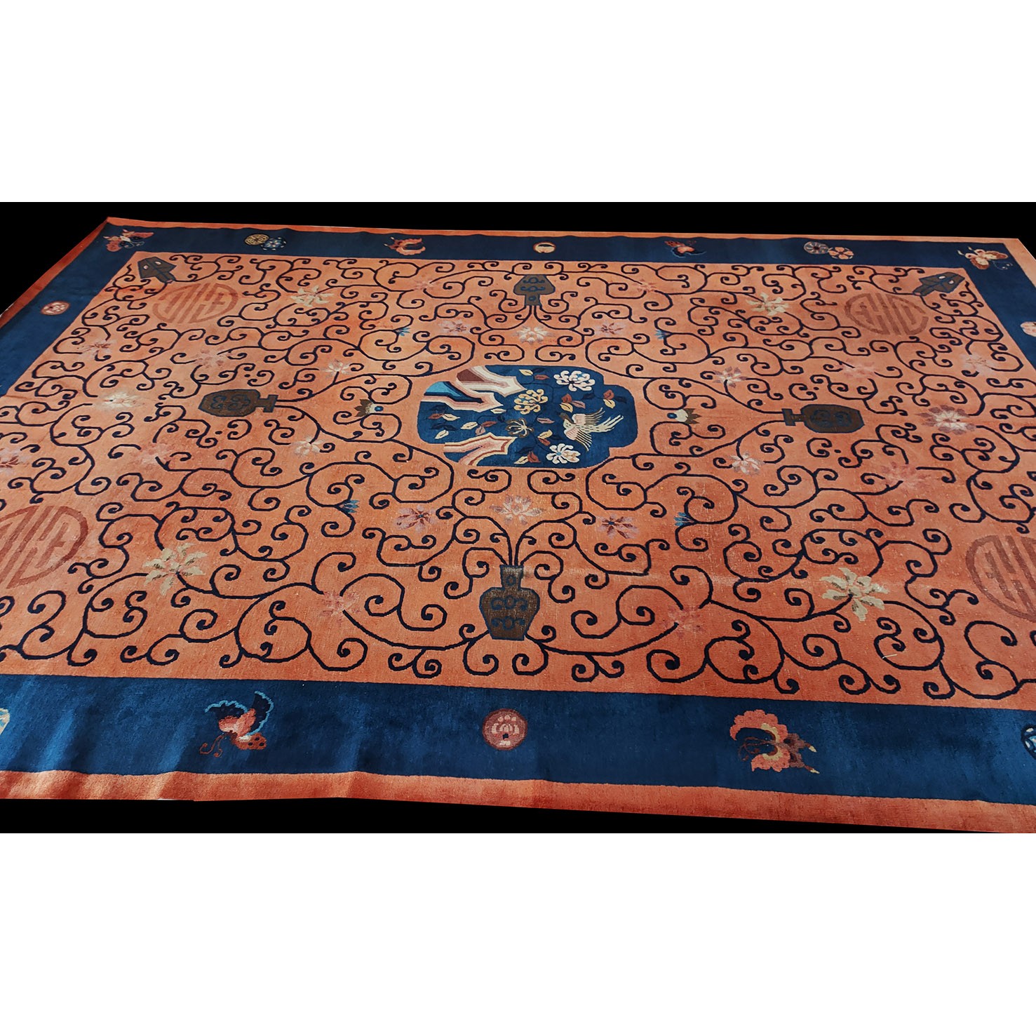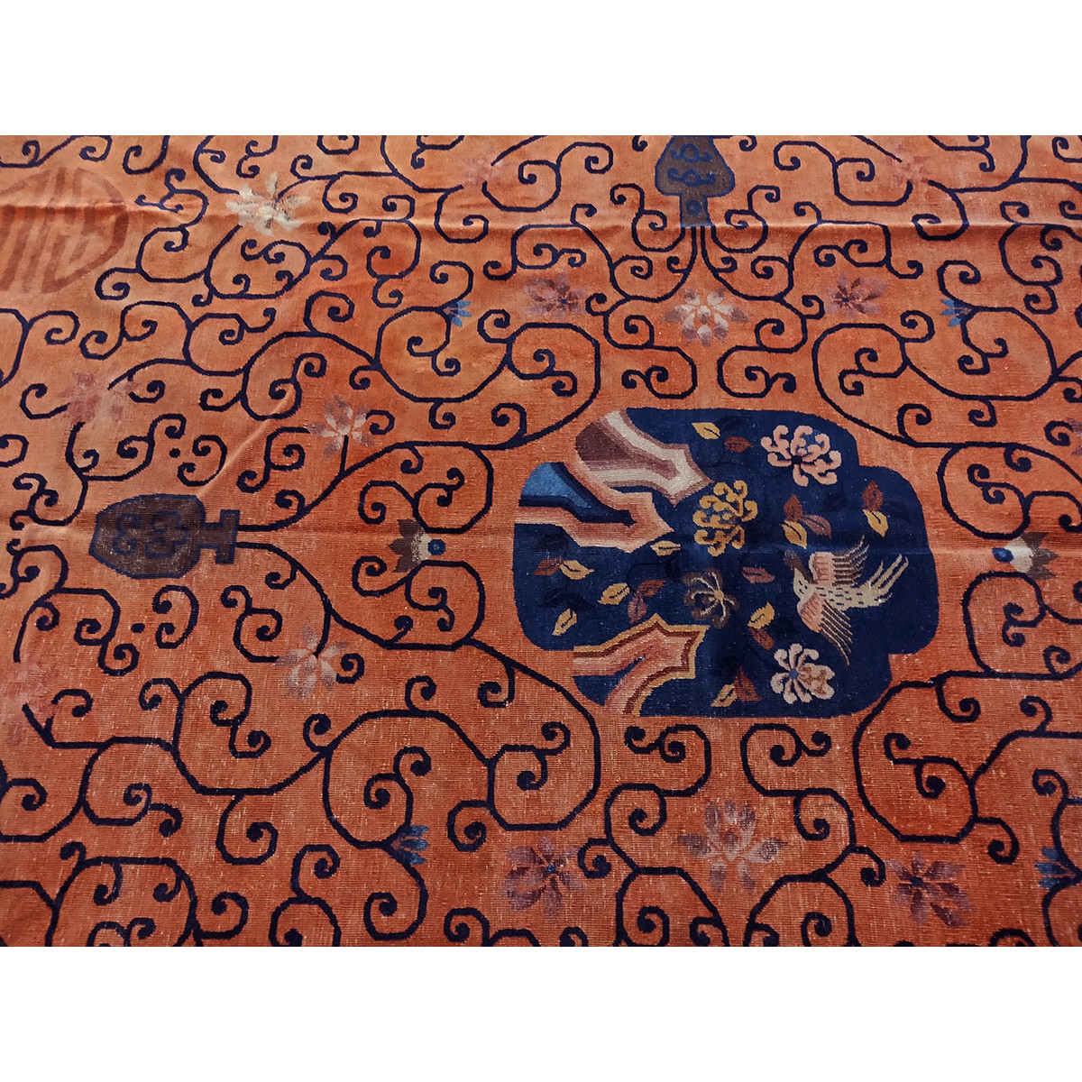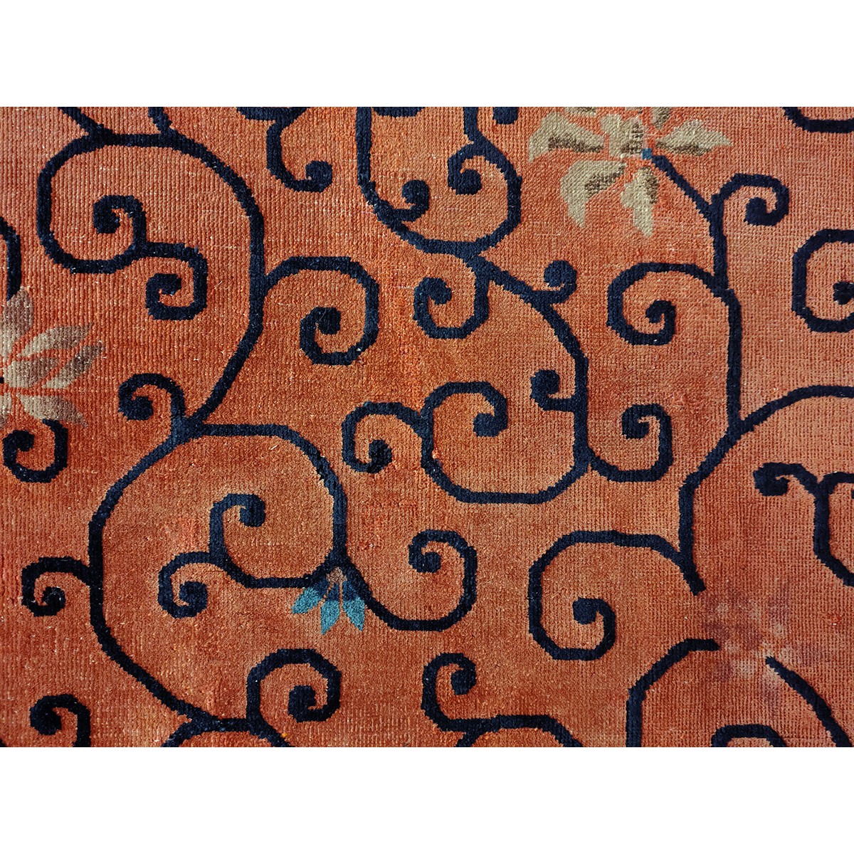 DescriptionChineseCarpets made in China proper. See entries Ningshia, Peking, Art Deco. Chinese - Art DecoAs the name implies, pieces woven between the wars for the Western market by mostly American owned firms especially Nichols and Fette, in thick heavy weaves using strong colors, asymmetric patterns and downplaying the Chinese-ness of the carpet. Nichols rugs are more strong toned than the pastel Fette. Most were woven in the coastal port city of Tientsin. Other lesser known workshops were also active. Some pieces are ultra-geometric and haute-Deco moderne in character: these are very rare. More frequent are pieces with bits of Chinese ornament: vases or other precious objects, paeonies, vines, fences, etc. Most common is the 9 x 12 size, in colors never found in mainstream Chinese rugs: backgrounds in black, mauve, purple, hot pink, orange, olive, employing the best synthetic chrome dyes of the period. Prices are still reasonable and carpets in top condition are available. | |