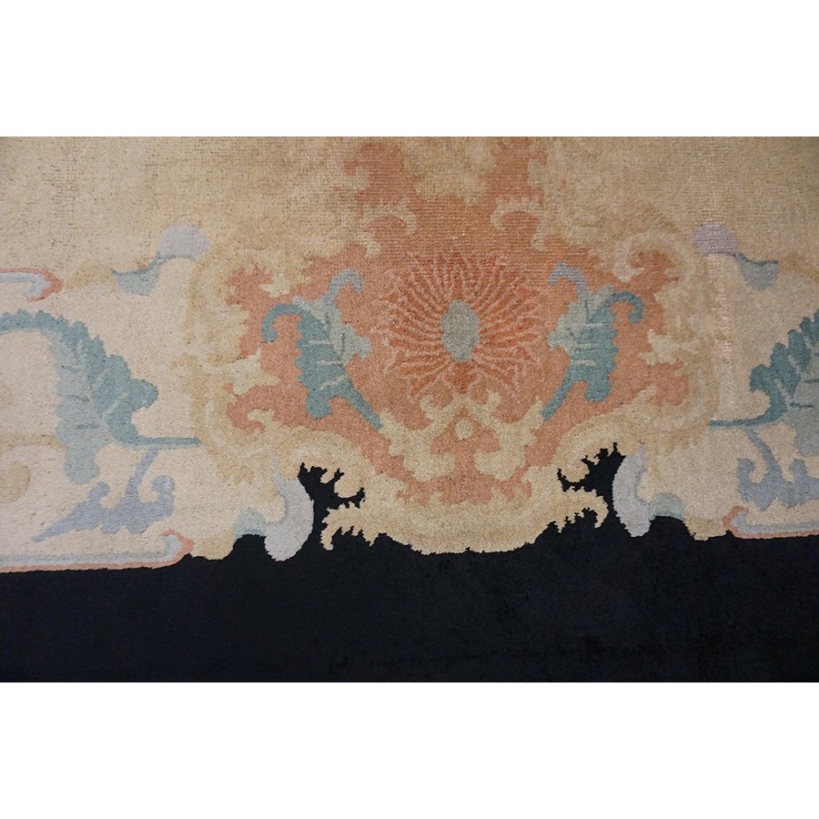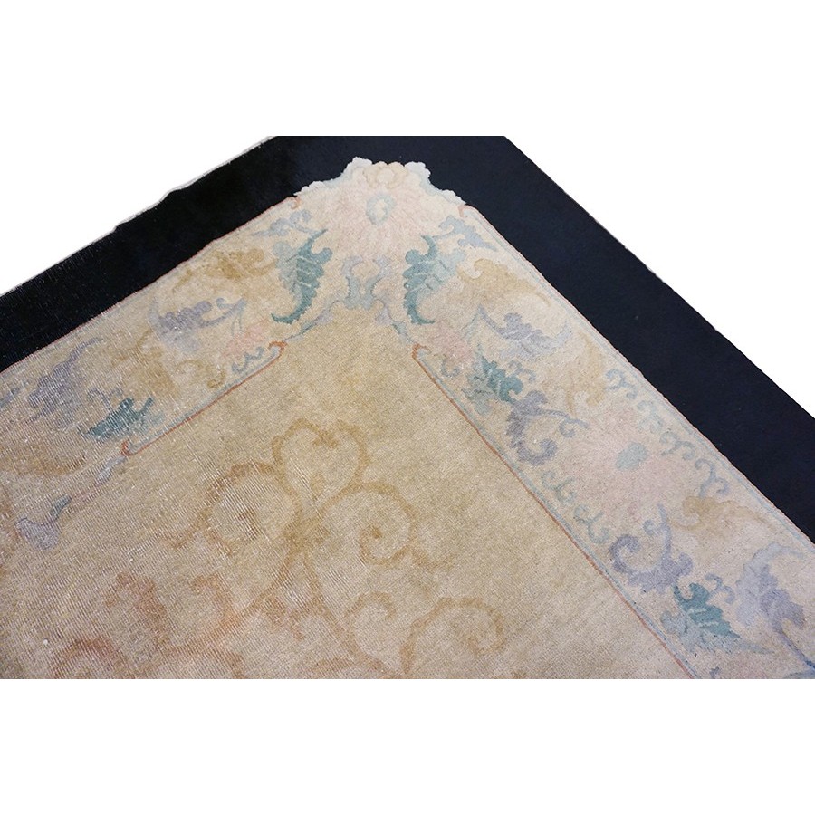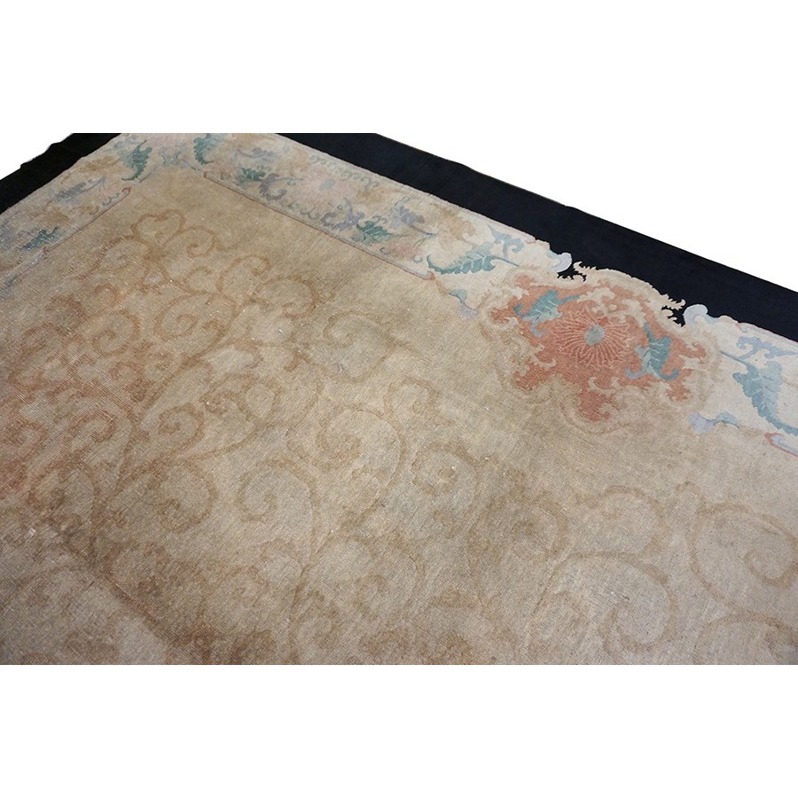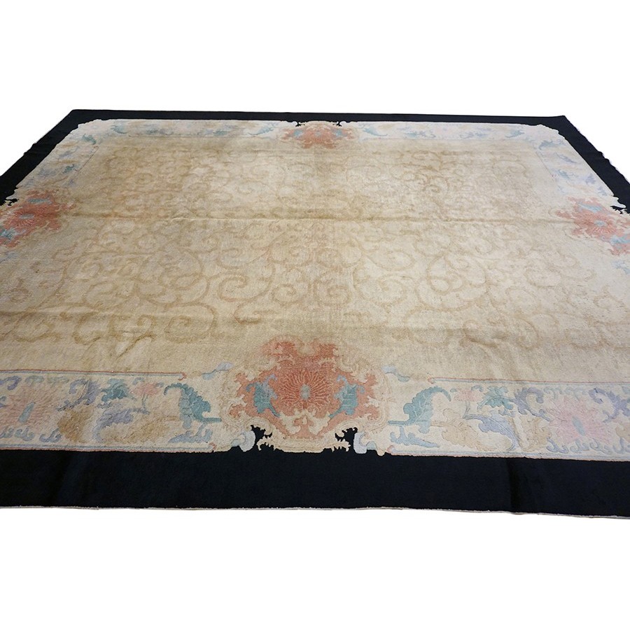 DescriptionChineseCarpets made in China proper. See entries Ningshia, Peking, Art Deco. Chinese - Art DecoAs the name implies, pieces woven between the wars for the Western market by mostly American owned firms especially Nichols and Fette, in thick heavy weaves using strong colors, asymmetric patterns and downplaying the Chinese-ness of the carpet. Nichols rugs are more strong toned than the pastel Fette. Most were woven in the coastal port city of Tientsin. Other lesser known workshops were also active. Some pieces are ultra-geometric and haute-Deco moderne in character: these are very rare. More frequent are pieces with bits of Chinese ornament: vases or other precious objects, paeonies, vines, fences, etc. Most common is the 9 x 12 size, in colors never found in mainstream Chinese rugs: backgrounds in black, mauve, purple, hot pink, orange, olive, employing the best synthetic chrome dyes of the period. Prices are still reasonable and carpets in top condition are available. | |