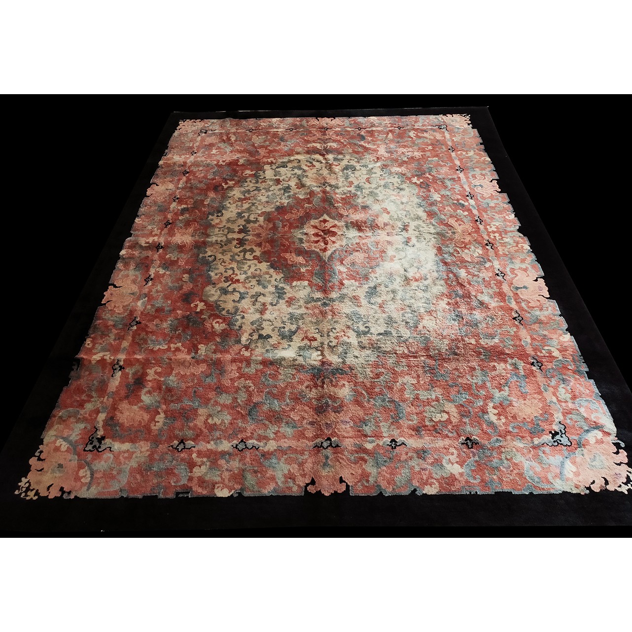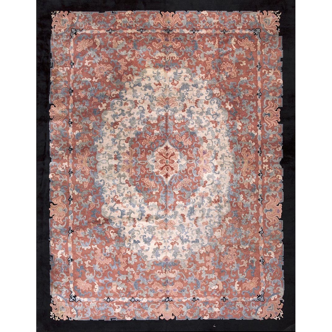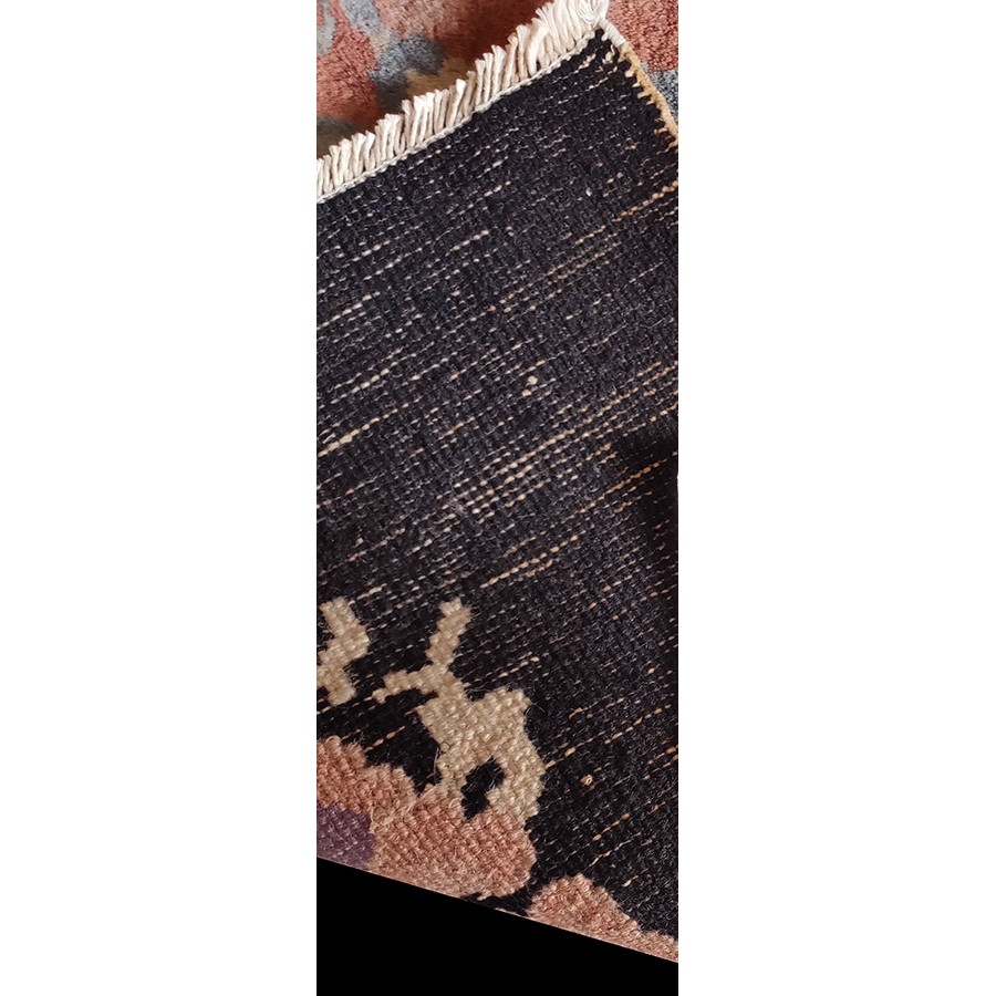 DescriptionChineseCarpets made in China proper. See entries Ningshia, Peking, Art Deco. Chinese - Art DecoAs the name implies, pieces woven between the wars for the Western market by mostly American owned firms especially Nichols and Fette, in thick heavy weaves using strong colors, asymmetric patterns and downplaying the Chinese-ness of the carpet. Nichols rugs are more strong toned than the pastel Fette. Most were woven in the coastal port city of Tientsin. Other lesser known workshops were also active. Some pieces are ultra-geometric and haute-Deco moderne in character: these are very rare. More frequent are pieces with bits of Chinese ornament: vases or other precious objects, paeonies, vines, fences, etc. Most common is the 9 x 12 size, in colors never found in mainstream Chinese rugs: backgrounds in black, mauve, purple, hot pink, orange, olive, employing the best synthetic chrome dyes of the period. Prices are still reasonable and carpets in top condition are available. | |