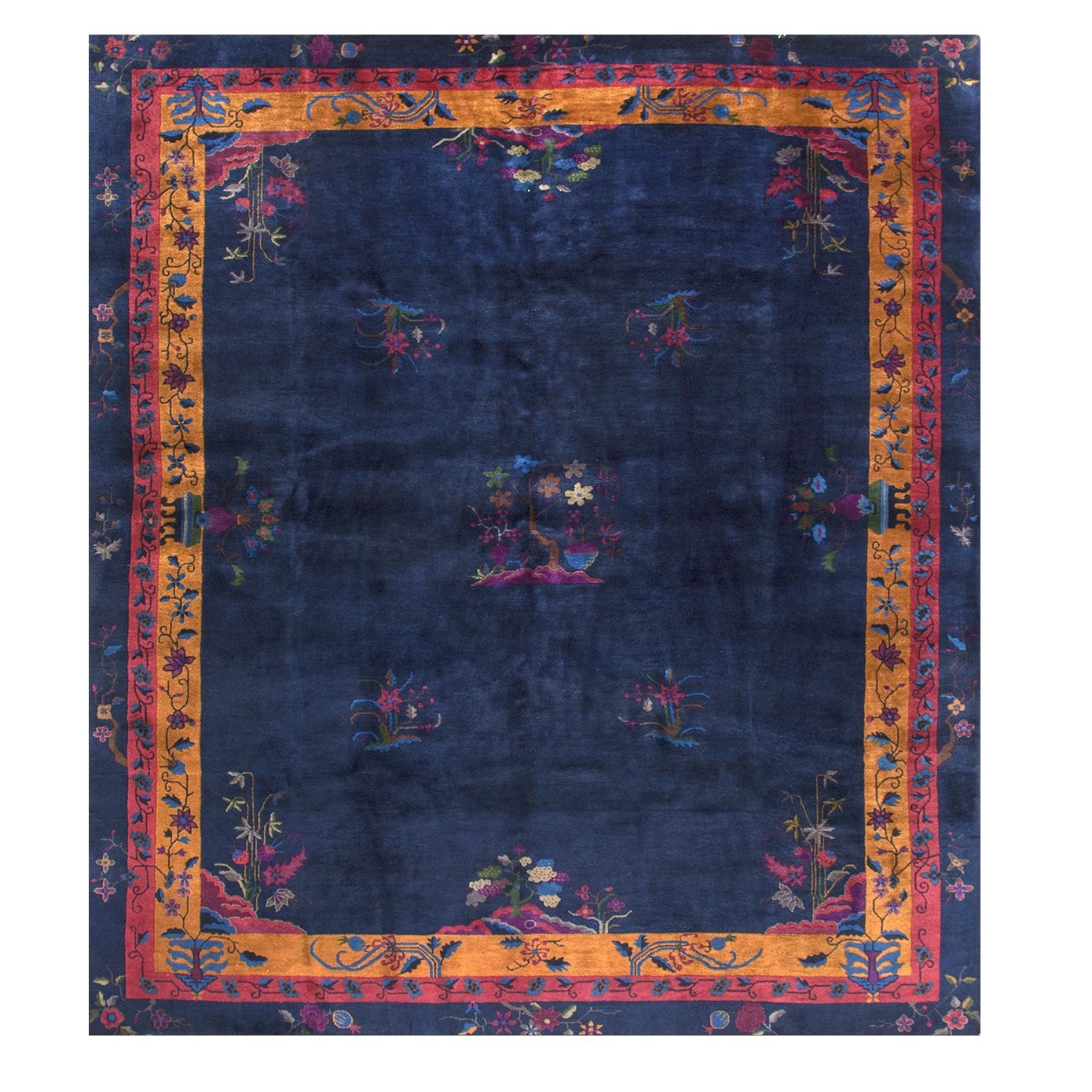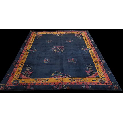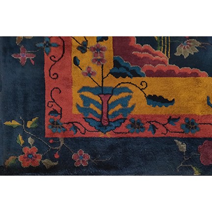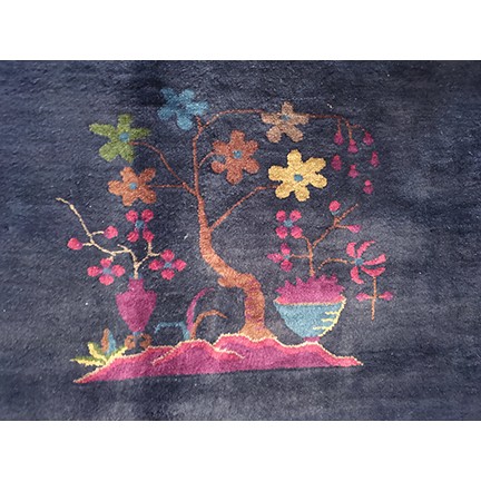 DescriptionChineseCarpets made in China proper. See entries Ningshia, Peking, Art Deco. Chinese - Art DecoAs the name implies, pieces woven between the wars for the Western market by mostly American owned firms especially Nichols and Fette, in thick heavy weaves using strong colors, asymmetric patterns and downplaying the Chinese-ness of the carpet. Nichols rugs are more strong toned than the pastel Fette. Most were woven in the coastal port city of Tientsin. Other lesser known workshops were also active. Some pieces are ultra-geometric and haute-Deco moderne in character: these are very rare. More frequent are pieces with bits of Chinese ornament: vases or other precious objects, paeonies, vines, fences, etc. Most common is the 9 x 12 size, in colors never found in mainstream Chinese rugs: backgrounds in black, mauve, purple, hot pink, orange, olive, employing the best synthetic chrome dyes of the period. Prices are still reasonable and carpets in top condition are available. | |