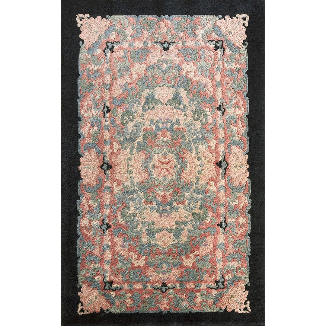 DescriptionChineseCarpets made in China proper. See entries Ningshia, Peking, Art Deco. Chinese - Art DecoAs the name implies, pieces woven between the wars for the Western market by mostly American owned firms especially Nichols and Fette, in thick heavy weaves using strong colors, asymmetric patterns and downplaying the Chinese-ness of the carpet. Nichols rugs are more strong toned than the pastel Fette. Most were woven in the coastal port city of Tientsin. Other lesser known workshops were also active. Some pieces are ultra-geometric and haute-Deco moderne in character: these are very rare. More frequent are pieces with bits of Chinese ornament: vases or other precious objects, paeonies, vines, fences, etc. Most common is the 9 x 12 size, in colors never found in mainstream Chinese rugs: backgrounds in black, mauve, purple, hot pink, orange, olive, employing the best synthetic chrome dyes of the period. Prices are still reasonable and carpets in top condition are available. | |