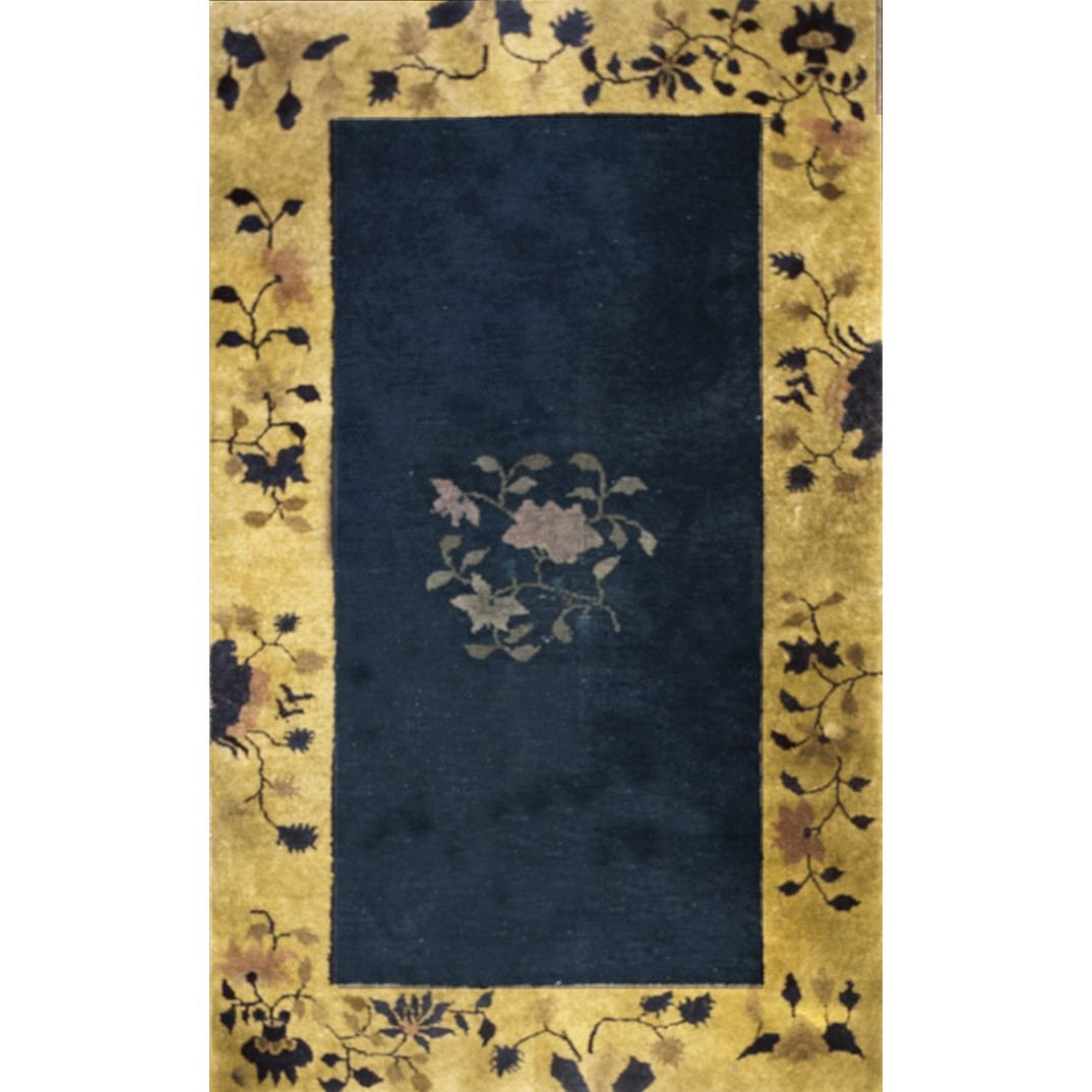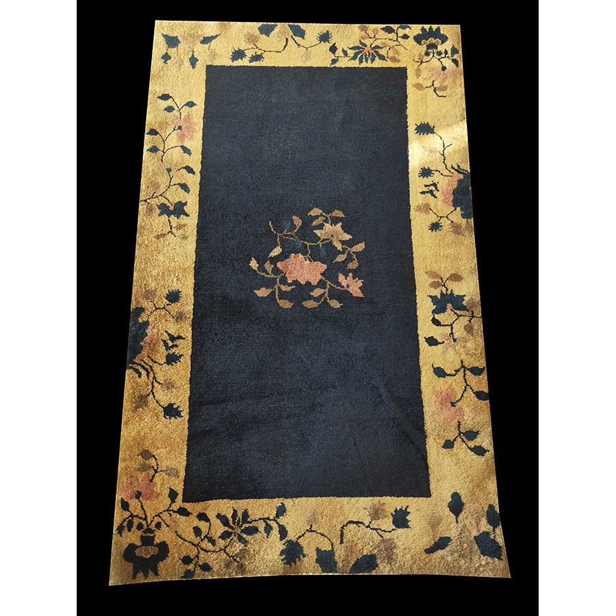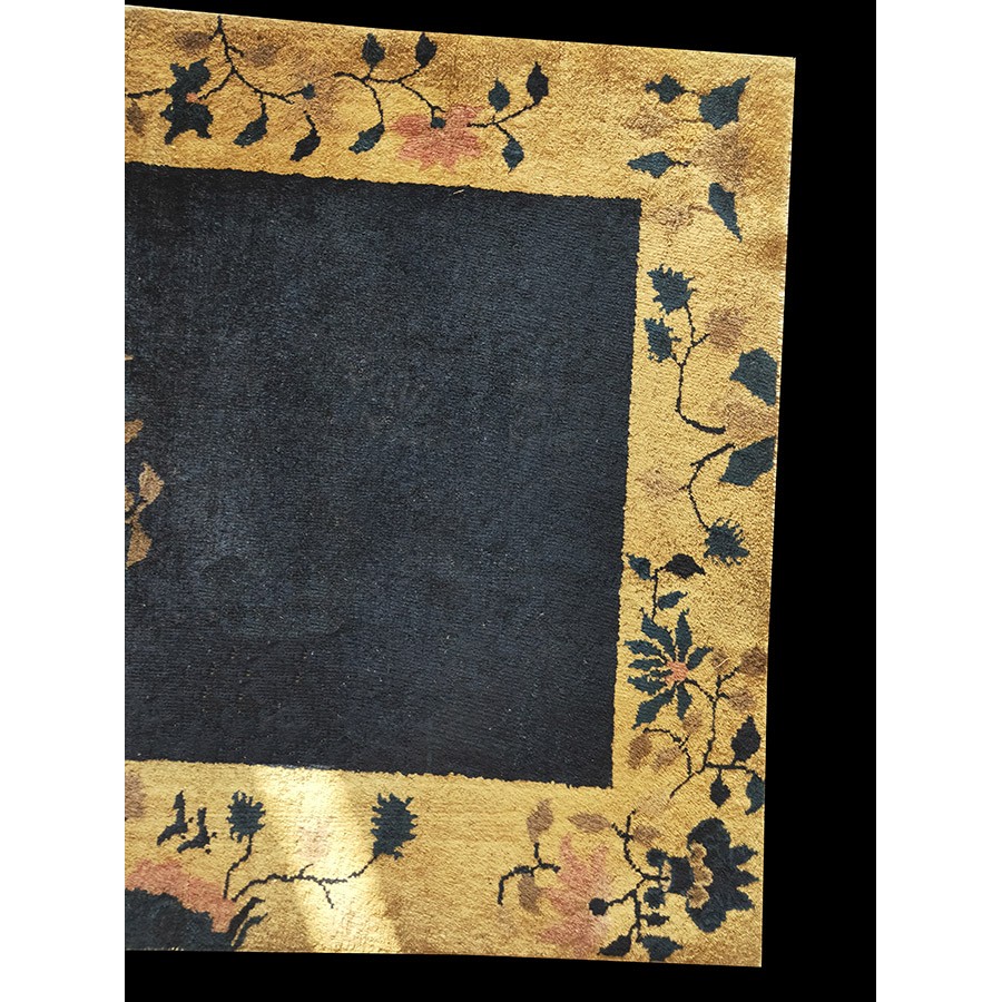 DescriptionChineseCarpets made in China proper. See entries Ningshia, Peking, Art Deco. Chinese - Art DecoAs the name implies, pieces woven between the wars for the Western market by mostly American owned firms especially Nichols and Fette, in thick heavy weaves using strong colors, asymmetric patterns and downplaying the Chinese-ness of the carpet. Nichols rugs are more strong toned than the pastel Fette. Most were woven in the coastal port city of Tientsin. Other lesser known workshops were also active. Some pieces are ultra-geometric and haute-Deco moderne in character: these are very rare. More frequent are pieces with bits of Chinese ornament: vases or other precious objects, paeonies, vines, fences, etc. Most common is the 9 x 12 size, in colors never found in mainstream Chinese rugs: backgrounds in black, mauve, purple, hot pink, orange, olive, employing the best synthetic chrome dyes of the period. Prices are still reasonable and carpets in top condition are available. | |