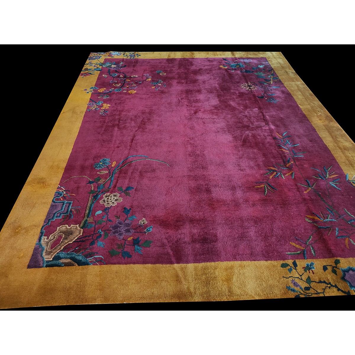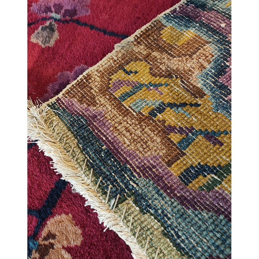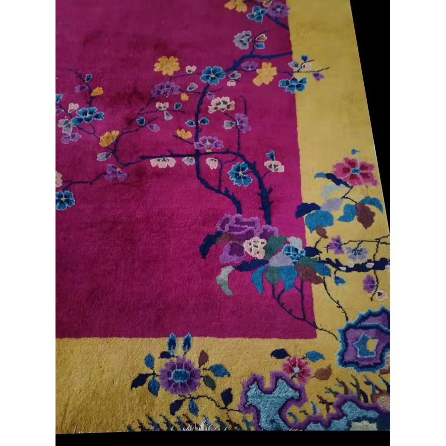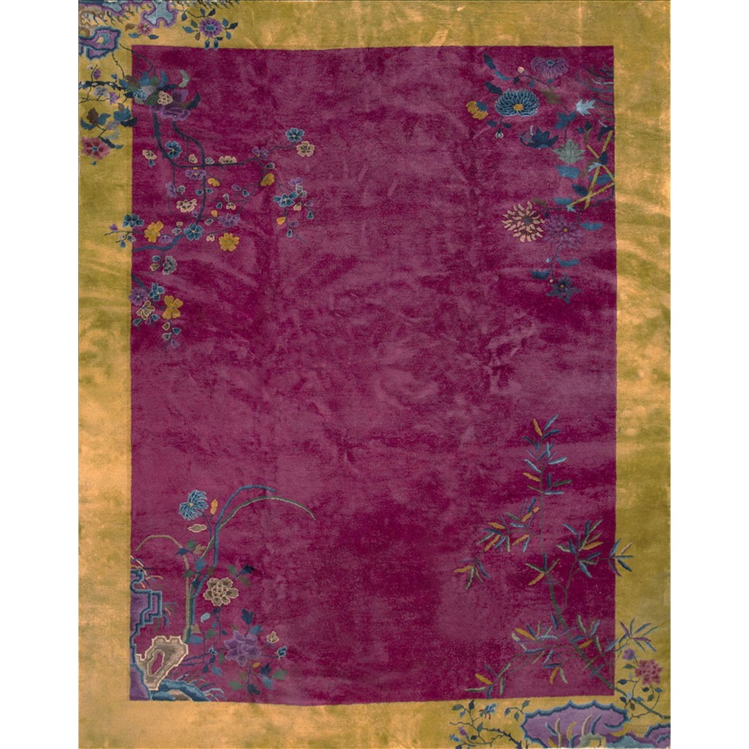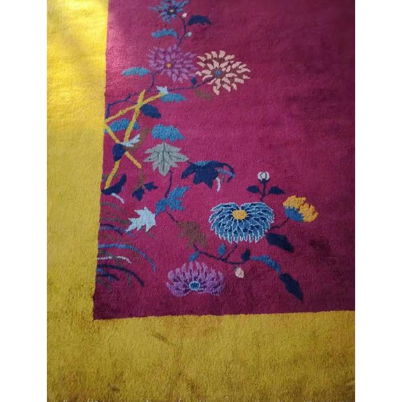 DescriptionChineseCarpets made in China proper. See entries Ningshia, Peking, Art Deco. Chinese - Art DecoAs the name implies, pieces woven between the wars for the Western market by mostly American owned firms especially Nichols and Fette, in thick heavy weaves using strong colors, asymmetric patterns and downplaying the Chinese-ness of the carpet. Nichols rugs are more strong toned than the pastel Fette. Most were woven in the coastal port city of Tientsin. Other lesser known workshops were also active. Some pieces are ultra-geometric and haute-Deco moderne in character: these are very rare. More frequent are pieces with bits of Chinese ornament: vases or other precious objects, paeonies, vines, fences, etc. Most common is the 9 x 12 size, in colors never found in mainstream Chinese rugs: backgrounds in black, mauve, purple, hot pink, orange, olive, employing the best synthetic chrome dyes of the period. Prices are still reasonable and carpets in top condition are available. | |