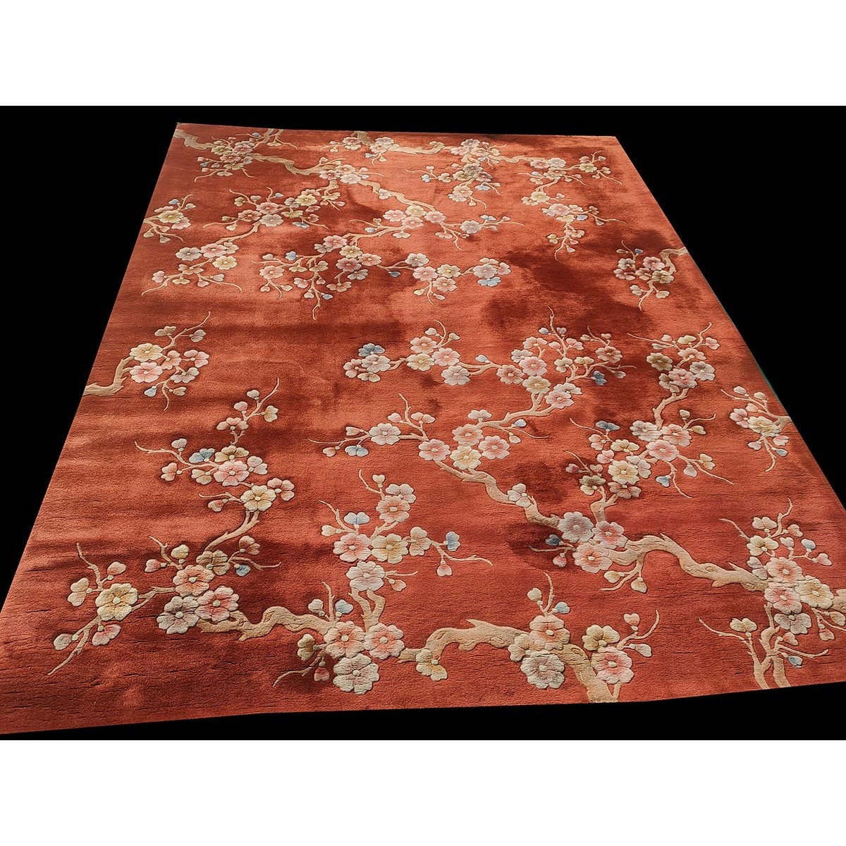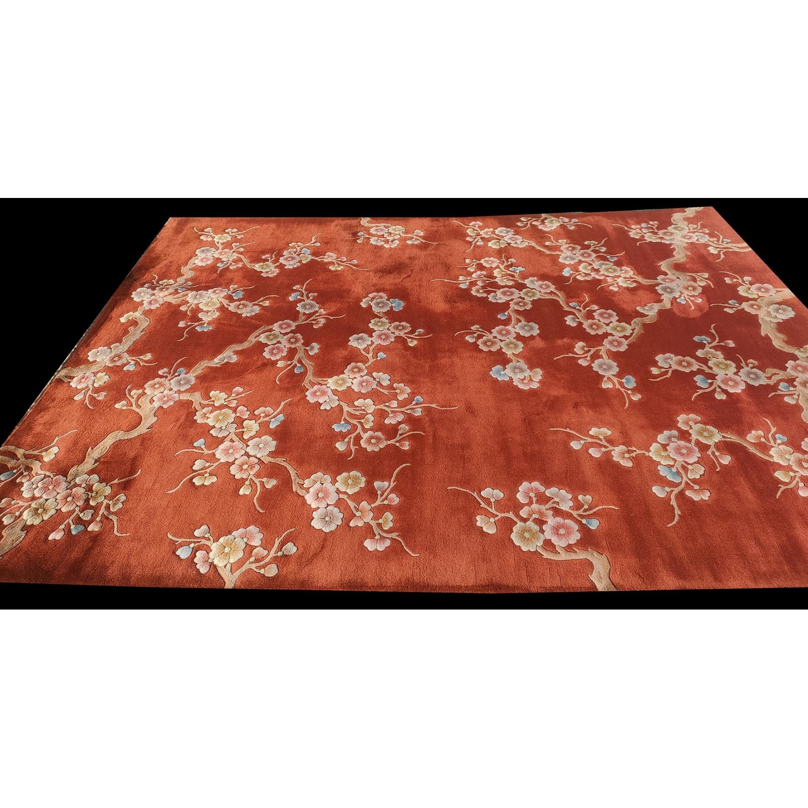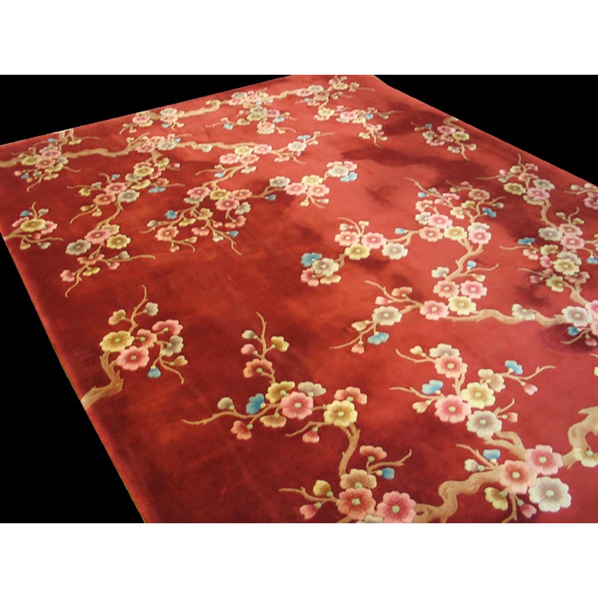 DescriptionChineseCarpets made in China proper. See entries Ningshia, Peking, Art Deco. Chinese - Art DecoAs the name implies, pieces woven between the wars for the Western market by mostly American owned firms especially Nichols and Fette, in thick heavy weaves using strong colors, asymmetric patterns and downplaying the Chinese-ness of the carpet. Nichols rugs are more strong toned than the pastel Fette. Most were woven in the coastal port city of Tientsin. Other lesser known workshops were also active. Some pieces are ultra-geometric and haute-Deco moderne in character: these are very rare. More frequent are pieces with bits of Chinese ornament: vases or other precious objects, paeonies, vines, fences, etc. Most common is the 9 x 12 size, in colors never found in mainstream Chinese rugs: backgrounds in black, mauve, purple, hot pink, orange, olive, employing the best synthetic chrome dyes of the period. Prices are still reasonable and carpets in top condition are available. | |