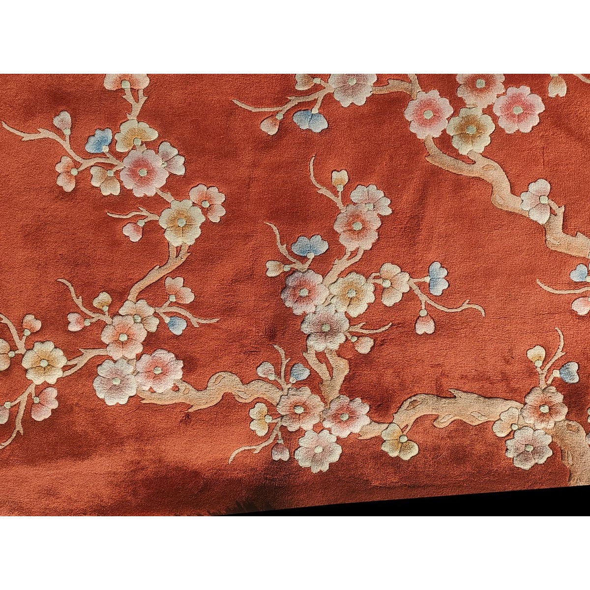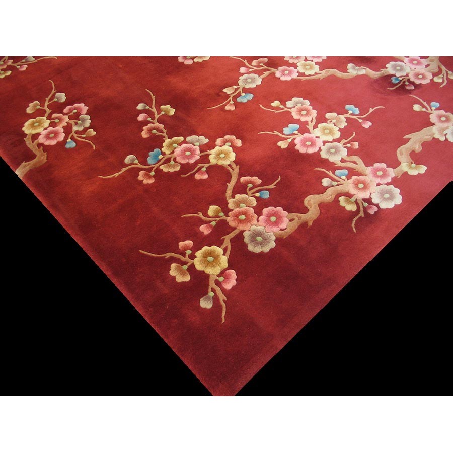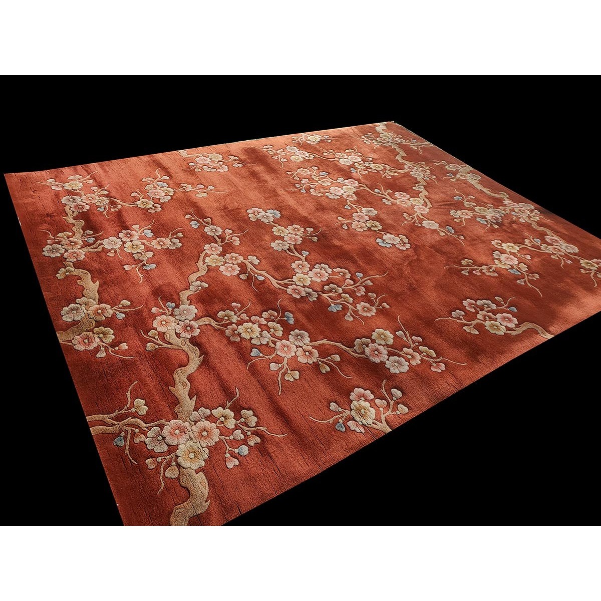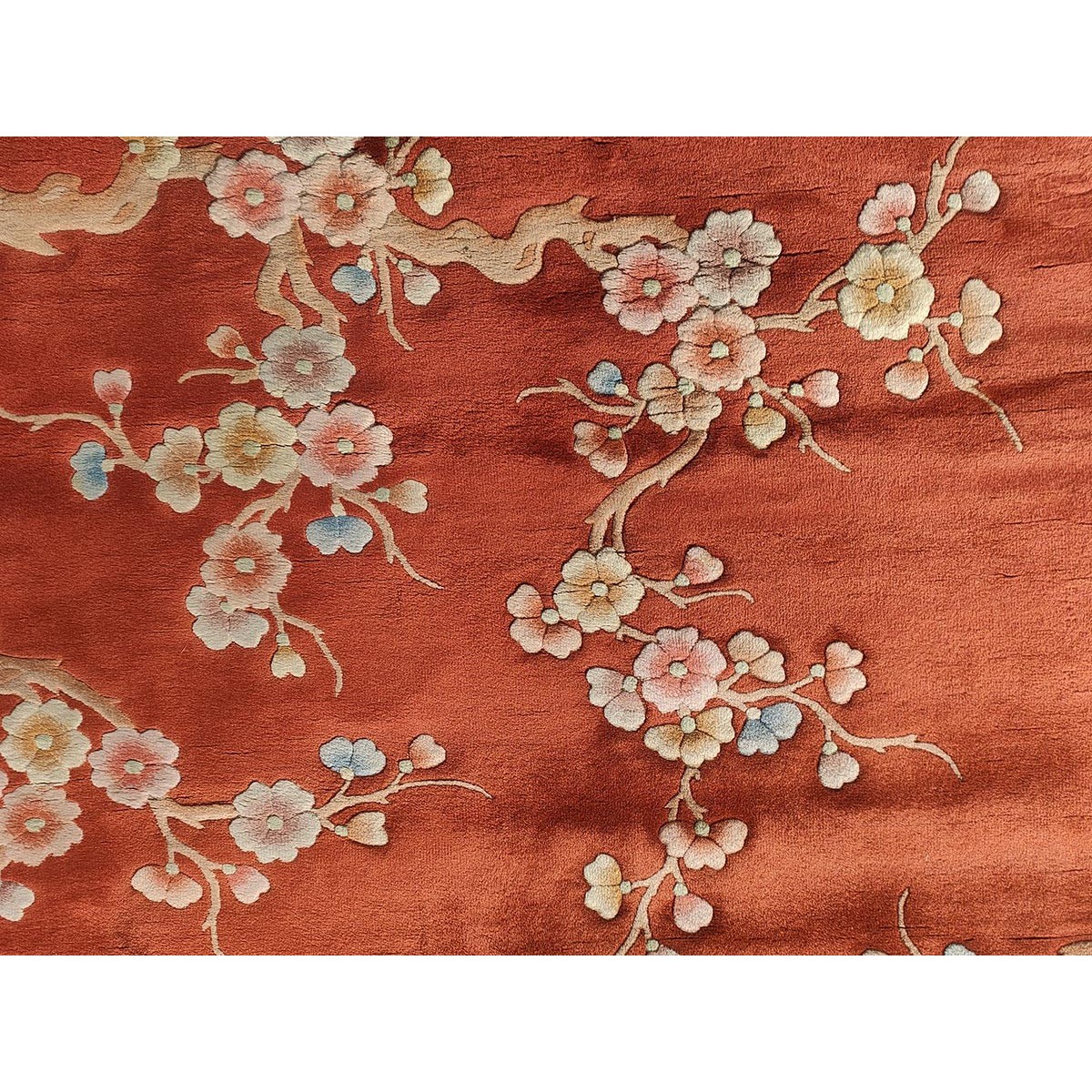 DescriptionChineseCarpets made in China proper. See entries Ningshia, Peking, Art Deco. Chinese - Art DecoAs the name implies, pieces woven between the wars for the Western market by mostly American owned firms especially Nichols and Fette, in thick heavy weaves using strong colors, asymmetric patterns and downplaying the Chinese-ness of the carpet. Nichols rugs are more strong toned than the pastel Fette. Most were woven in the coastal port city of Tientsin. Other lesser known workshops were also active. Some pieces are ultra-geometric and haute-Deco moderne in character: these are very rare. More frequent are pieces with bits of Chinese ornament: vases or other precious objects, paeonies, vines, fences, etc. Most common is the 9 x 12 size, in colors never found in mainstream Chinese rugs: backgrounds in black, mauve, purple, hot pink, orange, olive, employing the best synthetic chrome dyes of the period. Prices are still reasonable and carpets in top condition are available. | |