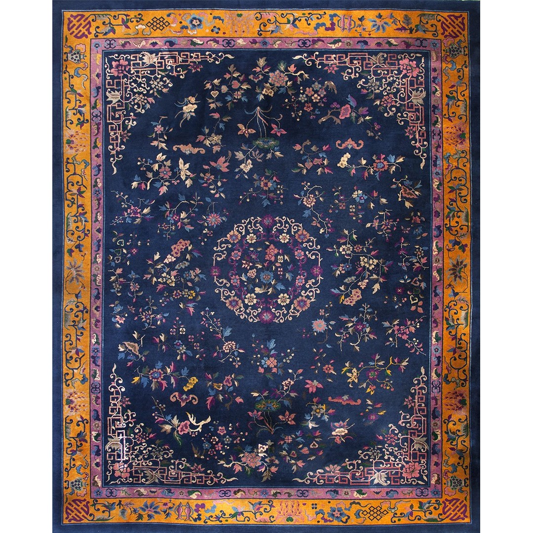As the name implies, pieces woven between the wars for the Western market by mostly American owned firms especially Nichols and Fette, in thick heavy weaves using strong colors, asymmetric patterns and downplaying the Chinese-ness of the carpet. Nichols rugs are more strong toned than the pastel Fette. Most were woven in the coastal port city of Tientsin. Other lesser known workshops were also active. Some pieces are ultra-geometric and haute-Deco moderne in character: these are very rare. More frequent are pieces with bits of Chinese ornament: vases or other precious objects, paeonies, vines, fences, etc. Most common is the 9’ x 12’ size, in colors never found in mainstream Chinese rugs: backgrounds in black, mauve, purple, hot pink, orange, olive, employing the best synthetic chrome dyes of the period. Prices are still reasonable and carpets in top condition are available.