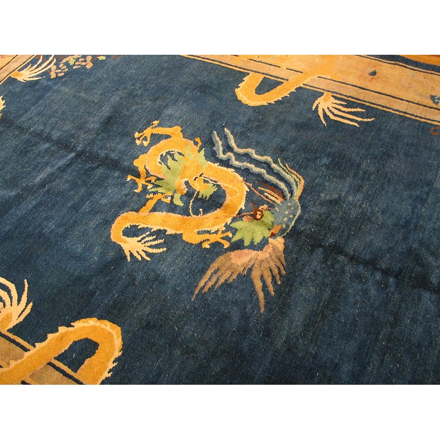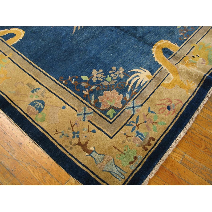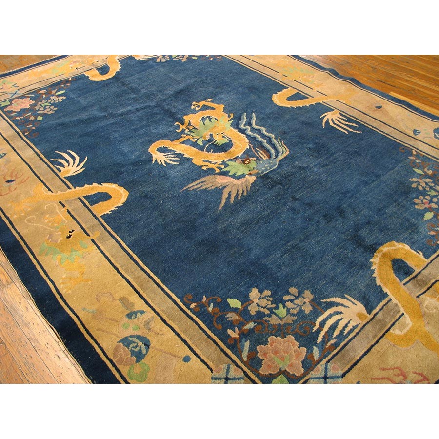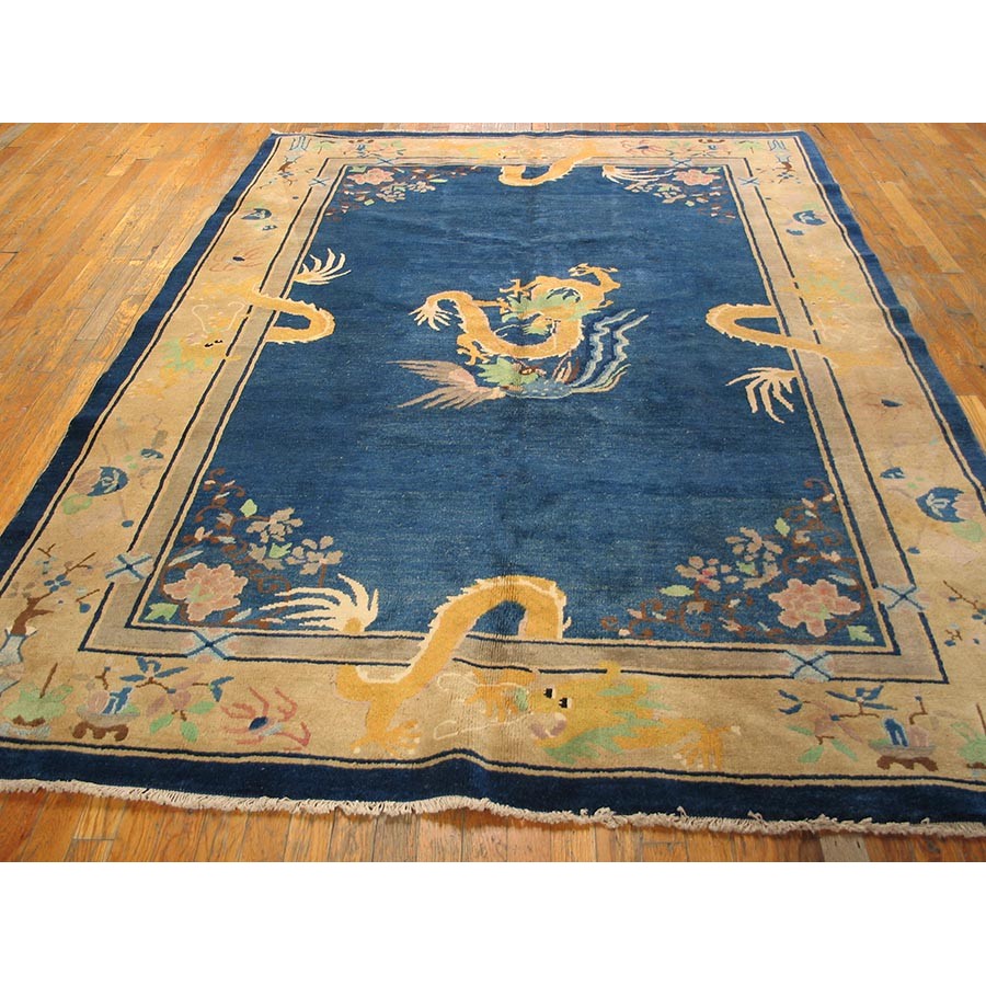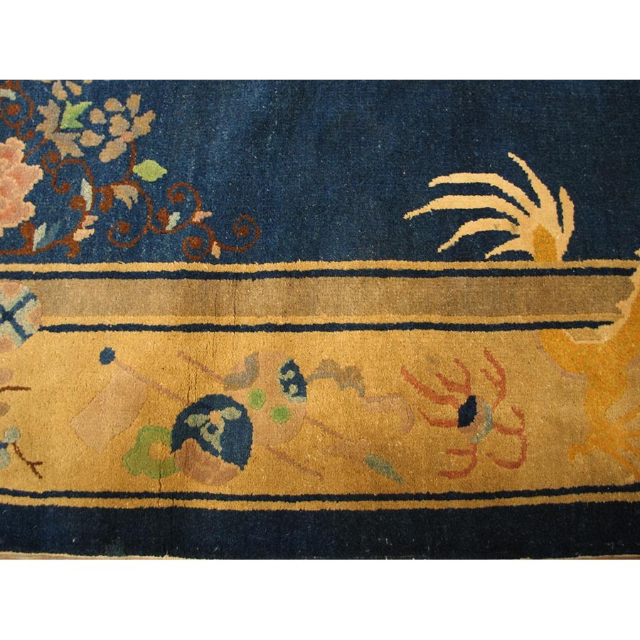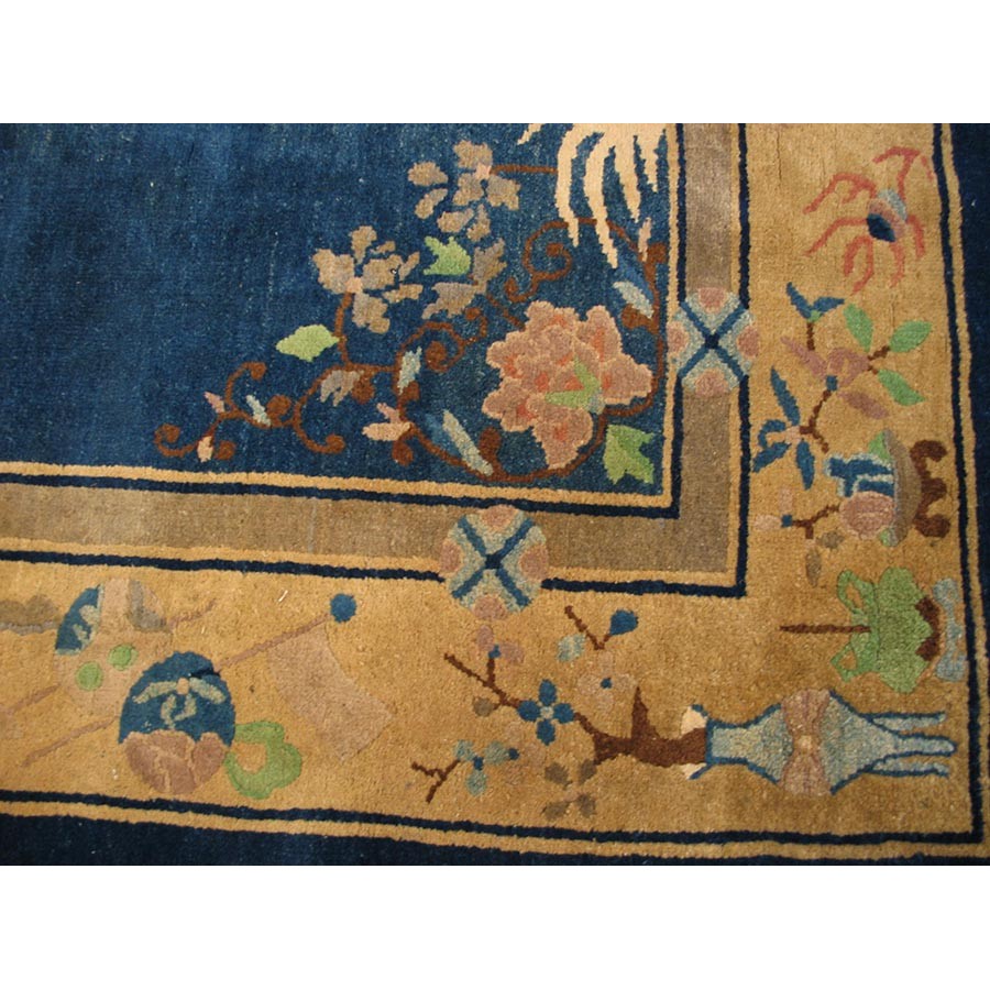 DescriptionChineseCarpets made in China proper. See entries Ningshia, Peking, Art Deco. Chinese - Art DecoAs the name implies, pieces woven between the wars for the Western market by mostly American owned firms especially Nichols and Fette, in thick heavy weaves using strong colors, asymmetric patterns and downplaying the Chinese-ness of the carpet. Nichols rugs are more strong toned than the pastel Fette. Most were woven in the coastal port city of Tientsin. Other lesser known workshops were also active. Some pieces are ultra-geometric and haute-Deco moderne in character: these are very rare. More frequent are pieces with bits of Chinese ornament: vases or other precious objects, paeonies, vines, fences, etc. Most common is the 9 x 12 size, in colors never found in mainstream Chinese rugs: backgrounds in black, mauve, purple, hot pink, orange, olive, employing the best synthetic chrome dyes of the period. Prices are still reasonable and carpets in top condition are available. | |