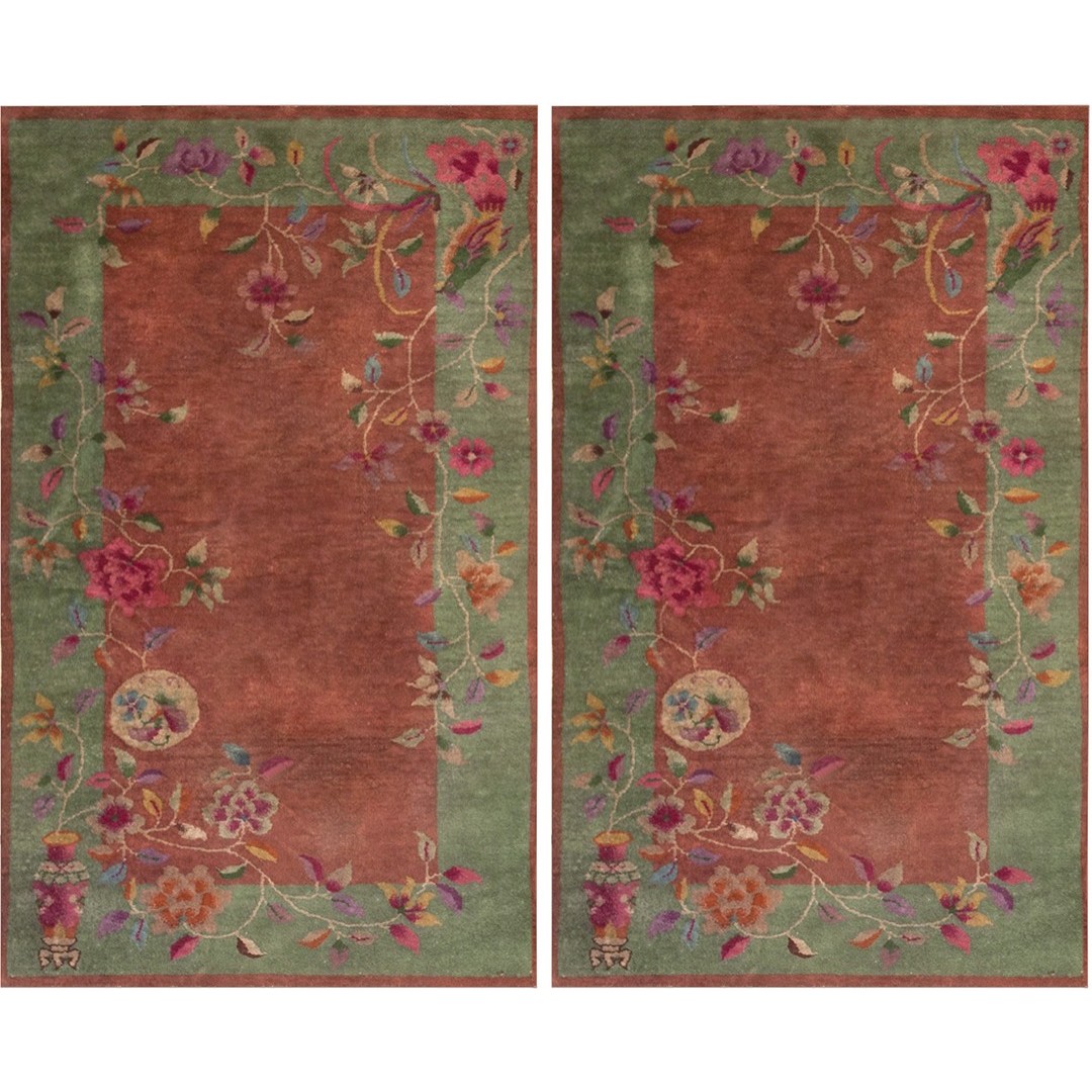 DescriptionChineseCarpets made in China proper. See entries Ningshia, Peking, Art Deco. Chinese - Art DecoAs the name implies, pieces woven between the wars for the Western market by mostly American owned firms especially Nichols and Fette, in thick heavy weaves using strong colors, asymmetric patterns and downplaying the Chinese-ness of the carpet. Nichols rugs are more strong toned than the pastel Fette. Most were woven in the coastal port city of Tientsin. Other lesser known workshops were also active. Some pieces are ultra-geometric and haute-Deco moderne in character: these are very rare. More frequent are pieces with bits of Chinese ornament: vases or other precious objects, paeonies, vines, fences, etc. Most common is the 9 x 12 size, in colors never found in mainstream Chinese rugs: backgrounds in black, mauve, purple, hot pink, orange, olive, employing the best synthetic chrome dyes of the period. Prices are still reasonable and carpets in top condition are available. | |