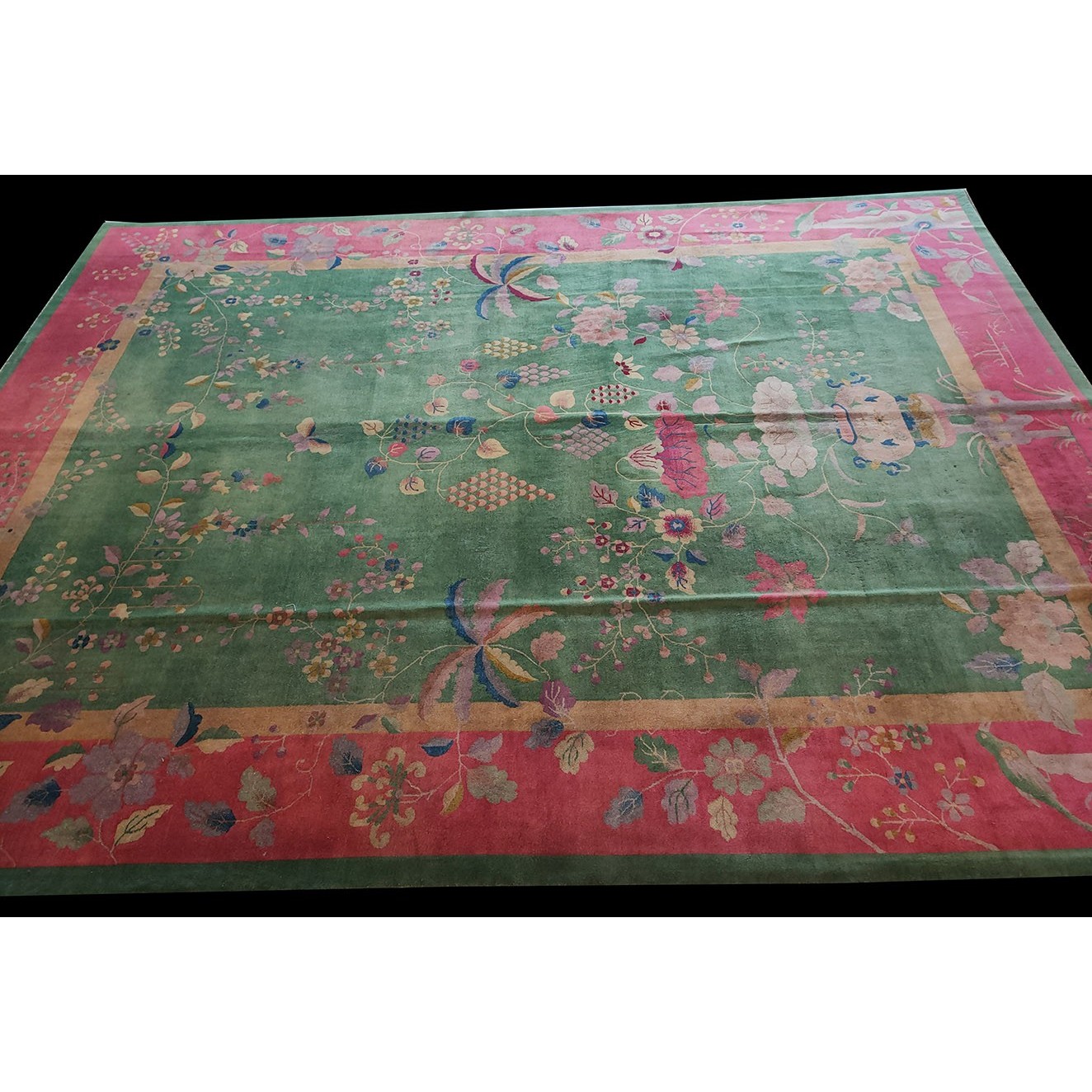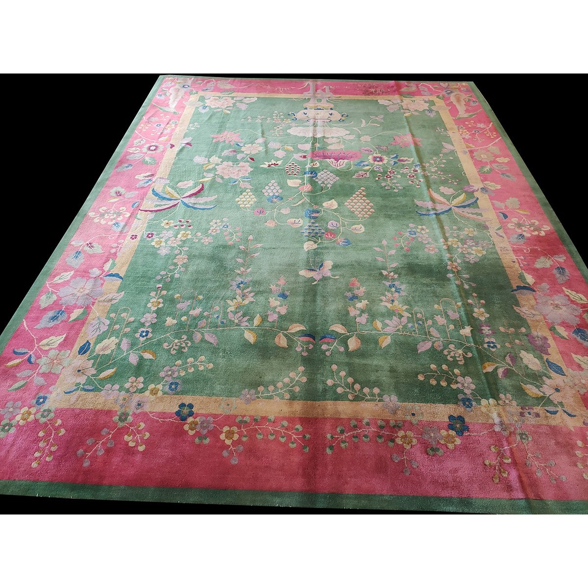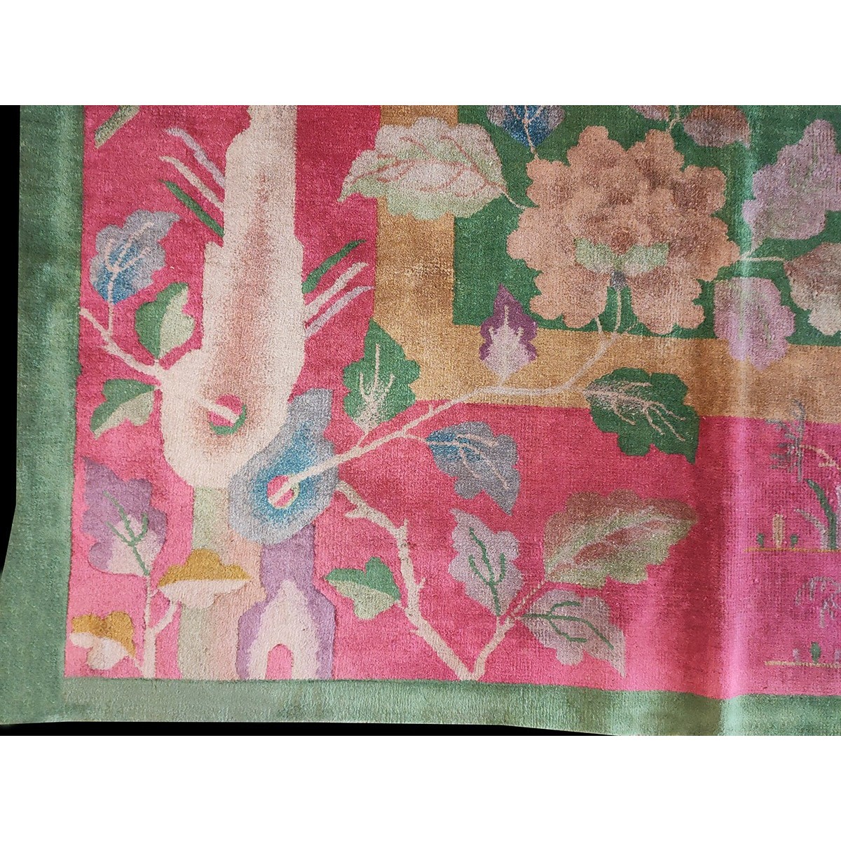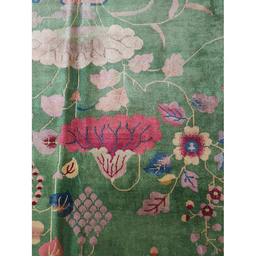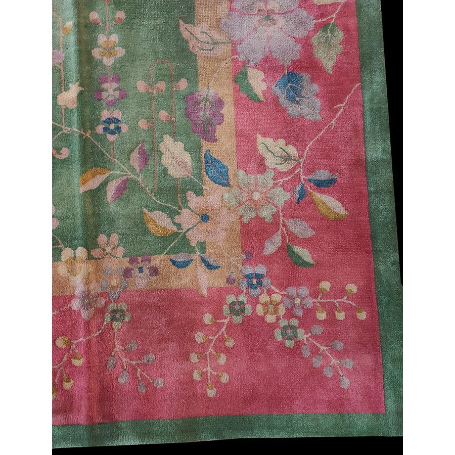DescriptionChineseCarpets made in China proper. See entries Ningshia, Peking, Art Deco. Chinese - Art DecoAs the name implies, pieces woven between the wars for the Western market by mostly American owned firms especially Nichols and Fette, in thick heavy weaves using strong colors, asymmetric patterns and downplaying the Chinese-ness of the carpet. Nichols rugs are more strong toned than the pastel Fette. Most were woven in the coastal port city of Tientsin. Other lesser known workshops were also active. Some pieces are ultra-geometric and haute-Deco moderne in character: these are very rare. More frequent are pieces with bits of Chinese ornament: vases or other precious objects, paeonies, vines, fences, etc. Most common is the 9 x 12 size, in colors never found in mainstream Chinese rugs: backgrounds in black, mauve, purple, hot pink, orange, olive, employing the best synthetic chrome dyes of the period. Prices are still reasonable and carpets in top condition are available. | |