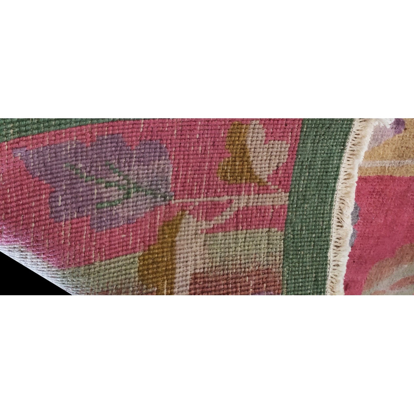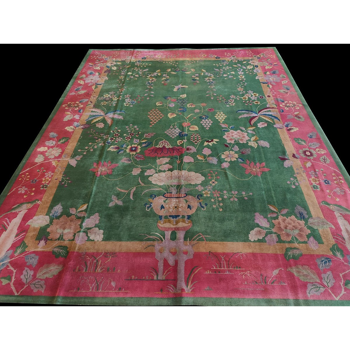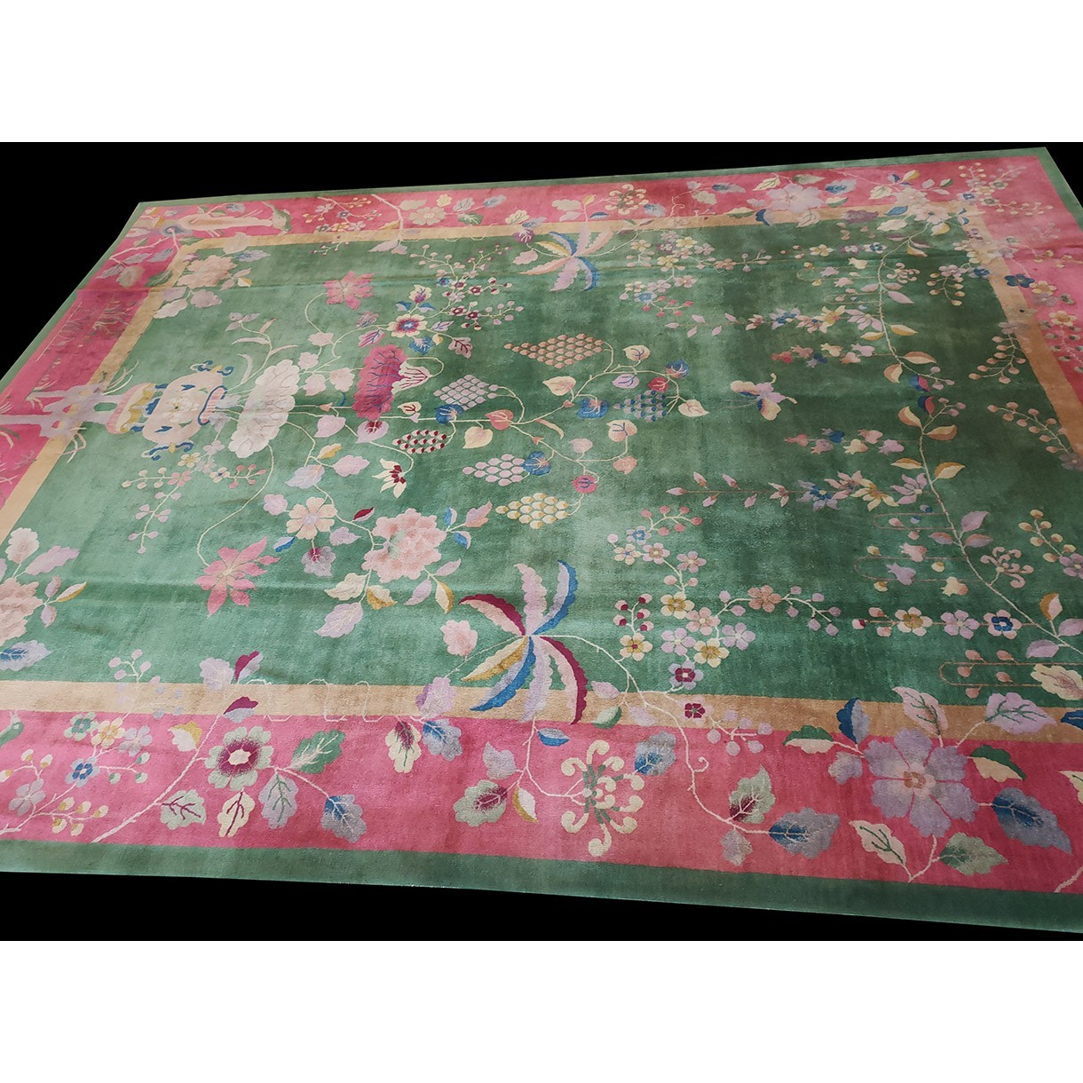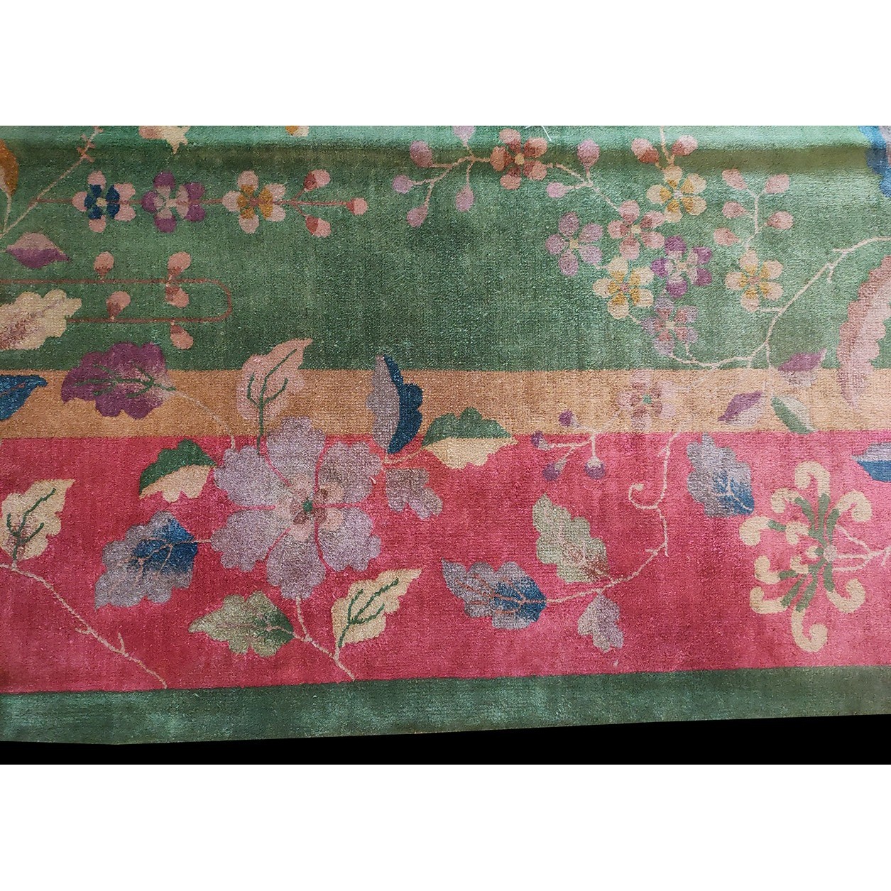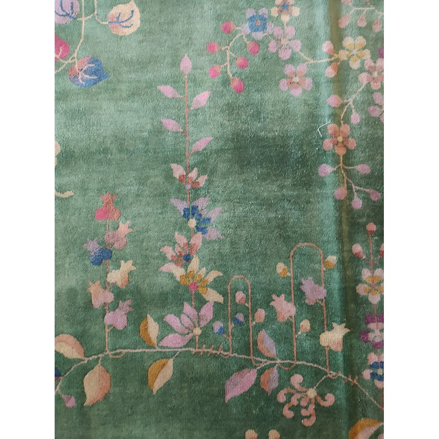 DescriptionChineseCarpets made in China proper. See entries Ningshia, Peking, Art Deco. Chinese - Art DecoAs the name implies, pieces woven between the wars for the Western market by mostly American owned firms especially Nichols and Fette, in thick heavy weaves using strong colors, asymmetric patterns and downplaying the Chinese-ness of the carpet. Nichols rugs are more strong toned than the pastel Fette. Most were woven in the coastal port city of Tientsin. Other lesser known workshops were also active. Some pieces are ultra-geometric and haute-Deco moderne in character: these are very rare. More frequent are pieces with bits of Chinese ornament: vases or other precious objects, paeonies, vines, fences, etc. Most common is the 9 x 12 size, in colors never found in mainstream Chinese rugs: backgrounds in black, mauve, purple, hot pink, orange, olive, employing the best synthetic chrome dyes of the period. Prices are still reasonable and carpets in top condition are available. | |