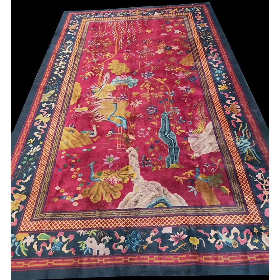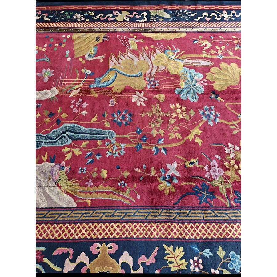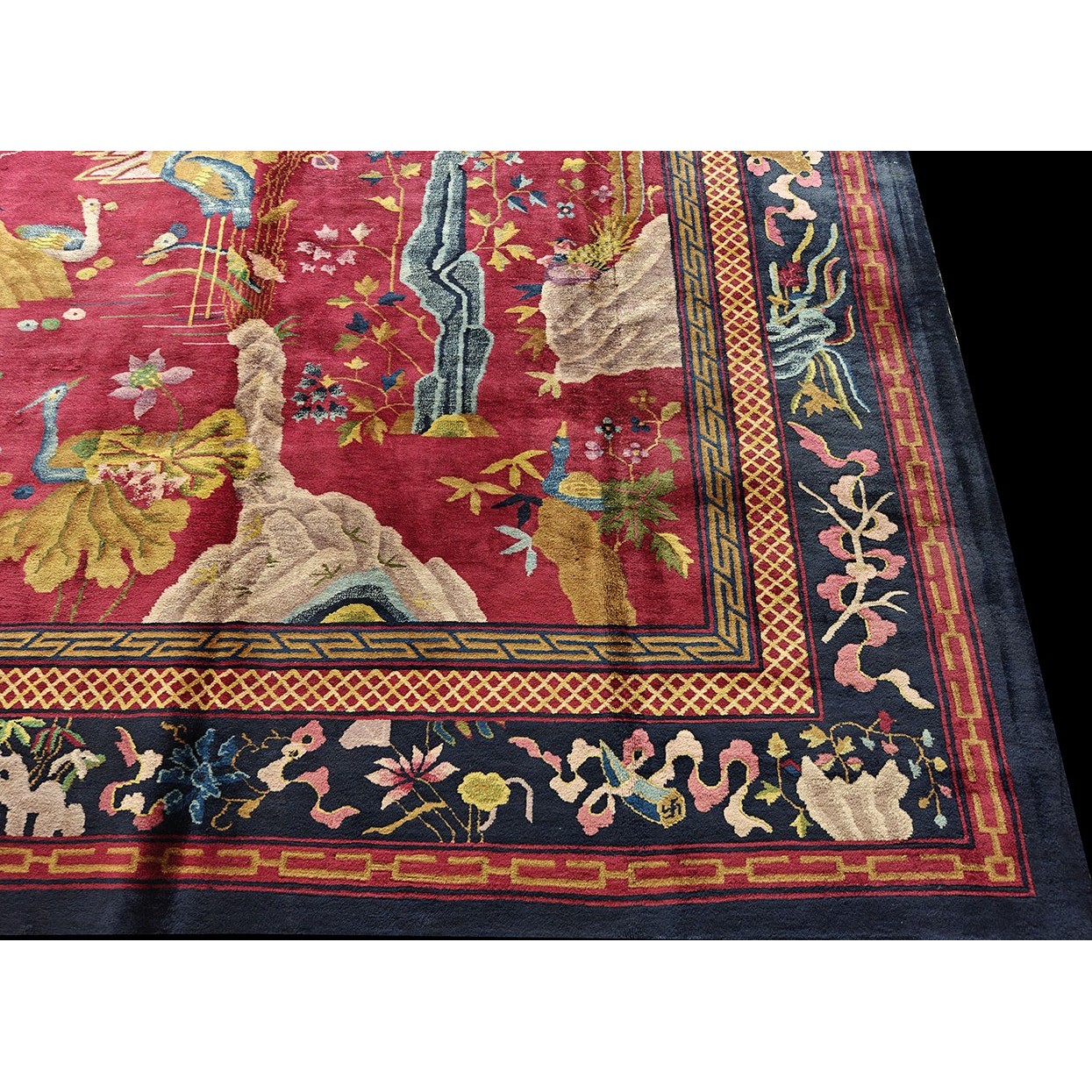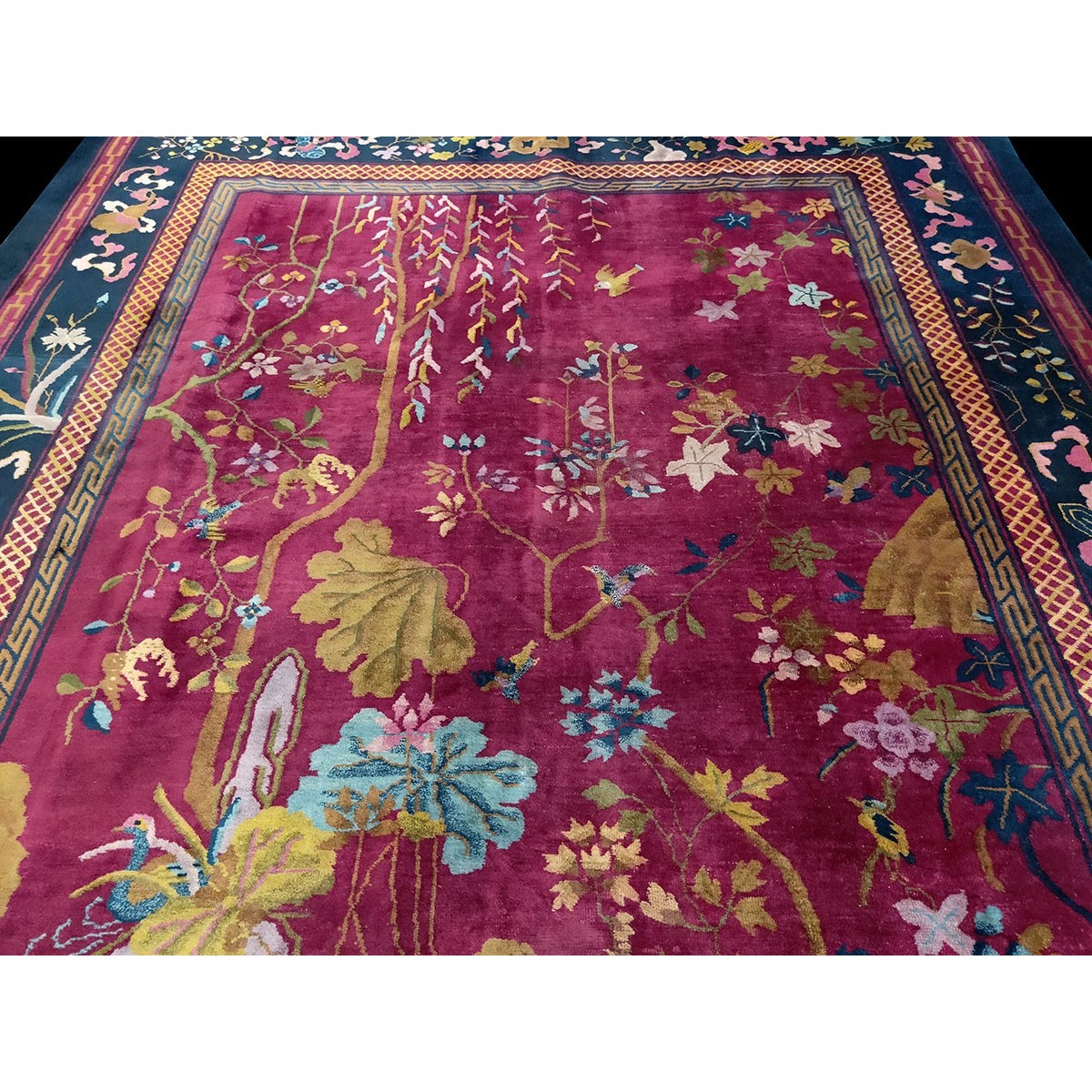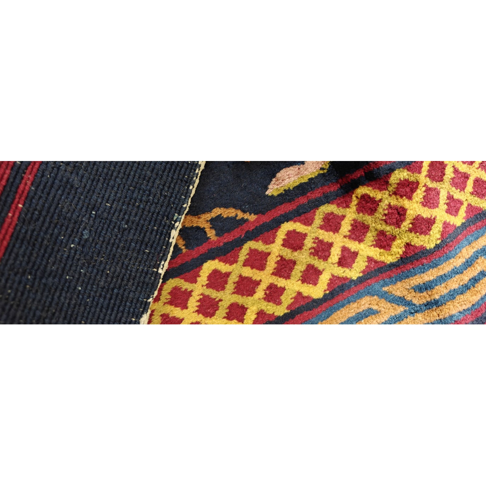 DescriptionChineseCarpets made in China proper. See entries Ningshia, Peking, Art Deco. Chinese - Art DecoAs the name implies, pieces woven between the wars for the Western market by mostly American owned firms especially Nichols and Fette, in thick heavy weaves using strong colors, asymmetric patterns and downplaying the Chinese-ness of the carpet. Nichols rugs are more strong toned than the pastel Fette. Most were woven in the coastal port city of Tientsin. Other lesser known workshops were also active. Some pieces are ultra-geometric and haute-Deco moderne in character: these are very rare. More frequent are pieces with bits of Chinese ornament: vases or other precious objects, paeonies, vines, fences, etc. Most common is the 9 x 12 size, in colors never found in mainstream Chinese rugs: backgrounds in black, mauve, purple, hot pink, orange, olive, employing the best synthetic chrome dyes of the period. Prices are still reasonable and carpets in top condition are available. | |