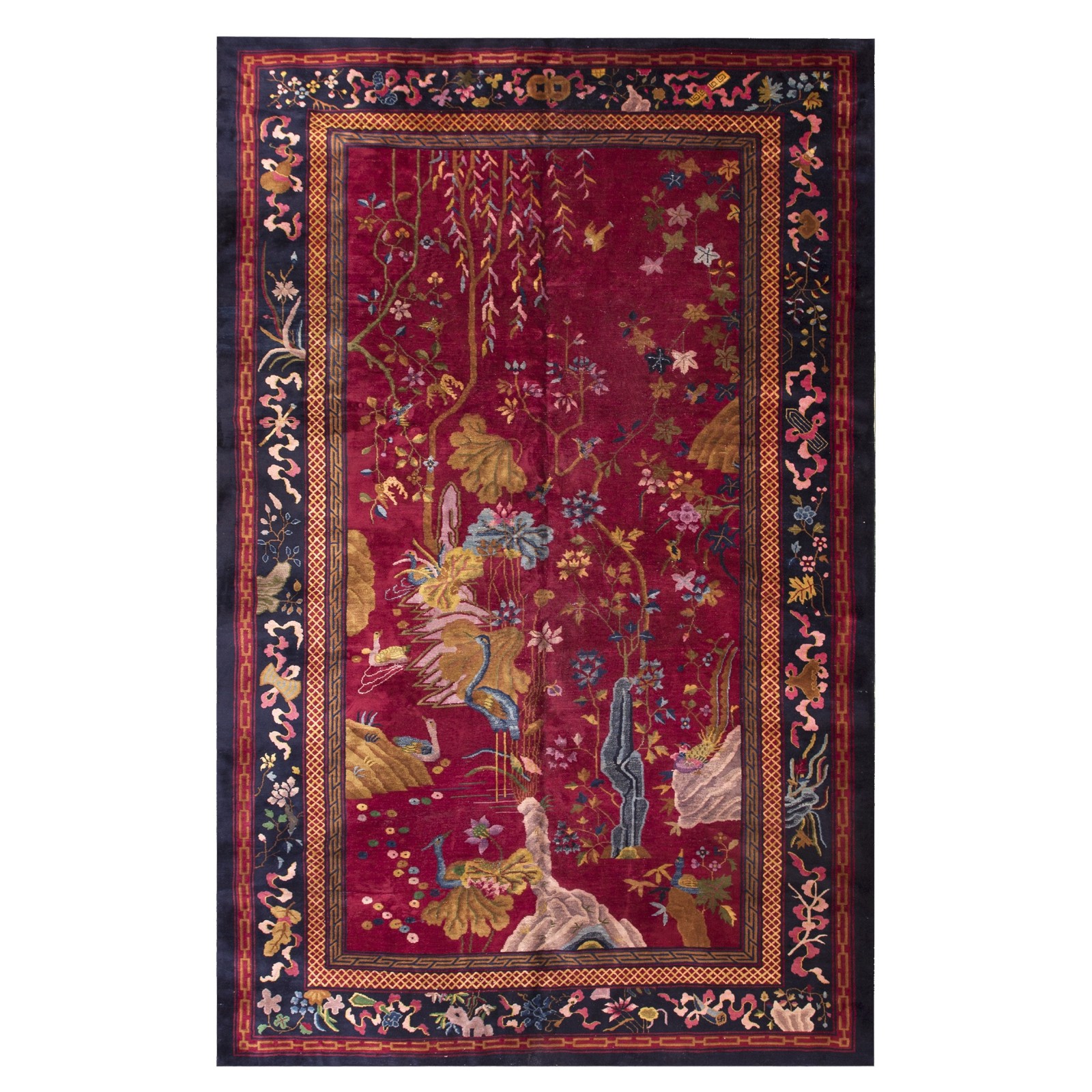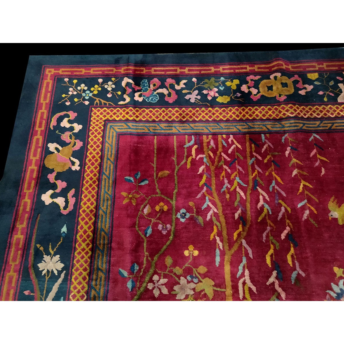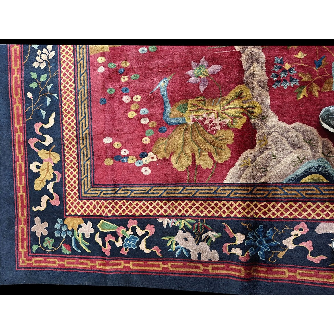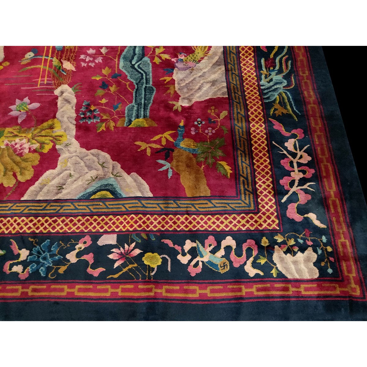 DescriptionChineseCarpets made in China proper. See entries Ningshia, Peking, Art Deco. Chinese - Art DecoAs the name implies, pieces woven between the wars for the Western market by mostly American owned firms especially Nichols and Fette, in thick heavy weaves using strong colors, asymmetric patterns and downplaying the Chinese-ness of the carpet. Nichols rugs are more strong toned than the pastel Fette. Most were woven in the coastal port city of Tientsin. Other lesser known workshops were also active. Some pieces are ultra-geometric and haute-Deco moderne in character: these are very rare. More frequent are pieces with bits of Chinese ornament: vases or other precious objects, paeonies, vines, fences, etc. Most common is the 9 x 12 size, in colors never found in mainstream Chinese rugs: backgrounds in black, mauve, purple, hot pink, orange, olive, employing the best synthetic chrome dyes of the period. Prices are still reasonable and carpets in top condition are available. | |